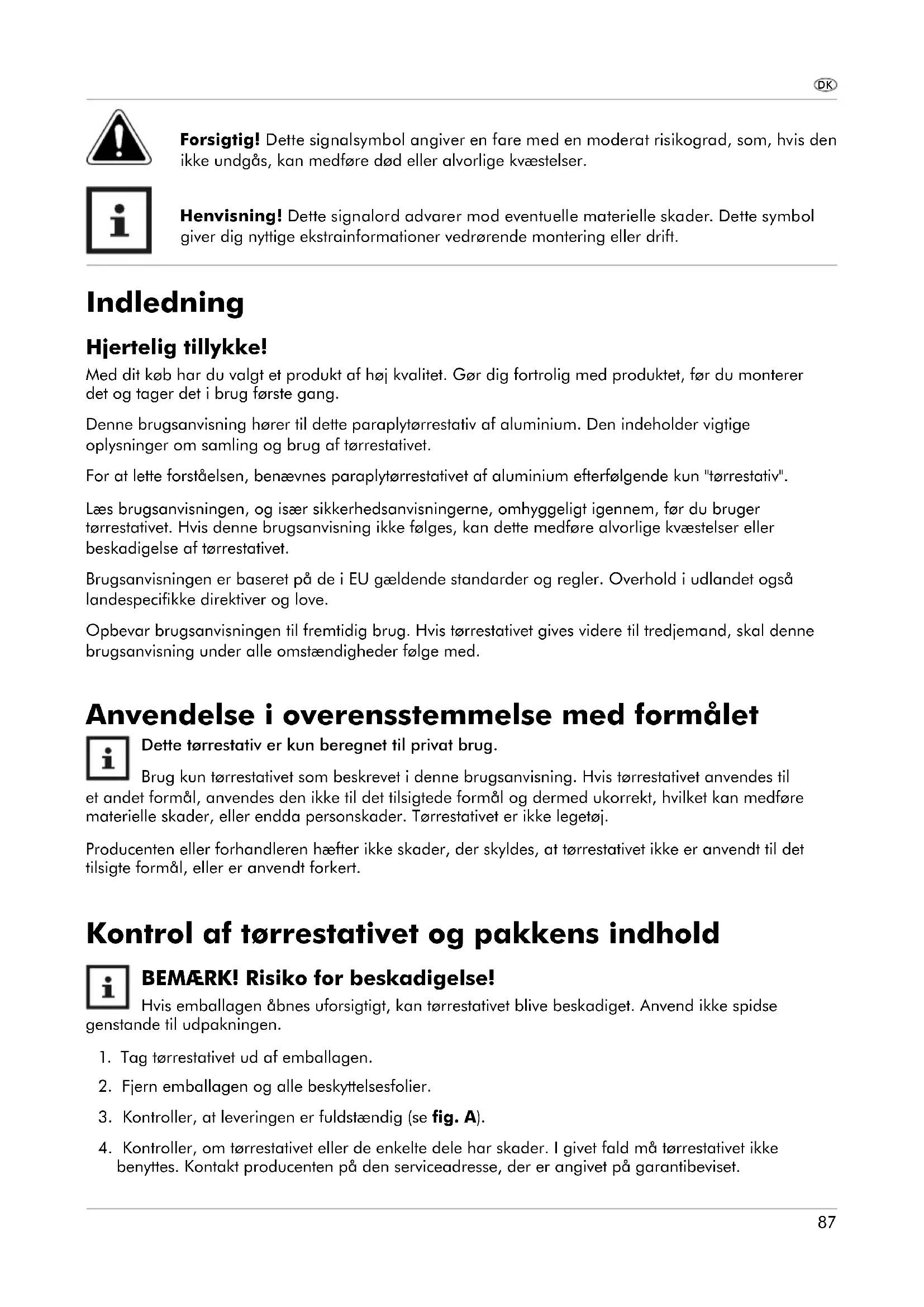 Dette tørrestativ er kun beregnet til privat brug. Brug kun tørrestativet som beskrevet i denne brugsanvisning. Hvis tørrestativet anvendes til et andet formål, anvendes den ikke til det tilsigtede formål og dermed ukorrekt, hvilket kan medføre materielle skader, eller endda personskader. Tørrestativet er ikke legetøj. Producenten eller forhandleren hæfter ikke skader, der skyldes, at tørrestativet ikke er anvendt til det tilsigte formål, eller er anvendt forkert. Kontrol af tørrestativet og pakkens indhold