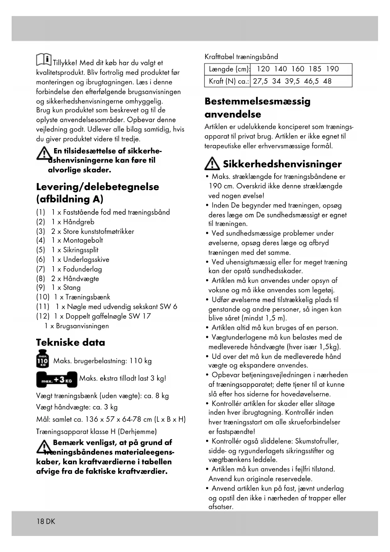 Maks. brugerbelastning: 110 kg Maks. ekstra tilladt last 3 kg! Vægt træningsbænk (uden vægte): ca. 8 kg Vægt håndvægte: ca. 3 kg Mål: samlet ca. 136 x 57 x 64-78 cm (L x B x H) Træningsapparat klasse H (Derhjemme) Bemærk venligst, at på grund af træningsbåndenes materialeegens- kaber, kan kraftværdierne i tabellen afvige fra de faktiske kraftværdier. Krafttabel træningsbånd Længde (cm): 120 140 160 185 190 Kraft (N) ca.: 27,5 34 39,5 46,5 48 Bestemmelsesmæssig anvendelse Artiklen er udelukkende konciperet som trænings- apparat til privat brug. Artiklen er ikke egnet til terapeutiske eller erhvervsmæssige formål. Sikkerhedshenvisninger