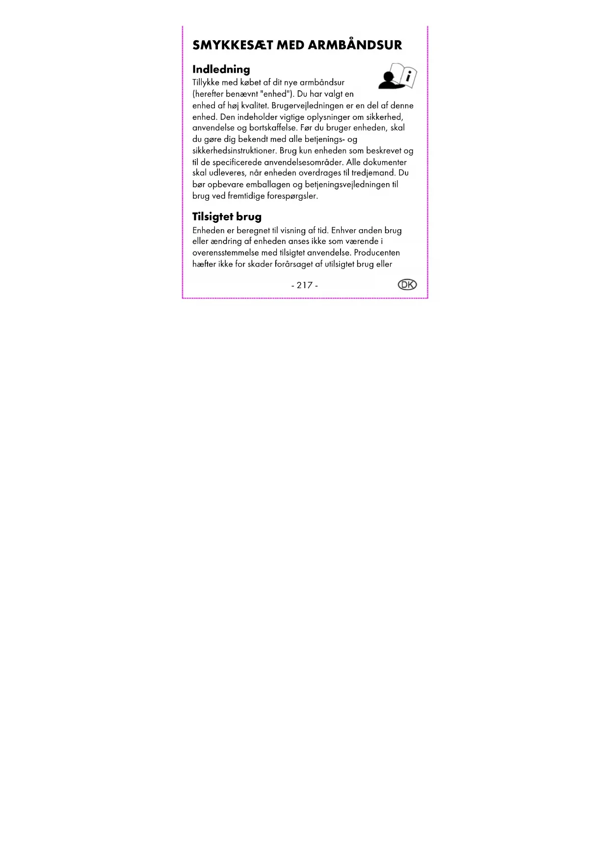 Indledning Tillykke med købet af dit nye armbåndsur (herefter benævnt "enhed"). Du har valgt en enhed af høj kvalitet. Brugervejledningen er en del af denne enhed. Den indeholder vigtige oplysninger om sikkerhed, anvendelse og bortskaffelse. Før du bruger enheden, skal du gøre dig bekendt med alle betjenings- og sikkerhedsinstruktioner. Brug kun enheden som beskrevet og til de specificerede anvendelsesområder. Alle dokumenter skal udleveres, når enheden overdrages til tredjemand. Du bør opbevare emballagen og betjeningsvejledningen til brug ved fremtidige forespørgsler. Tilsigtet brug Enheden er beregnet til visning af tid. Enhver anden brug eller ændring af enheden anses ikke som værende i overensstemmelse med tilsigtet anvendelse. Producenten hæfter ikke for skader forårsaget af utilsigtet brug eller- 218 - forkert betjening. Enheden er ikke beregnet til kommerciel brug. Leveringens omfang Henvisning: Kontroller venligst leveringens omfang efter købet. Vær sikker på, at alle dele er forhånden og at de ikke er defekt. 1 x Armbåndsur inkl. batteri 3 x Smykkearmbånd for modellen: 1 2 x Smykkearmbånd for modellen: 2 1 x Smykkearmbånd for modellerne: 3 + 4 1 x Brugervejledning Tekniske data Kvartsværk Knapbatteri: 1,55 V, SR626SW- 219 - Symbolforklaring