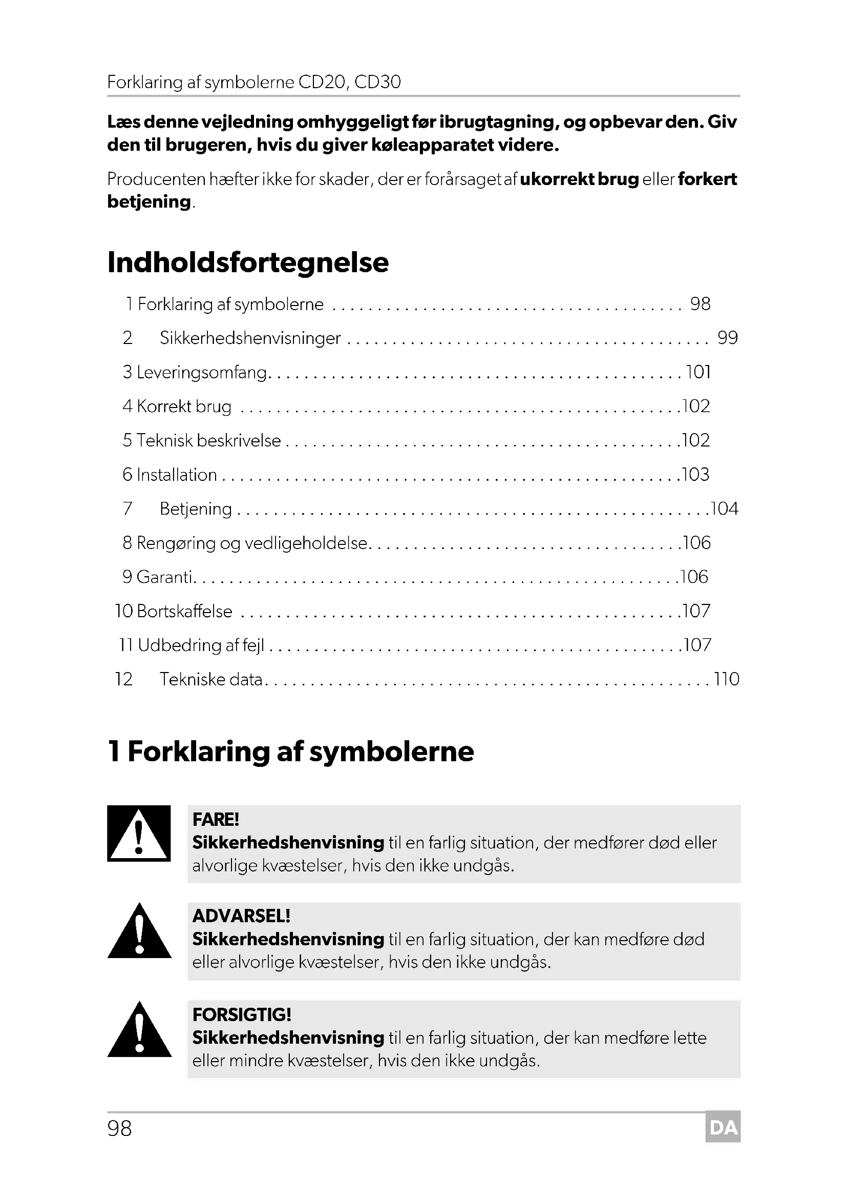 Børn i alderen fra 3 til 8 år må fylde og tømme køleapparater. VIGTIGT! Henvisning til en situation, der kan medføre materielle skader, hvis den ikke undgås. BEMÆRK Supplerende informationer om betjening af produktet. CD20-30-IO-16s.book Seite 99 Montag, 18. Mai 2020 2:25 14DA Sikkerhedshenvisninger CD20, CD30