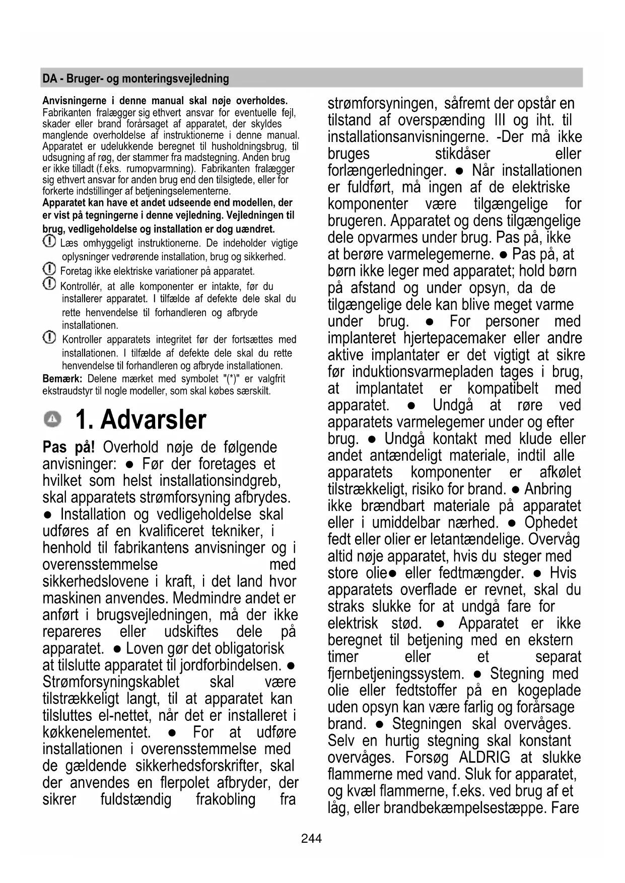 Pas på! Overhold nøje de følgende anvisninger: ● Før der foretages et hvilket som helst installationsindgreb, skal apparatets strømforsyning afbrydes. ● Installation og vedligeholdelse skal udføres af en kvalificeret tekniker, i henhold til fabrikantens anvisninger og i overensstemmelse med sikkerhedslovene i kraft, i det land hvor maskinen anvendes. Medmindre andet er anført i brugsvejledningen, må der ikke repareres eller udskiftes dele på apparatet. ● Loven gør det obligatorisk at tilslutte apparatet til jordforbindelsen. ● Strømforsyningskablet skal være tilstrækkeligt langt, til at apparatet kan tilsluttes el-nettet, når det er installeret i køkkenelementet. ● For at udføre installationen i overensstemmelse med de gældende sikkerhedsforskrifter, skal der anvendes en flerpolet afbryder, der sikrer fuldstændig frakobling fra strømforsyningen, såfremt der opstår en tilstand af overspænding III og iht. til installationsanvisningerne. -Der må ikke bruges stikdåser eller forlængerledninger. ● Når installationen er fuldført, må ingen af de elektriske komponenter være tilgængelige for brugeren. Apparatet og dens tilgængelige dele opvarmes under brug. Pas på, ikke at berøre varmelegemerne. ● Pas på, at børn ikke leger med apparatet; hold børn på afstand og under opsyn, da de tilgængelige dele kan blive meget varme under brug. ● For personer med implanteret hjertepacemaker eller andre aktive implantater er det vigtigt at sikre før induktionsvarmepladen tages i brug, at implantatet er kompatibelt med apparatet. ● Undgå at røre ved apparatets varmelegemer under og efter brug. ● Undgå kontakt med klude eller andet antændeligt materiale, indtil alle apparatets komponenter er afkølet tilstrækkeligt, risiko for brand. ● Anbring ikke brændbart materiale på apparatet eller i umiddelbar nærhed. ● Ophedet fedt eller olier er letantændelige. Overvåg altid nøje apparatet, hvis du steger med store olie● eller fedtmængder. ● Hvis apparatets overflade er revnet, skal du straks slukke for at undgå fare for elektrisk stød. ● Apparatet er ikke beregnet til betjening med en ekstern timer eller et separat fjernbetjeningssystem. ● Stegning med olie eller fedtstoffer på en kogeplade uden opsyn kan være farlig og forårsage brand. ● Stegningen skal overvåges. Selv en hurtig stegning skal konstant overvåges. Forsøg ALDRIG at slukke flammerne med vand. Sluk for apparatet, og kvæl flammerne, f.eks. ved brug af et låg, eller brandbekæmpelsestæppe. Fare245 for brand: Sæt ikke genstande på kogepladerne. ● Brug ikke damprensere, risiko for elektrisk stød. Læg ikke metalgenstande som knive, gafler, skeer og låg på kogepladens overflade, da de kan overophedes. ● Før apparatet tilsluttes strømforsyningen: Kontrollér typeskiltet (placeret nederst på apparatet) for at sikre, at den oplyste spænding og strøm svarer til strømforsyningen, og at stikkontakten er egnet. I tvivlstilfælde bør du rette henvendelse til en kvalificeret elektriker. Vigtigt: ● Efter brug skal kogepladen slukkes med betjeningselementerne. Stol ikke på grydedetektoren alene. ● Undgå at væsker koger over. Reducér varmen, når du koger eller opvarmer væsker. ● Lad ikke kogepladerne være tændt med tomme gryder og pander eller uden. ● Sluk for kogezonen, når tilberedningen er afsluttet. ● Brug aldrig aluminiumsfolie til madlavning, og anbring aldrig produkter pakket med aluminium direkte på kogepladen. Alluminumfolien kan smelte og forårsage uoprettelige skader på apparatet. ● Du må aldrig varme dåser med mad op uden først at åbne dem: De kan eksplodere! Denne advarsel gælder for alle de andre typer kogeplader. Brug af høj effekt som Booster-funktionen er ikke egnet til opvarmning af visse væsker som f.eks. olie til friturestegning. En overdreven varme kan være farlig. I dette tilfælde anbefales det at anvende en lavere effekt. Beholderne skal anbringes direkte på kogepladen og centreres. Anbring aldrig andre genstande mellem gryden og kogepladen. ● Ved meget høje temperaturer sænker apparatet automatisk effektniveauet på de pågældende kogezoner. ● Før rengøring eller vedligeholdelse slukkes for apparatet og frakobl strømforsyningen ved at fjerne stikket eller afbryde hovedafbryderen i hjemmet. ● Til alle installations● og vedligeholdelsesindgreb anvend arbejdshandsker. ● Børn over 8 år og personer med nedsatte fysiske, sensoriske eller mentale evner eller uden den nødvendige erfaring og viden må kun bruge apparatet, hvis de er under opsyn eller forinden har modtaget instruktioner i sikker brug af apparatet og har forstået farerne, som brugen af apparatet indebærer. ● Det er nødvendigt at holde øje med, at børn ikke leger med apparatet. ● Rengøring og vedligeholdelse må ikke udføres af børn uden opsyn. ● Rummet skal have tilstrækkelig ventilation, når apparatet bruges på samme tid som andre gas● eller andre brændstofforbrændingsapparater. ● Apparatet skal rengøres hyppigt både indvendigt og udvendigt (MINDST ÉN GANG OM MÅNEDEN), under alle omstændigheder skal det overholdes, hvad der udtrykkeligt er angivet i vedligeholdelsesinstruktionerne. ● Manglende overholdelse af reglerne for rengøring af apparatet og udskiftning og rengøring af filtre medfører brandfare. ● Madlavning med flambé er strengt forbudt. ● Brug af åben ild er skadeligt for filtrene og kan forårsage brand og skal derfor altid undgås. ● Friturestegning må kun udføres under opsyn for at undgå, at den overophedede olie bryder i brand. ● ADVARSEL: Når kogepladen er i brug, kan apparatets tilgængelige dele blive meget varme. ● Advarsel! Tilslut ikke apparatet til strømforsyningen, før installationen er gennemført. ● Overhold nøje lokale bestemmelser med hensyn til de tekniske og sikkerhedsmæssige forholdsregler, der skal træffes ved udledning af røgen.246 ● Den udsugede
