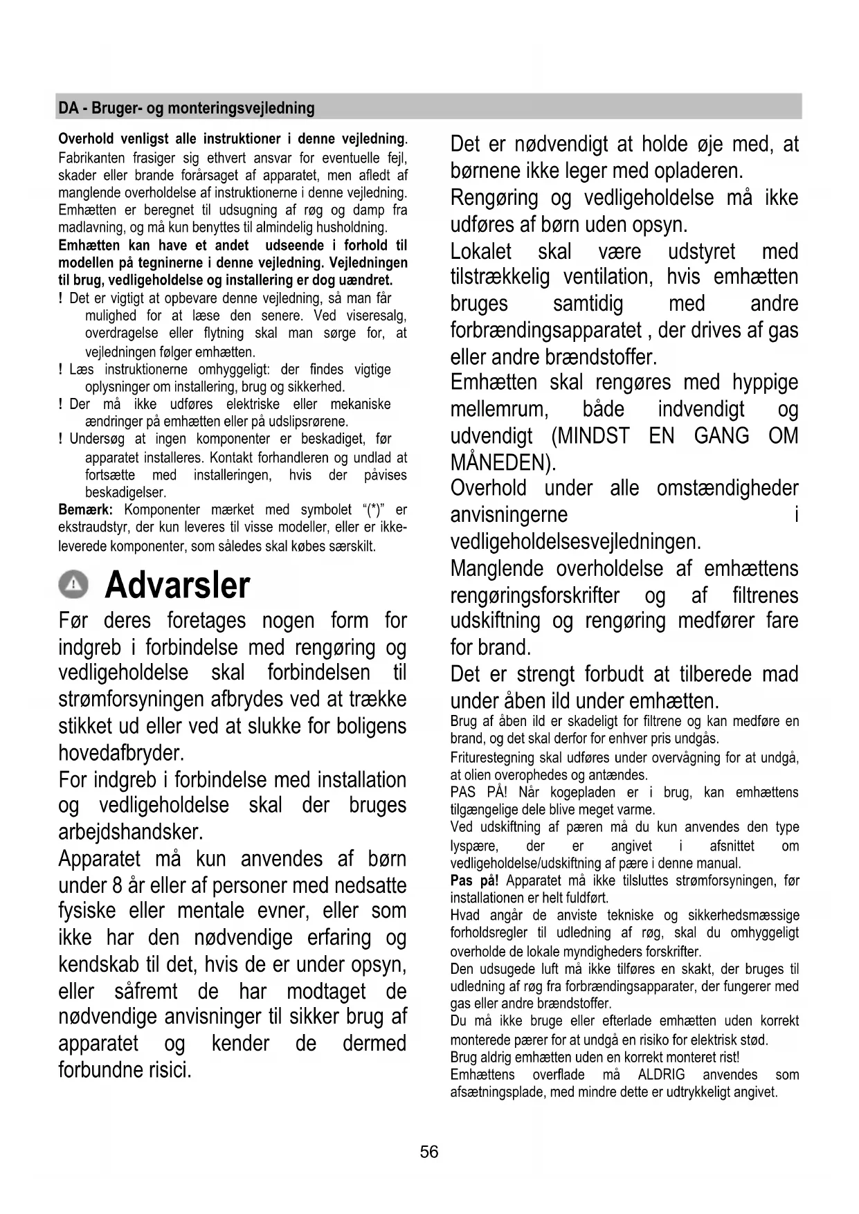 Dersom belysningen ikke skulle virke, kontroller at lyspærene er satt korrekt på plass før du henvender deg til teknisk assistanse. - Modell med LED pærer Ventilatoren er utstyrt med et belysningssystem basert på LED-teknologi. LED-lysene garanterer optimal belysning, har opptil 10 ganger lengre varighet enn tradisjonelle lyspærer og tillater en strømsparing på 90 %. Henvend deg til teknisk service når LED-pærene skal skiftes ut.56 DA - Bruger- og monteringsvejledning Overhold venligst alle instruktioner i denne vejledning. Fabrikanten frasiger sig ethvert ansvar for eventuelle fejl, skader eller brande forårsaget af apparatet, men afledt af manglende overholdelse af instruktionerne i denne vejledning. Emhætten er beregnet til udsugning af røg og damp fra madlavning, og må kun benyttes til almindelig husholdning. Emhætten kan have et andet udseende i forhold til modellen på tegninerne i denne vejledning. Vejledningen til brug, vedligeholdelse og installering er dog uændret. ! Det er vigtigt at opbevare denne vejledning, så man får mulighed for at læse den senere. Ved viseresalg, overdragelse eller flytning skal man sørge for, at vejledningen følger emhætten. ! Læs instruktionerne omhyggeligt: der findes vigtige oplysninger om installering, brug og sikkerhed. ! Der må ikke udføres elektriske eller mekaniske ændringer på emhætten eller på udslipsrørene. ! Undersøg at ingen komponenter er beskadiget, før apparatet installeres. Kontakt forhandleren og undlad at fortsætte med installeringen, hvis der påvises beskadigelser. Bemærk: Komponenter mærket med symbolet “(*)” er ekstraudstyr, der kun leveres til visse modeller, eller er ikke- leverede komponenter, som således skal købes særskilt. Advarsler Før deres foretages nogen form for indgreb i forbindelse med rengøring og vedligeholdelse skal forbindelsen til strømforsyningen afbrydes ved at trække stikket ud eller ved at slukke for boligens hovedafbryder. For indgreb i forbindelse med installation og vedligeholdelse skal der bruges arbejdshandsker. Apparatet må kun anvendes af børn under 8 år eller af personer med nedsatte fysiske eller mentale evner, eller som ikke har den nødvendige erfaring og kendskab til det, hvis de er under opsyn, eller såfremt de har modtaget de nødvendige anvisninger til sikker brug af apparatet og kender de dermed forbundne risici. Det er nødvendigt at holde øje med, at børnene ikke leger med opladeren. Rengøring og vedligeholdelse må ikke udføres af børn uden opsyn. Lokalet skal være udstyret med tilstrækkelig ventilation, hvis emhætten bruges samtidig med andre forbrændingsapparatet , der drives af gas eller andre brændstoffer. Emhætten skal rengøres med hyppige mellemrum, både indvendigt og udvendigt (MINDST EN GANG OM MÅNEDEN). Overhold under alle omstændigheder anvisningerne i vedligeholdelsesvejledningen. Manglende overholdelse af emhættens rengøringsforskrifter og af filtrenes udskiftning og rengøring medfører fare for brand. Det er strengt forbudt at tilberede mad under åben ild under emhætten. Brug af åben ild er skadeligt for filtrene og kan medføre en brand, og det skal derfor for enhver pris undgås. Friturestegning skal udføres under overvågning for at undgå, at olien overophedes og antændes. PAS PÅ! Når kogepladen er i brug, kan emhættens tilgængelige dele blive meget varme. Ved udskiftning af pæren må du kun anvendes den type lyspære, der er angivet i afsnittet om vedligeholdelse/udskiftning af pære i denne manual. Pas på! Apparatet må ikke tilsluttes strømforsyningen, før installationen er helt fuldført. Hvad angår de anviste tekniske og sikkerhedsmæssige forholdsregler til udledning af røg, skal du omhyggeligt overholde de lokale myndigheders forskrifter. Den udsugede luft må ikke tilføres en skakt, der bruges til udledning af røg fra forbrændingsapparater, der fungerer med gas eller andre brændstoffer. Du må ikke bruge eller efterlade emhætten uden korrekt monterede pærer for at undgå en risiko for elektrisk stød. Brug aldrig emhætten uden en korrekt monteret rist! Emhættens overflade må ALDRIG anvendes som afsætningsplade, med mindre dette er udtrykkeligt angivet.57 Brug kun de medfølgende fastspændingsskruer til produktet i forbindelse med installationen eller – såfremt de ikke medfølger – skal du indkøbe den korrekte type skruer. Brug skruer af korrekt længde, som anført i installationsvejledningen. I tvivlstilfælde bør du kontakte dit autoriserede servicecenter eller en kvalificeret tekniker. PAS PÅ! Hvis der ikke monteres de skruer og fastspændingsanordninger som angivet i disse anvisninger, kan der opstå risiko for elektriske problemer. Dette apparat er mærket i overensstemmelse med det Europæiske Direktiv 2012/19/EC, Waste Electrical and Electronic Equipment (WEEE). Elektrisk og elektronisk udstyr indeholder materiale, komponenter og stoffer, der kan være skadelige for menneskers sundhed og for miljøet, hvis kasseret elektrisk og elektronisk udstyr ikke håndteres korrekt. Elektrisk og elektronisk udstyr er mærket med nedenstående overkrydsede skraldespand . Den symboliserer, at elektrisk og elektronisk udstyr ikke må bortskaffes sammen med usorteret husholdningsaffald, men indsamles særskilt. Alle kommuner har etableret indsamlingsordninger, hvor elektrisk og elektronisk udstyr gratis kan afleveres af borgerne på genbrugsstationer og andre indsamlingssteder eller bliver afhentet direkte fra husholdningerne. Nærmere information kan fås hos kommunens tekniske forvaltning. Produktet er designet, testet og produceret i henhold til:
