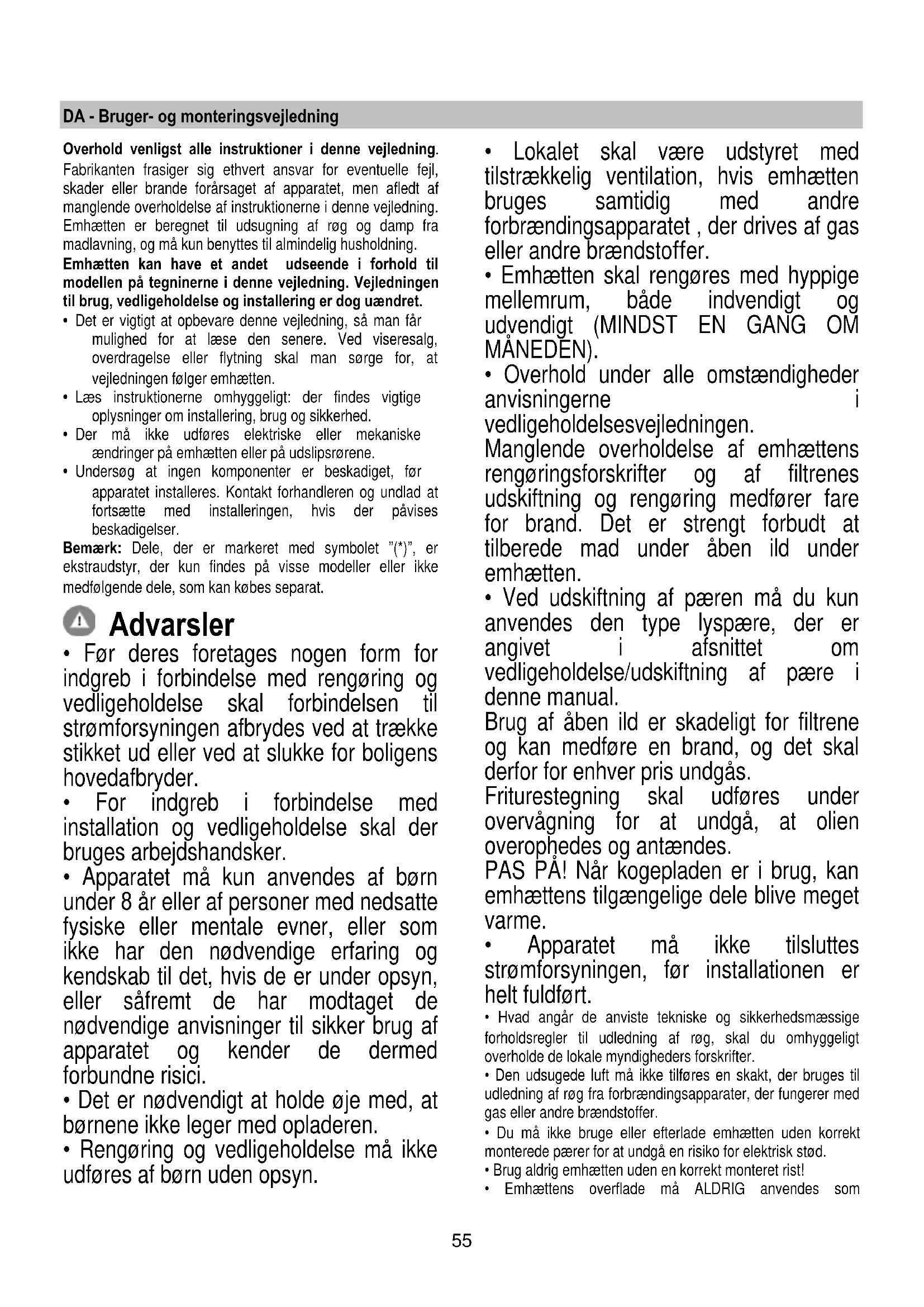- Overhold under alle omstændigheder anvisningerne i vedligeholdelsesvejledningen. Manglende overholdelse af emhættens rengøringsforskrifter og af filtrenes udskiftning og rengøring medfører fare for brand. Det er strengt forbudt at tilberede mad under åben ild under emhætten.