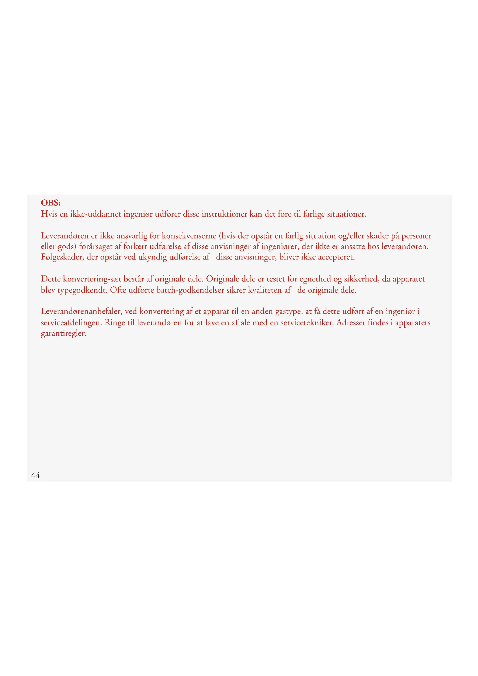 OBS: Hvis en ikke-uddannet ingeniør udfører disse instruktioner kan det føre til farlige situationer. Leverandøren er ikke ansvarlig for konsekvenserne (hvis der opstår en farlig situation og/eller skader på personer eller gods) forårsaget af forkert udførelse af disse anvisninger af ingeniører, der ikke er ansatte hos leverandøren. Følgeskader, der opstår ved ukyndig udførelse af disse anvisninger, bliver ikke accepteret. Dette konvertering-sæt består af originale dele. Originale dele er testet for egnethed og sikkerhed, da apparatet blev typegodkendt. Ofte udførte batch-godkendelser sikrer kvaliteten af de originale dele. Leverandørenanbefaler, ved konvertering af et apparat til en anden gastype, at få dette udført af en ingeniør i serviceafdelingen. Ringe til leverandøren for at lave en aftale med en servicetekniker. Adresser findes i apparatets garantiregler.45 Indledning Med dette ombygningssæt kan gaskogepladen ombygges fra naturgas (G20/ G25) til propan /butangas. Før ombygningen påbegyndes skal man kontrollere, om gaskogepladen virkelig er indstillet på naturgas. Værktøj A. Rør- eller topnøgle 7 B. Skruetrækker 4 mm (bladbredde) C. Torx-20 skruetrækker D. Spidstang E. Lækagespray og/eller speciel trykmåler F. 7+10 gaffelnøgle (wok) G. Isoleringsplade til wok Bemærk: Apparatet skal efter ombygning testes for gastæthed (se kapitel 3). Følgende dele skal udskiftes: - sprøjtestykker til brænderne - sparestillingsskruer til gashanerne - tætningsringe til tætning under brænderne - skruer til fastgøring af brænderkumme/opfangsskål på brænder - 3 dataplader/etiketter med ændret gasindstilling - 3 fiberringe nedenunder wokbrænderens skruer - Brænderhoved til wok (kun til G110 og G120) - Brænderhoved til stegning (kun til G110 og G120) Værdierne for sprøjtestykkerne og sparestillingsskruerne står på etiket- terne til sættene. Bogstaverne til sættene (stort bogstav til sprøjtestykker og lille bogstav til sparestillingsskruer) svarer til bogstaverne på etiketten på bunden af apparatets underbakken. Disse værdier står også på indsprøjterne og sparestillingsskruerne. Der kan være følgende sæt: - Sæt ‘A-a’ til sparebrænder - Sæt ‘B-b’ til normalbrænder - Sæt ‘C-c’ til kraftig brænder -‘G1-g’,’G2’ og ‘G3’ sæt til wokbrænder (‘g’ for skrue til simre-indstilling) Eksempel på etiket bundskuffeEksempler på etiketsæt Sæt ‘A-a’ til sparebrænder Sæt ‘G1-g’ til wokbrænder