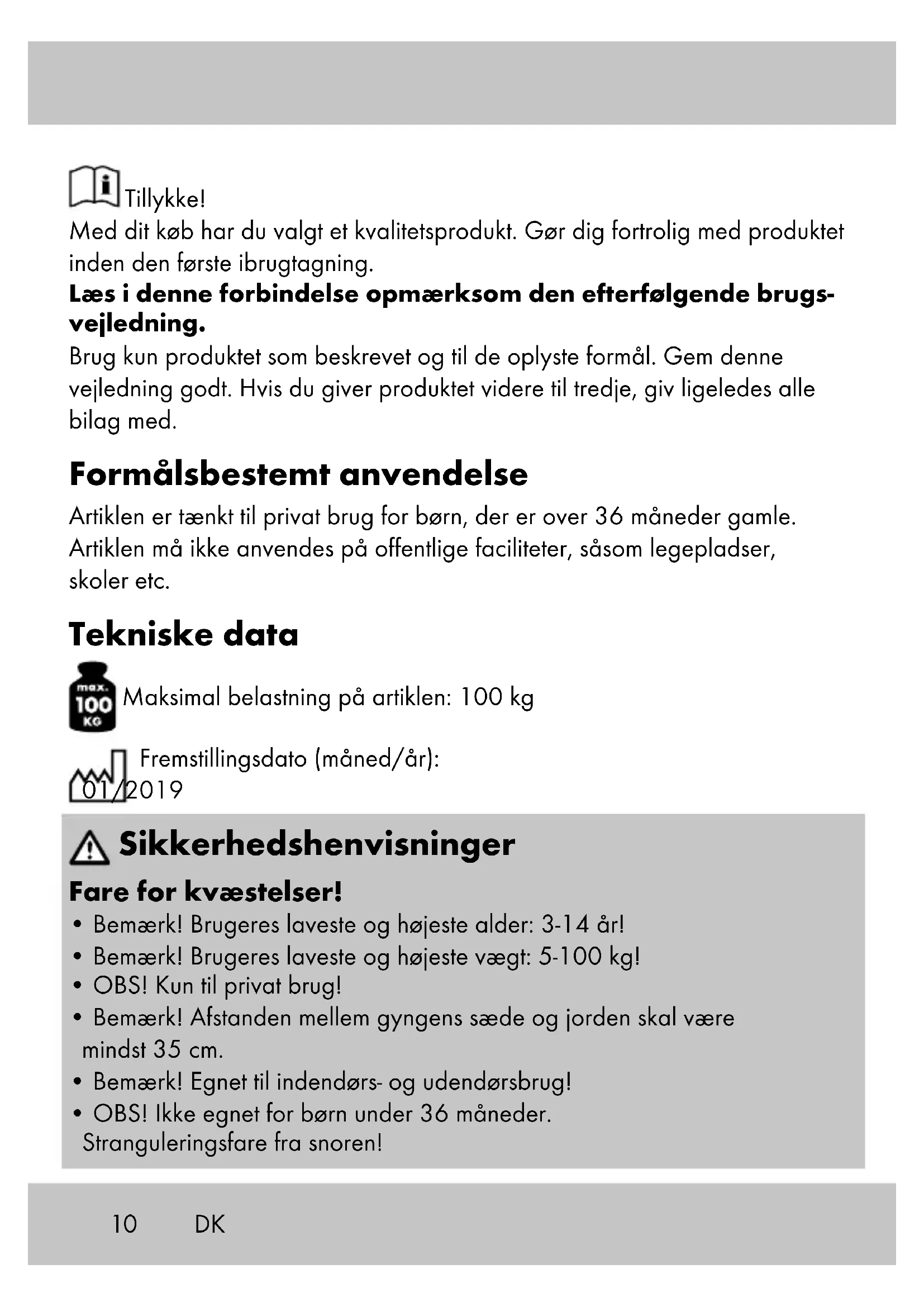 Pleje, opbevaring Glem venligst aldrig, at regelmæssig vedligeholdelse og rengøring bidrager til sikkerheden ved og bevarelse af artiklen. Artiklen skal altid opbevares ren og tør i et tempereret rum. VIGTIGT! Rengøres kun med vand, aldrig med skrappe plejeprodukter. Efterfølgende tørres af med en ren klud.15DK Henvisninger vedr. bortskaffelse Bortskaf artikel og emballage i overensstemmelse med lokalt gældende forskrifter. Emballagematerialer som f.eks. plastposer hører ikke hjemme i børnehænder. Opbevar emballagen utilgængeligt for børn. Oplysninger om garanti og servicehåndtering Produktet er fremstillet med største omhu og under vedvarende kontrol. Der ydes en garanti på tre år fra købsdatoen på dette produkt. Opbevar venligst kvitteringen fra købet. Garantien gælder kun for materiale- og fabrikationsfejl og bortfalder ved misbrug eller uhensigtsmæssig anvendelse. Deres lovpligtige rettigheder, særligt garantikrav, begrænses ikke af denne garanti. Ved eventuelle klager bedes du henvende dig til nedenstående service-hot- line eller tage kontakt til os via e-mail. Medarbejderne i vores kundetjeneste vil så aftale den videre fremgangsmåde med dig. Vi vil under alle omstændigheder rådgive dig personlig. Garantiperioden forlænges ikke ved eventuelle reparationer inden for garantien eller ved kulance. Dette gælder også for udskiftede og reparerede dele. Efter udløb af garantien er forefaldende reparationer forbundet med omkostninger. IAN: 307533 Service Danmark Tel.: 32 710005 E-Mail: deltasport@lidl.dk16 Félicitations ! Vous avez acquis un produit de haute qualité. Apprenez à connaître le pro- duit avant sa première utilisation. Lisez pour cela attentivement la notice d’utilisation suivante. N’utilisez le produit que comme décrit et pour les zones d’application indiquées. Veuillez conserver cette notice d’utilisation. Transmettez tous les documents en cas de cession du produit à une tierce personne. Utilisation réglementaire L‘article est conçu pour être utilisé dans la sphère privée pour les enfants de plus de 36 mois. L‘article ne doit pas être utilisé dans les installations publiques comme les terrains de jeux, les écoles etc. Données techniques Charge maximale de l‘article : 100 kg Date de fabrication (mois / année) : 01/2019 Consignes de sécurité Risque de blessure !