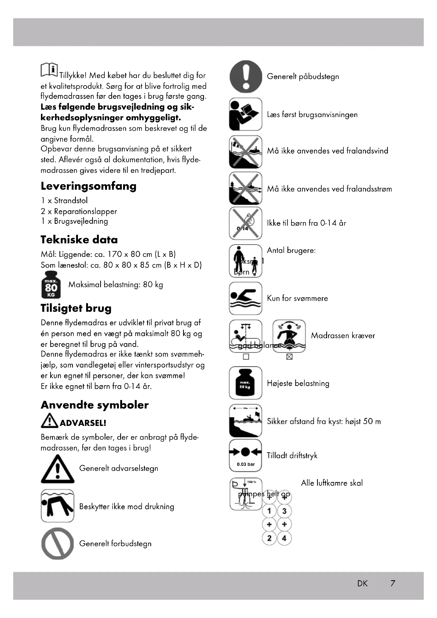 Tilladt driftstryk Alle luftkamre skal pumpes helt op Tillykke! Med købet har du besluttet dig for et kvalitetsprodukt. Sørg for at blive fortrolig med flydemadrassen før den tages i brug første gang. Læs følgende brugsvejledning og sik- kerhedsoplysninger omhyggeligt. Brug kun flydemadrassen som beskrevet og til de angivne formål. Opbevar denne brugsanvisning på et sikkert sted. Aflevér også al dokumentation, hvis flyde- madrassen gives videre til en tredjepart. Leveringsomfang 1 x Strandstol 2 x Reparationslapper 1 x Brugsvejledning Tekniske data Mål: Liggende: ca. 170 x 80 cm (L x B) Som lænestol: ca. 80 x 80 x 85 cm (B x H x D) Maksimal belastning: 80 kg Tilsigtet brug Denne flydemadras er udviklet til privat brug af én person med en vægt på maksimalt 80 kg og er beregnet til brug på vand. Denne flydemadras er ikke tænkt som svømmeh- jælp, som vandlegetøj eller vintersportsudstyr og er kun egnet til personer, der kan svømme! Er ikke egnet til børn fra 0-14 år. Anvendte symboler ADVARSEL! Bemærk de symboler, der er anbragt på flyde- madrassen, før den tages i brug! Generelt advarselstegn Beskytter ikke mod drukning Generelt forbudstegn DK8 Sikkerhedsoplysninger OBS! Ved manglende overholdelse af denne vejled- ning er der fare for at kæntre, drive væk eller drukne. En uensartet vægtfordeling på flydemadrassen fører til, at den kan tippe. ADVARSEL! Kvælningsrisiko for børn! Lad ikke børn lege med emballagematerialet eller flydemadrassen uden opsyn. ADVARSEL! LIVSFARE! Beskytter ikke mod drukning! Kun for svømmere! OBS! Ved påstigning kan luftkamrene blive trykket ned under vandoverfladen. Flydemadrassen kan derved og ved ensidig belastning vende helt rundt. Fare for skader!