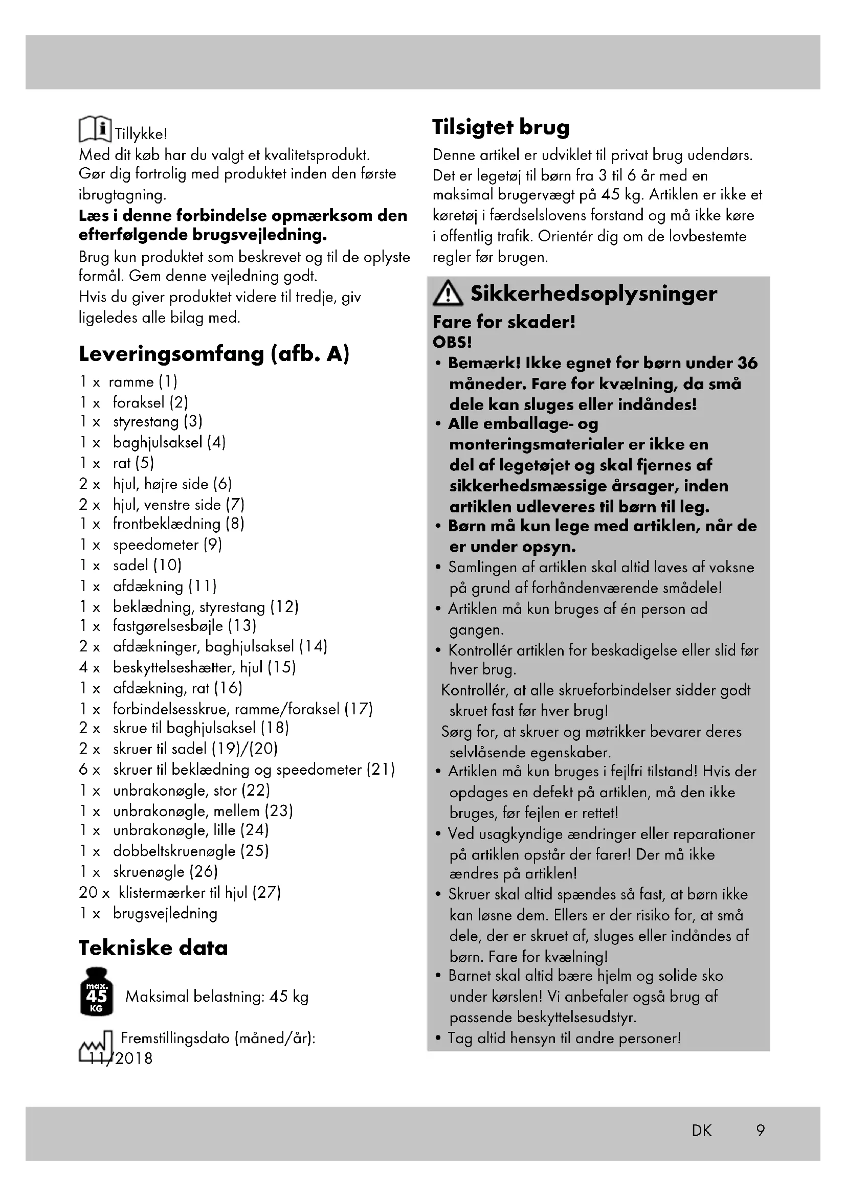 Maksimal belastning: 45 kg Fremstillingsdato (måned/år): 11/2018 Tilsigtet brug Denne artikel er udviklet til privat brug udendørs. Det er legetøj til børn fra 3 til 6 år med en maksimal brugervægt på 45 kg. Artiklen er ikke et køretøj i færdselslovens forstand og må ikke køre i offentlig trafik. Orientér dig om de lovbestemte regler før brugen. Sikkerhedsoplysninger Fare for skader! OBS!