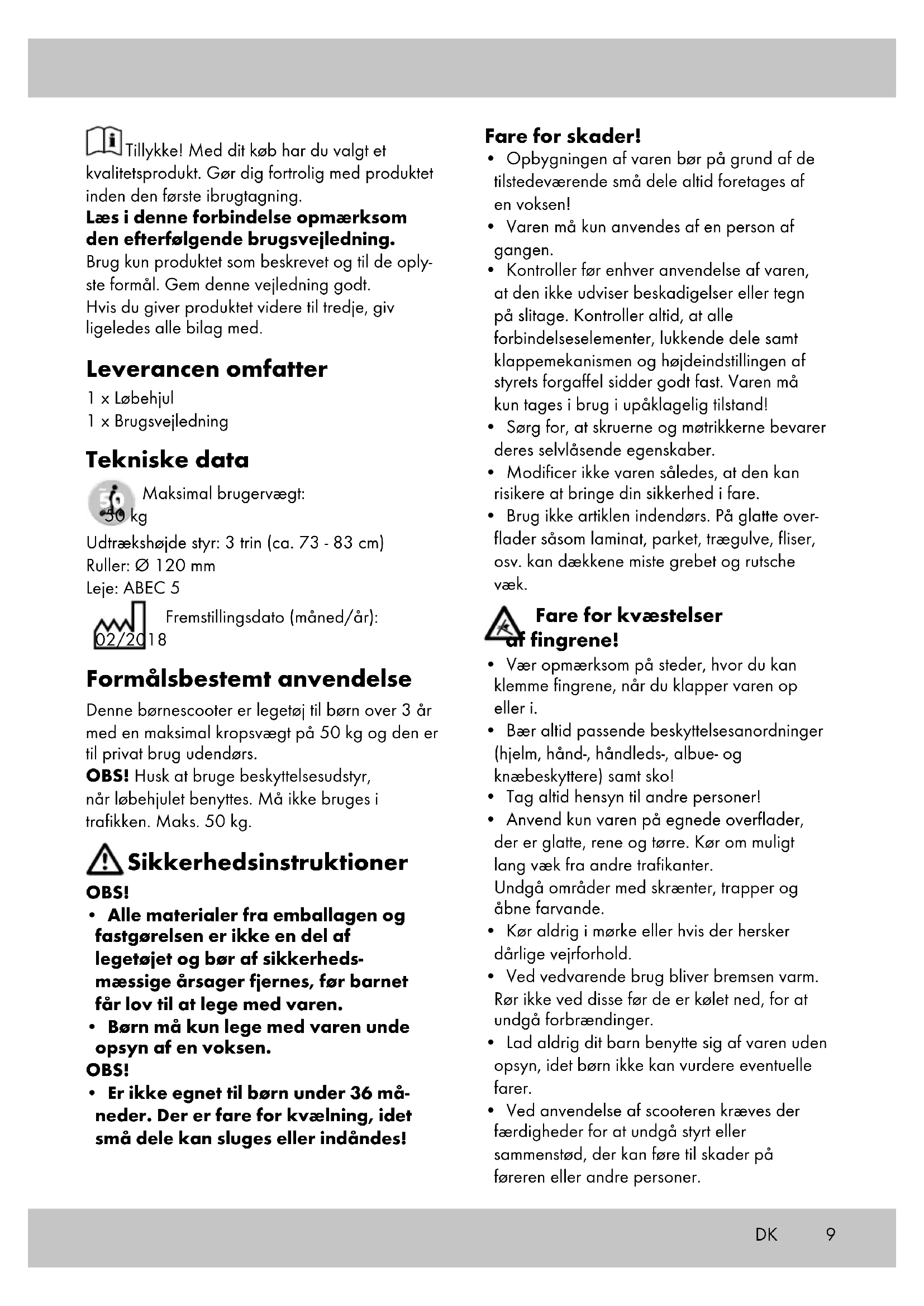 - Ved anvendelse af scooteren kræves der færdigheder for at undgå styrt eller sammenstød, der kan føre til skader på føreren eller andre personer.10 Undgå materielle skader!
