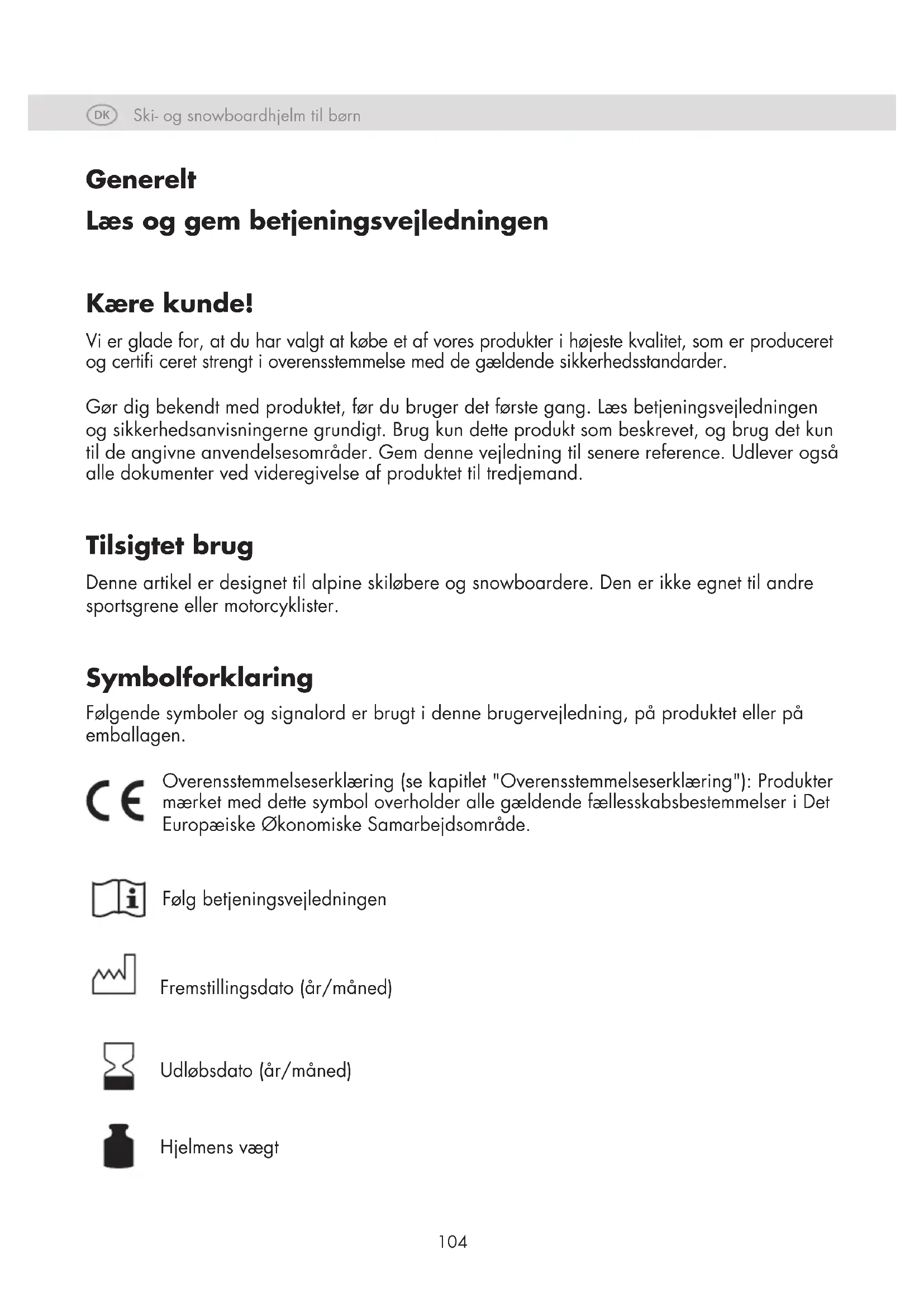 Generelt Læs og gem betjeningsvejledningen Kære kunde! Vi er glade for, at du har valgt at købe et af vores produkter i højeste kvalitet, som er produceret og certi ceret strengt i overensstemmelse med de gældende sikkerhedsstandarder. Gør dig bekendt med produktet, før du bruger det første gang. Læs betjeningsvejledningen og sikkerhedsanvisningerne grundigt. Brug kun dette produkt som beskrevet, og brug det kun til de angivne anvendelsesområder. Gem denne vejledning til senere reference. Udlever også alle dokumenter ved videregivelse af produktet til tredjemand. Tilsigtet brug Denne artikel er designet til alpine skiløbere og snowboardere. Den er ikke egnet til andre sportsgrene eller motorcyklister. Symbolforklaring Følgende symboler og signalord er brugt i denne brugervejledning, på produktet eller på emballagen. Overensstemmelseserklæring (se kapitlet "Overensstemmelseserklæring"): Produkter mærket med dette symbol overholder alle gældende fællesskabsbestemmelser i Det Europæiske Økonomiske Samarbejdsområde. Følg betjeningsvejledningen Fremstillingsdato (år/måned) Udløbsdato (år/måned) Hjelmens vægtSki- og snowboardhjelm til børn