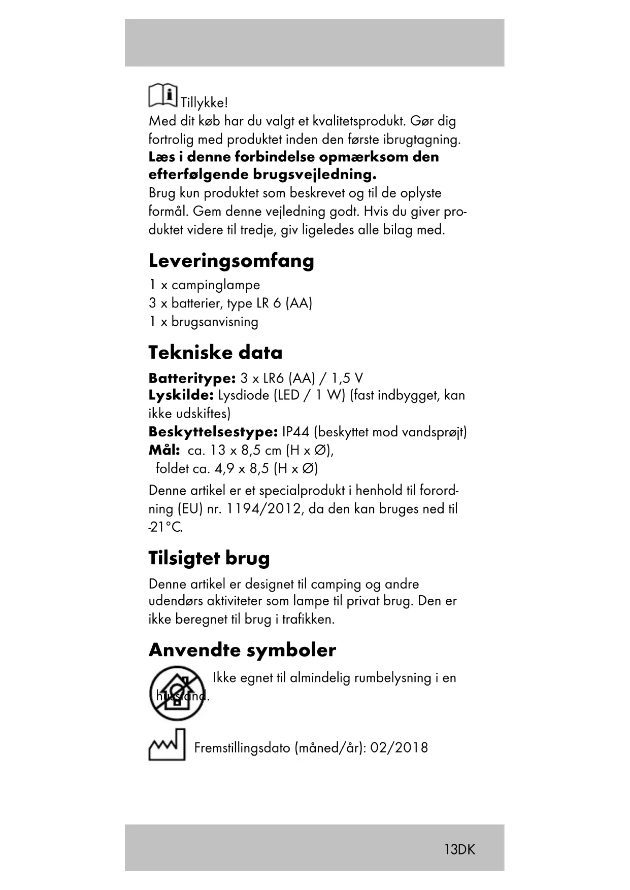 - Hængelampe (afb. F) For at anvende hængelampen skal du klappe ophæng- ningsanordningen med karabinfunktion (1d) op af produktet (fig. F). Opbevaring, rengøring Opbevar altid artiklen tør og ren i et tempereret rum. Må kun rengøres med vand, og herefter tørres af med en rengøringsklud. VIGTIGT! Må aldrig rengøres med skrappe rengøringsmidler. Henvisninger vedr. bortskaffelse Bortskaf artikel og emballage i overensstemmelse med lokalt gældende forskrifter. Emballagematerialer som f.eks. plastposer hører ikke hjemme i børnehænder. Opbevar emballagen utilgængeligt for børn. Enheder, der er markeret med symbolet ved siden af må ikke bortskaffes sammen med husholdning- saffaldet. Man er forpligtet til at bortskaffe sådant elektrisk og elektronisk udstyr separat. Få information fra din kommune angående mulighederne for regelret bortskaffelse. Fjern batteriet før artiklen bortskaffes. DK17 Bortskaffelse af batterier Bemærk venligst: For batteriernes vedkommen- de drejer det sig om farligt affald, der ikke må bortskaffes sammen med husholdningsaffaldet i henhold til lovgivningen. Udtjente batterier kan afleveres gratis på kommunale genbrugspladser. Her står der specielle samlebeholdere klar. Oplysninger om garanti og ser- vicehåndtering Produktet er fremstillet med største omhu og under vedvarende kontrol. Der ydes en garanti på tre år fra købsdatoen på dette produkt. Opbevar venligst kvitterin- gen fra købet. Garantien gælder kun for materiale- og fabrikationsfejl og bortfalder ved misbrug eller uhensigts- mæssig anvendelse. Deres lovpligtige rettigheder, særligt garantikrav, begrænses ikke af denne garanti. Ved even- tuelle klager bedes du henvende dig til nedenstående service-hotline eller tage kontakt til os via e-mail. Medar- bejderne i vores kundetjeneste vil så aftale den videre fremgangsmåde med dig. Vi vil under alle omstændighe- der rådgive dig personlig. Garantiperioden forlænges ikke ved eventuelle reparationer inden for garantien eller ved kulance. Dette gælder også for udskiftede og reparerede dele. Efter udløb af garantien er forefalden- de reparationer forbundet med omkostninger. IAN: 297011 Service Danmark Tel.: 32 710005 E-Mail: deltasport@lidl.dk DK18 FR/BE Félicitations ! Vous avez acquis un produit de haute qualité. Apprenez à connaître le produit avant sa première utilisation. Lisez pour cela attentivement la notice d’utili- sation suivante. N’utilisez le produit que comme décrit et pour les zones d’application indiquées. Veuillez conserver cette notice d’utilisation. Transmettez tous les documents en cas de cession du produit à une tierce personne. Contenu de la livraison 1 lampe de camping 3 piles de type LR 6 (AA) 1 manuel d‘instruction Caractéristiques techniques Type de pile : 3 LR6 (AA) / 1,5 V Ampoule : Diode émettrice de lumière (LED / 1 W) (fixe, ne peut pas être changée) Type de protection : IP44 (protection contre les éclaboussures) Dimensions : env. 13 x 8,5 cm (H x Ø), pliée env. 4,9 x 8,5 cm (H x Ø) Cet article est un produit spécial conforme au règlement (UE) no. 1194/2012, car il peut être utilisé jusqu’à -21° C. Utilisation conforme Cet article est conçu pour le camping et autres activités de plein air comme lampe à usage privé. Il n‘a pas été conçu pour une utilisation dans le trafic routier. Symboles utilisés Ne convient pas pour l‘éclairage domestique. Date de fabrication (Mois/Année) : 02/201819FR/BE Consignes de sécurité Important : Lisez attentivement ces instructions et conservez-les !
