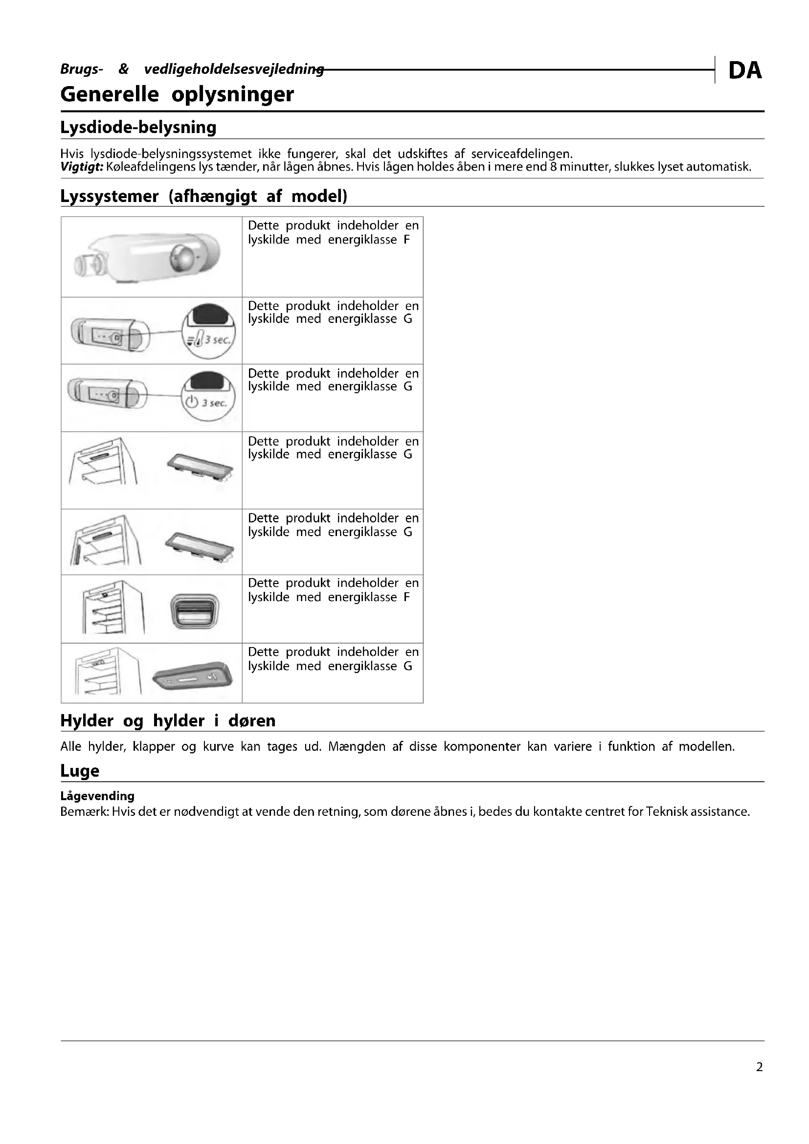 Generelle oplysninger Lysdiode-belysning Hvis lysdiode-belysningssystemet ikke fungerer, skal det udskiftes af serviceafdelingen. Vigtigt: Køleafdelingens lys tænder, når lågen åbnes. Hvis lågen holdes åben i mere end 8 minutter, slukkes lyset automatisk. Lyssystemer (afhængigt af model) Dette produkt indeholder en lyskilde med energiklasse F Dette produkt indeholder en lyskilde med energiklasse G Dette produkt indeholder en lyskilde med energiklasse G Dette produkt indeholder en lyskilde med energiklasse G Dette produkt indeholder en lyskilde med energiklasse G Dette produkt indeholder en lyskilde med energiklasse F Dette produkt indeholder en lyskilde med energiklasse G Hylder og hylder i døren Alle hylder, klapper og kurve kan tages ud. Mængden af disse komponenter kan variere i funktion af modellen. Luge Lågevending Bemærk: Hvis det er nødvendigt at vende den retning, som dørene åbnes i, bedes du kontakte centret for Teknisk assistance.Brugs- & vedligeholdelsesvejledning
