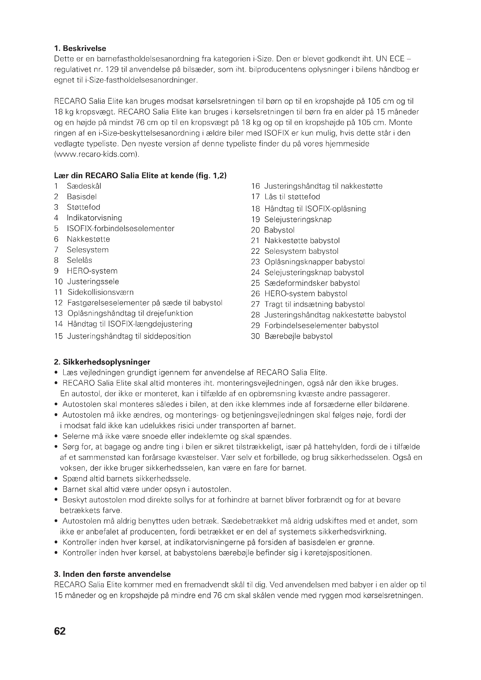 ringen af en i-Size-beskyttelsesanordning i ældre biler med ISOFIX er kun mulig, hvis dette står i den vedlagte typeliste. Den nyeste version af denne typeliste finder du på vores hjemmeside (www.recaro-kids.com). Lær din RECARO Salia Elite at kende (fig. 1,2) 1 Sædeskål 2 Basisdel 3 Støttefod 4 lndikatorvisning 5 ISOFIX-forbindelseselementer 6 Nakkestøtte 7 Selesystem 8 Selelås 9 HERO-system 10 Justeringssele 11 Sidekollisionsværn 12 Fastgørelseselementer på sæde til babystol 13 Oplåsningshåndtag til drejefunktion 14 Håndtag til ISOFIX-længdejustering 15 Justeringshåndtag til siddeposition 16 Justeringshåndtag til nakkestøtte 17 Lås til støttefod 18 Håndtag til ISOFIX-oplåsning 19 Selejusteringsknap 20 Babystol 21 Nakkestøtte babystol 22 Selesystem babystol 23 Oplåsningsknapper babystol 24 Selejusteringsknap babystol 25 Sædeformindsker babystol 26 HERO-system babystol 27 Tragt til indsætning babystol 28 Justeringshåndtag nakkestøtte babystol 29 Forbindelseselementer babystol 30 Bærebøjle babystol