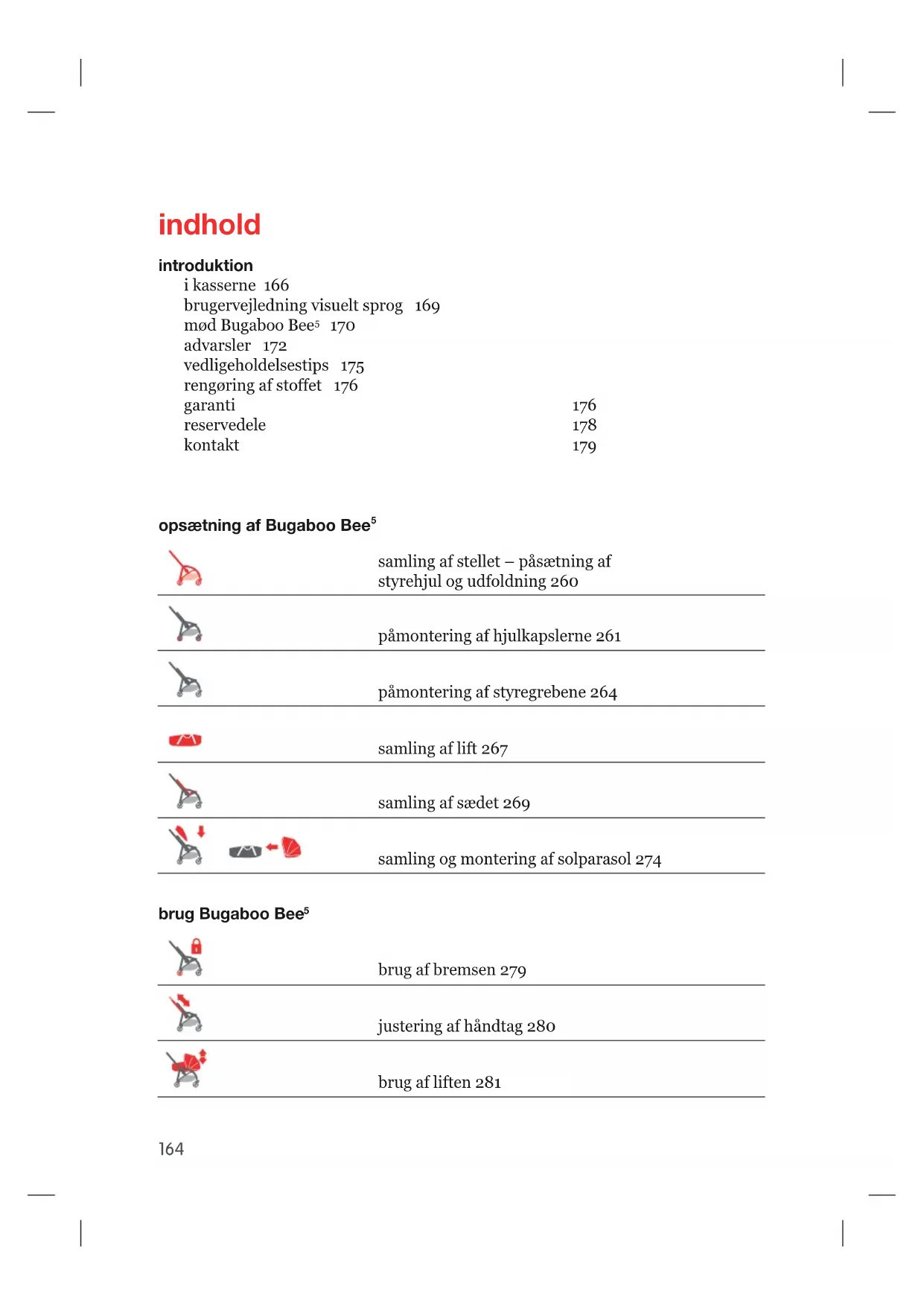 brug af bremsen 279 justering af håndtag 280 brug af liften 281 164brug af solparasol 283 brug af sædet 288 brug af sele 295 et stykke foldning med sædet vendt mod forældrene 297 et stykke foldning med sædet vendt mod verden 299 brug af håndledsstrop 301 låsning/oplåsning af svirvel hjulene 302 fjernelse af hjulene 304 fjernelse tasken under sædet 306 fjernelse af sædebetræk 308 fjernelse af styregrebene 311 fjernelse af hjulkapslerne 314 brug af regn dækken 313