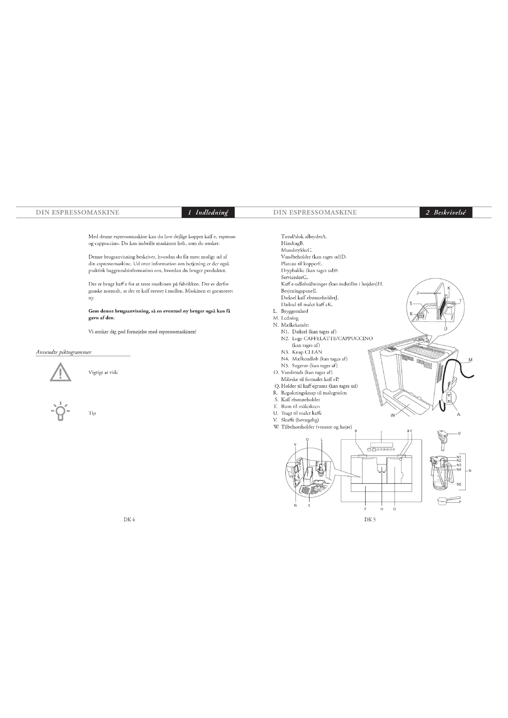IndholdDIN ESPRESSOMASKINE indhold DK 4 DIN ESPRESSOMASKINE indhold DK 5 Tænd/sluk afbryderA. HåndtagB. MundstykkeC. Vandbeholder (kan tages ud)D. Plateau til kopperE. Drypbakke (kan tages ud)F. ServicedørG. Kaff e-udløbsåbninger (kan indstilles i højden)H. BetjeningspanelI. Dæksel kaff ebønneholderJ. Dæksel til malet kaff eK. BryggeenhedL. LedningM. Mælkekande:N. N1. Dæksel (kan tages af) N2. Luge CAFFELATTE/CAPPUCCINO (kan tages af) N3. Knap CLEAN N4. Mælkeudløb (kan tages af) N5. Sugerør (kan tages af) Vandstuds (kan tages af)O. Måleske til formalet kaff eP. Holder til kaff egrums (kan tages ud)Q. Reguleringsknap til malegradenR. Kaff ebønneholderS. Rum til måleskeenT. Tragt til malet kaff eU. Skuff e (bevægelig)V. Tilbehørsholder (venstre og højre)W.