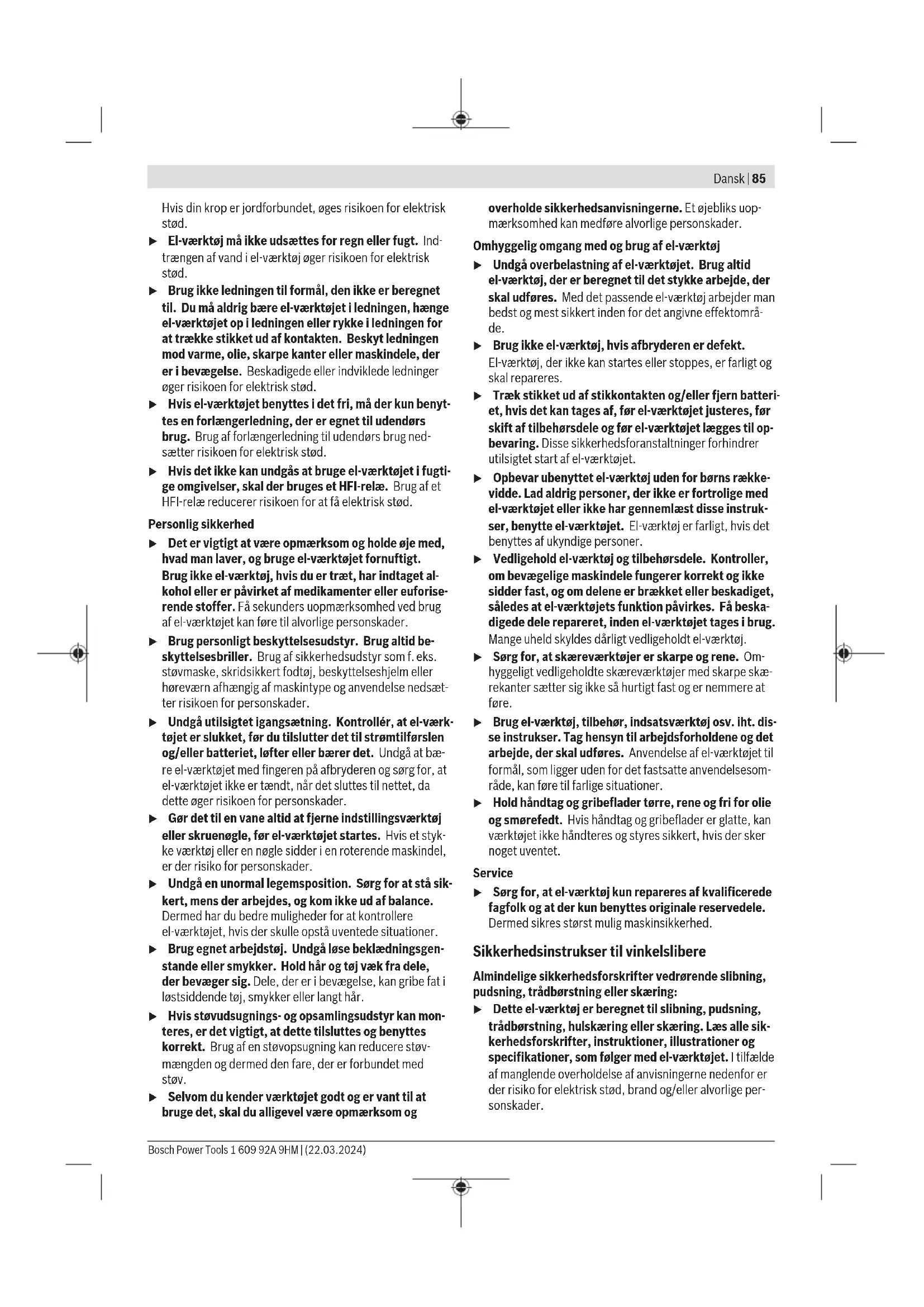 Schakelaaruitvoering met vergrendeling Voor de ingebruikname van het elektrische gereedschap drukt u eerst op de aan/uit-schakelaar(2) ➊, daarna schuift u deze naar voren ➋. Druk hem vervolgens in en houd hem ingedrukt ➌. Voor het vastzetten van de ingedrukte aan/uit- schakelaar(2) schuift u de aan/uit-schakelaar(2) verder naar voren ➍. Om het elektrische gereedschap uit te schakelen, laat u de aan/uit-schakelaar(2) los of wanneer deze vergrendeld is, drukt u kort op de aan/uit-schakelaar(2) en laat u deze daar- na los. Schakelaaruitvoering zonder vergrendeling Voor de ingebruikname van het elektrische gereedschap drukt u eerst op de aan/uit-schakelaar(2) ➊, daarna Bosch Power Tools 1 609 92A 9HM | (22.03.2024)84 | Dansk schuift u deze naar voren ➋. Druk hem vervolgens in en houd hem ingedrukt ➌. Om het elektrische gereedschap uit te schakelen, laat u de aan/uit-schakelaar(2) los. u Controleer de slijpgereedschappen vóór gebruik. Het slijpgereedschap moet correct gemonteerd zijn en vrij kunnen draaien. Laat dit ten minste 1 minuut zonder belasting proefdraaien. Gebruik geen beschadigde, onronde of trillende slijpgereedschappen. Beschadig- de slijpgereedschappen kunnen barsten en verwondingen veroorzaken. Onderhoud en service Onderhoud en reiniging u Trek vóór werkzaamheden aan het elektrische gereed- schap altijd de stekker uit het stopcontact. u Houd het elektrische gereedschap en de ventilatie- openingen altijd schoon om goed en veilig te werken. u Gebruik onder extreme gebruiksomstandigheden in- dien mogelijk altijd een afzuiginstallatie. Blaas de ven- tilatieopeningen regelmatig schoon en sluit het ge- reedschap via een aardlekschakelaar (PRCD) aan. Tij- dens het bewerken van metalen kan geleidend stof in het elektrische gereedschap terechtkomen. Daardoor kan de veiligheidsisolatie van het elektrische gereedschap wor- den belemmerd. Bewaar en behandel de accessoires zorgvuldig. Wanneer een vervanging van de aansluitkabel noodzakelijk is, dan moet dit door Bosch of een geautoriseerde klanten- service voor elektrische gereedschappen van Bosch worden uitgevoerd om veiligheidsrisico's te vermijden. Klantenservice en gebruiksadvies Onze klantenservice beantwoordt uw vragen over reparatie en onderhoud van uw product en over vervangingsonderde- len. Explosietekeningen en informatie over vervangingson- derdelen vindt u ook op: www.bosch-pt.com Het Bosch-gebruiksadviesteam helpt u graag bij vragen over onze producten en accessoires. Vermeld bij vragen en bestellingen van vervangingsonderde- len altijd het uit tien cijfers bestaande productnummer vol- gens het typeplaatje van het product. Nederland Tel.: (076) 579 54 54 Fax: (076) 579 54 94 E-mail: gereedschappen@nl.bosch.com Meer serviceadressen vindt u onder: www.bosch-pt.com/serviceaddresses Afvalverwijdering Elektrische gereedschappen, accessoires en verpakkingen moeten op een voor het milieu verantwoorde wijze worden gerecycled. Gooi elektrische gereedschappen niet bij het huisvuil! Alleen voor landen van de EU: Volgens de Europese richtlijn 2012/19/EU betreffende elek- trische en elektronische oude apparaten en de omzetting van de richtlijn in nationaal recht moeten niet meer bruikba- re elektrische gereedschappen apart worden ingezameld en op een voor het milieu verantwoorde wijze worden herge- bruikt. Bij een verkeerde afvoer kunnen afgedankte elektrische en elektronische apparaten vanwege de mogelijke aanwezig- heid van gevaarlijke stoffen schadelijke uitwerkingen op het milieu en de gezondheid van mensen hebben. Dansk Sikkerhedsinstrukser Generelle sikkerhedsanvisninger for el-værktøj ADVARSEL Læs alle sikkerhedsadvarsler, in- struktioner, illustrationer og spe- cifikationer, som følger med el-værktøjet. I tilfælde af manglende overholdelse af anvisningerne nedenfor er der ri- siko for elektrisk stød, brand og/eller alvorlige per- sonskader. Opbevar alle sikkerhedsinstrukser og anvisninger til se- nere brug. Betegnelsen "el-værktøj" i advarslerne refererer til dit (led- ningsforbundne) el-værktøj tilsluttet lysnettet eller til batte- ridrevet (ledningsfrit) el-værktøj. Sikkerhed på arbejdspladsen u Hold arbejdsområdet rent og godt oplyst. Rodede eller mørke områder kan medføre ulykker. u Brug ikke el‑værktøjet i eksplosionsfarlige omgivel- ser, hvor der findes brændbare væsker, gasser eller støv. El‑værktøj kan slå gnister, der kan antænde støv el- ler dampe. u Sørg for, at andre personer og ikke mindst børn hol- des væk fra arbejdsområdet, når el-værktøjet er i brug. Hvis man distraheres, kan man miste kontrollen over maskinen. Elektrisk sikkerhed u El‑værktøjets stik skal passe til kontakten. Stikket må under ingen omstændigheder ændres. Brug ikke adapterstik sammen med jordforbundet el‑værktøj. Uændrede stik, der passer til kontakterne, nedsætter risi- koen for elektrisk stød. u Undgå kropskontakt med jordforbundne overflader som f. eks. rør, radiatorer, komfurer og køleskabe. 1 609 92A 9HM | (22.03.2024) Bosch Power ToolsDansk | 85 Hvis din krop er jordforbundet, øges risikoen for elektrisk stød. u El-værktøj må ikke udsættes for regn eller fugt. Ind- trængen af vand i el‑værktøj øger risikoen for elektrisk stød. u Brug ikke ledningen til formål, den ikke er beregnet til. Du må aldrig bære el‑værktøjet i ledningen, hænge el‑værktøjet op i ledningen eller rykke i ledningen for at trække stikket ud af kontakten. Beskyt ledningen mod varme, olie, skarpe kanter eller maskindele, der er i bevægelse. Beskadigede eller indviklede ledninger øger risikoen for elektrisk stød. u Hvis el‑værktøjet benyttes i det fri, må der kun benyt- tes en forlængerledning, der er egnet til udendørs brug. Brug af forlængerledning til udendørs brug ned- sætter risikoen for elektrisk stød. u Hvis det ikke kan undgås at bruge el‑værktøjet i fugti- ge omgivelser, skal der bruges et HFI‑relæ. Brug af et HFI‑relæ reducerer risikoen for at