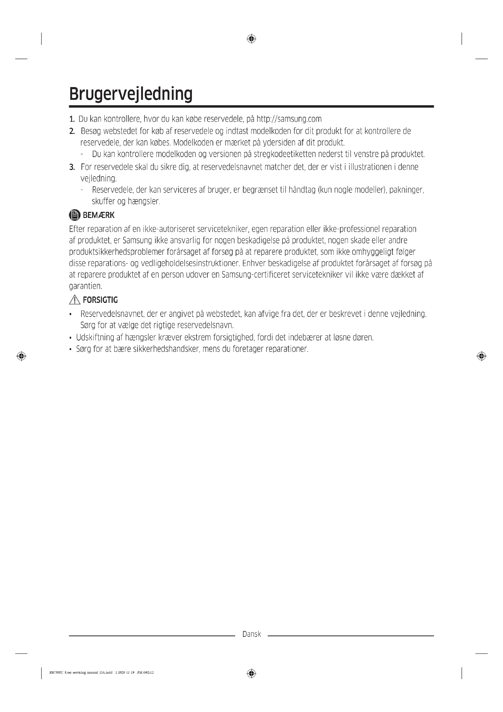 - Sørg for at bære sikkerhedshandsker, mens du foretager reparationer. RB7300T_User-servicing-manual_DA.indd 1 2020-11-19 PM 6:02:12Dansk Det faktiske billede og køleskabets medfølgende dele afviger muligvis afhængigt af model og land.