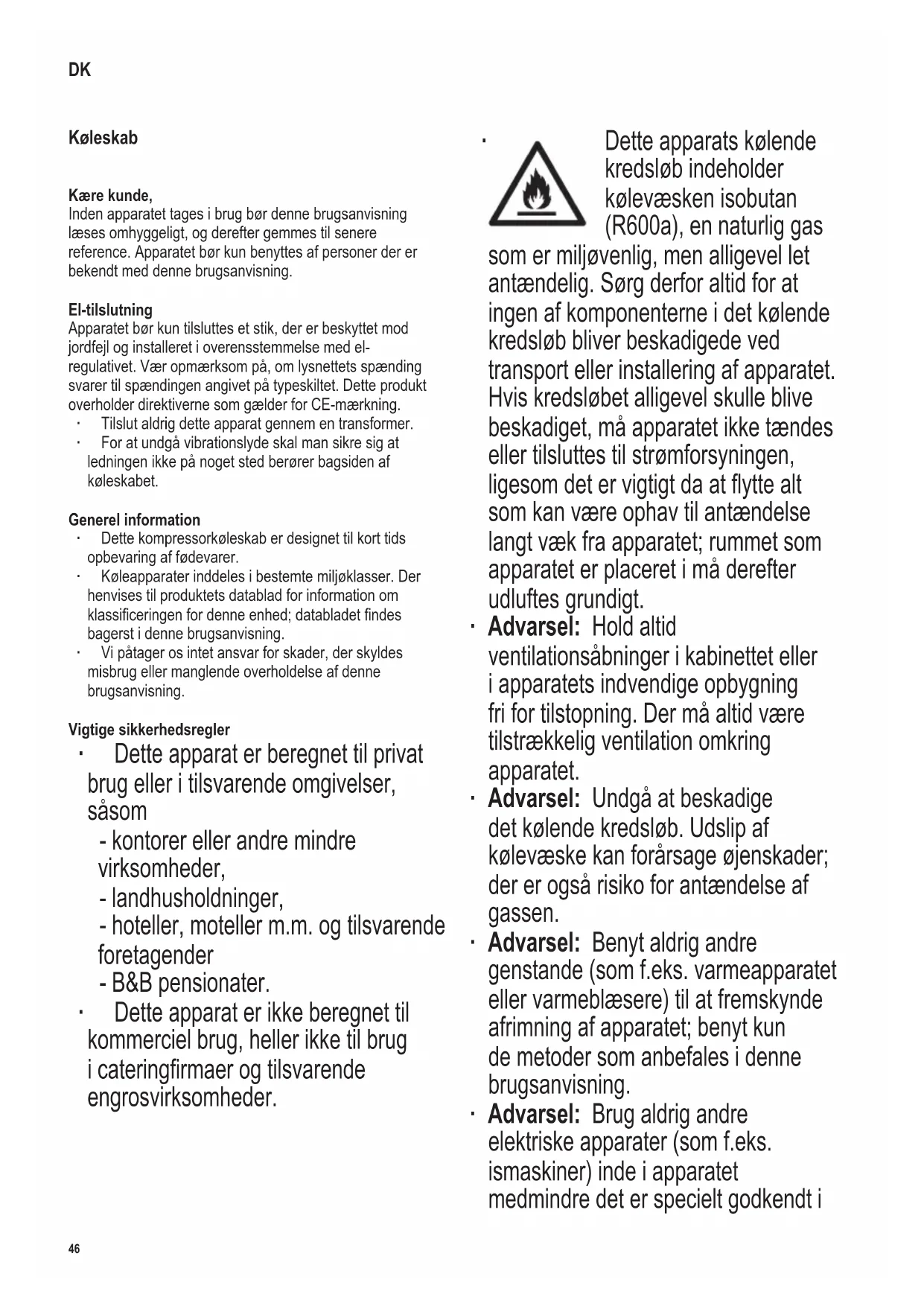 Dette apparats kølende kredsløb indeholder kølevæsken isobutan (R600a), en naturlig gas som er miljøvenlig, men alligevel let antændelig. Sørg derfor altid for at ingen af komponenterne i det kølende kredsløb bliver beskadigede ved transport eller installering af apparatet. Hvis kredsløbet alligevel skulle blive beskadiget, må apparatet ikke tændes eller tilsluttes til strømforsyningen, ligesom det er vigtigt da at ytte alt som kan være ophav til antændelse langt væk fra apparatet; rummet som apparatet er placeret i må derefter udluftes grundigt. ∙ Advarsel: Hold altid ventilationsåbninger i kabinettet eller i apparatets indvendige opbygning fri for tilstopning. Der må altid være tilstrækkelig ventilation omkring apparatet. ∙ Advarsel: Undgå at beskadige det kølende kredsløb. Udslip af kølevæske kan forårsage øjenskader; der er også risiko for antændelse af gassen. ∙ Advarsel: Benyt aldrig andre genstande (som f.eks. varmeapparatet eller varmeblæsere) til at fremskynde afrimning af apparatet; benyt kun de metoder som anbefales i denne brugsanvisning. ∙ Advarsel: Brug aldrig andre elektriske apparater (som f.eks. ismaskiner) inde i apparatet medmindre det er specielt godkendt i DK47 142 x 208 mm denne brugsanvisning. ∙ Inden tilslutning til strømforsyningen må apparatet og ledningen altid efterses grundigt for mulige transportskader. Hvis den form for beskadigelse bliver forefundet, må apparatet ikke tilsluttes til strømforsyningen. ∙ Når enheden installeres er det vigtigt, at ledningen ikke er fastklemt, eller på anden måde bliver beskadiget. ∙ Variable multistikdåser eller strømforsyninger må ikke anbringes på enhedens bagside. ∙ Dette apparat er ikke beregnet til opbevaring af eksplosive substanser såsom spraydåser med brændbar drivgas. ∙ Hvis apparatet sælges, overdrages til tredjepart eller bortskaffes til en genbrugsstation, må man gøre opmærksom på tilstedeværelse af både isoleringsmidlet ’cyclopenthan’