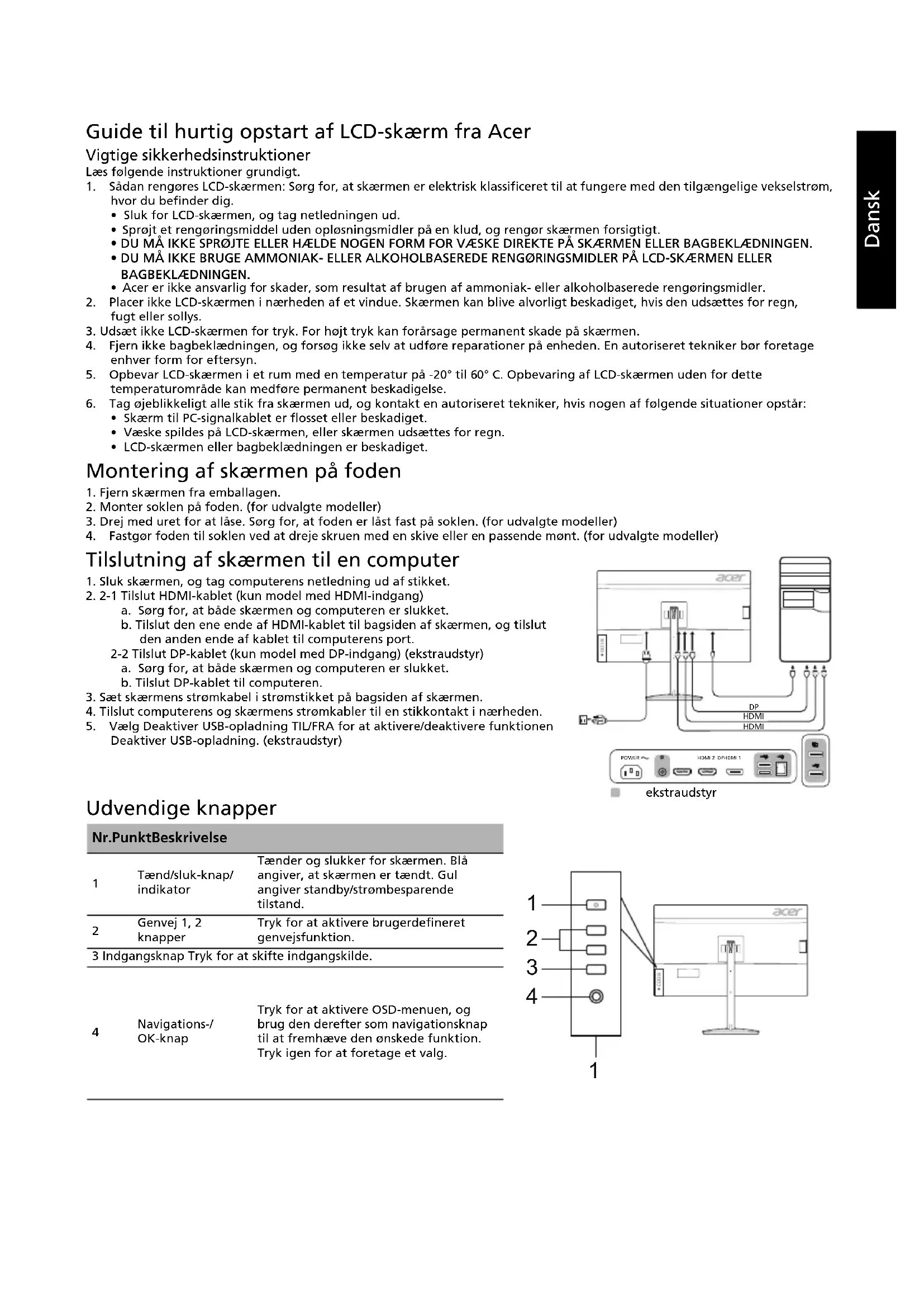 Tilslutning af skærmen til en computer 1. Sluk skærmen, og tag computerens netledning ud af stikket.2. 2-1 Tilslut HDMI-kablet (kun model med HDMI-indgang)a. Sørg for, at både skærmen og computeren er slukket.b. Tilslut den ene ende af HDMI-kablet til bagsiden af skærmen, og tilslut den anden ende af kablet til computerens port.2-2 Tilslut DP-kablet (kun model med DP-indgang) (ekstraudstyr)a. Sørg for, at både skærmen og computeren er slukket.b. Tilslut DP-kablet til computeren.3. Sæt skærmens strømkabel i strømstikket på bagsiden af skærmen.4. Tilslut computerens og skærmens strømkabler til en stikkontakt i nærheden.