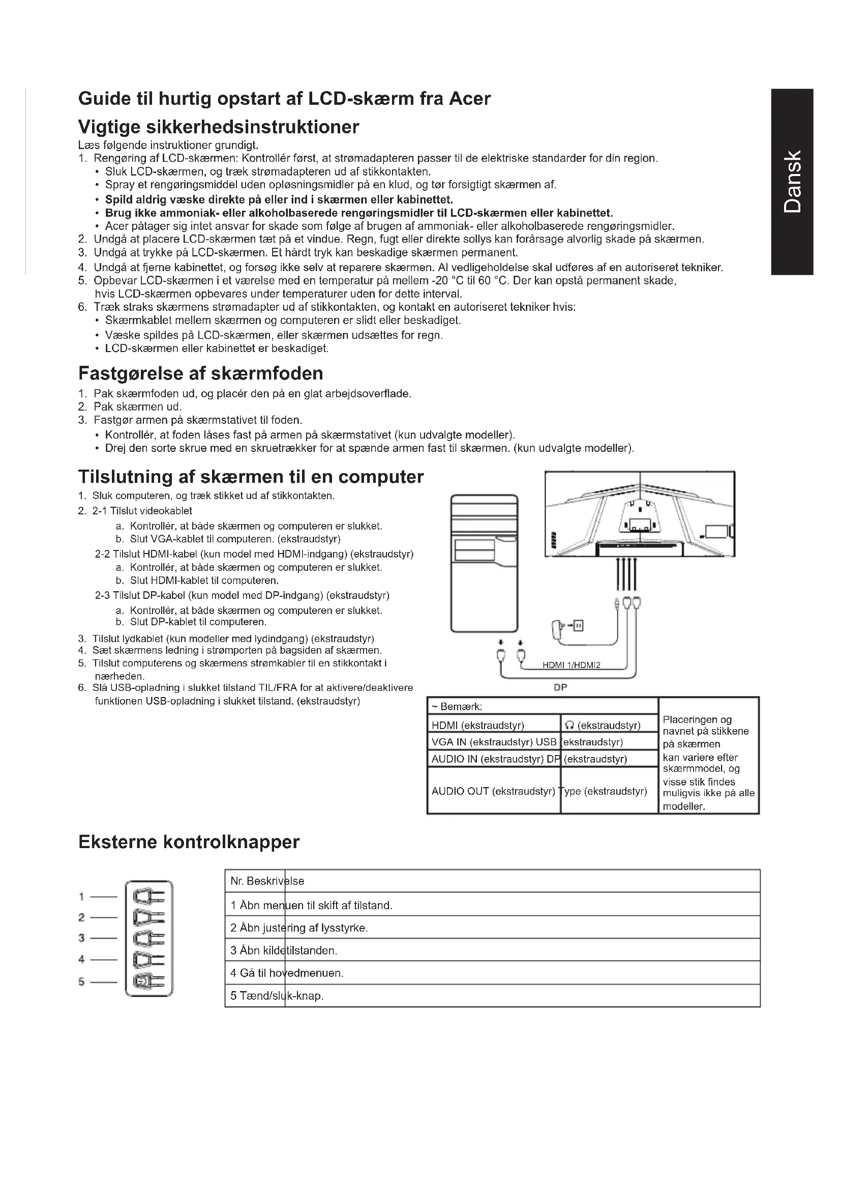 funktionen USB-opladning i slukket tilstand. (ekstraudstyr) HDMI 1/HDMI2 ~ Bemærk: Placeringen og navnet på stikkene på skærmen kan variere efter skærmmodel, og visse stik findes muligvis ikke på alle modeller. HDMI (ekstraudstyr) (ekstraudstyr) VGA IN (ekstraudstyr) USB (ekstraudstyr) AUDIO IN (ekstraudstyr) DP (ekstraudstyr) AUDIO OUT (ekstraudstyr) Type (ekstraudstyr) Eksterne kontrolknapper Nr. Beskrivelse 1 Åbn menuen til skift af tilstand. 2 Åbn justering af lysstyrke. 3 Åbn kildetilstanden. 4 Gå til hovedmenuen. 5 Tænd/sluk-knap.Dansk Lovgivningsmæssige erklæringer og sikkerhedserklæringer FCC-erklæring Udstyret er afprøvet og overholder grænserne for digitale enheder i klasse B i henhold til del 15 i FCC-reglerne. Grænserne er beregnet til at give rimelig beskyttelse mod skadelig interferens, når udstyret er installeret i boligområder. Udstyret genererer, bruger, kan udstråle radiofrekvensenergi og kan, hvis det ikke er installeret og anvendes i overensstemmelse med anvisningerne, forårsage interferens for radiokommunikation. Der er imidlertid ingen garanti for, at interferens ikke kan opstå i en bestemt installation. Hvis enheden forårsager interferens for modtagelse af radio- og tv-signaler (hvilket kan afgøres med koblingsudstyret), anbefales det, at brugeren afhjælper interferensen på en eller flere af følgende måder: