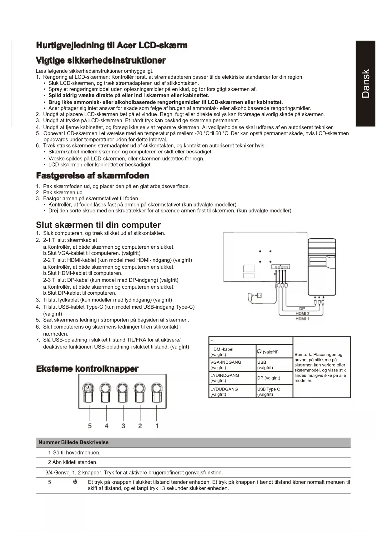 Bemærk: Placeringen og navnet på stikkene på skærmen kan variere efter skærmmodel, og visse stik findes muligvis ikke på alle modeller. HDMI-kabel (valgfrit) (valgfrit) VGA-INDGANG (valgfrit) USB (valgfrit) LYDINDGANG (valgfrit) DP (valgfrit) LYDUDGANG (valgfrit) USB Type C (valgfrit) Nummer Billede Beskrivelse 1 Gå til hovedmenuen. 2 Åbn kildetilstanden. 3/4 Genvej 1, 2 knapper. Tryk for at aktivere brugerdefineret genvejsfunktion.