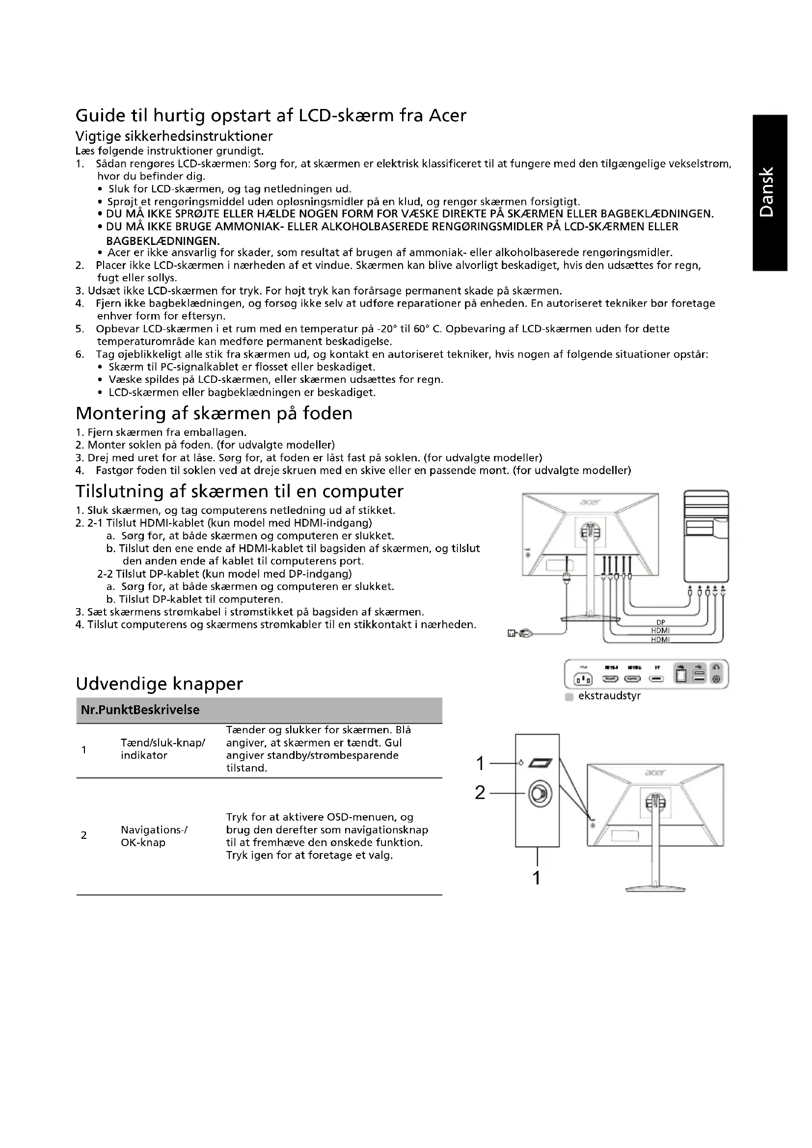 Tilslutning af skærmen til en computer 1. Sluk skærmen, og tag computerens netledning ud af stikket.2. 2-1 Tilslut HDMI-kablet (kun model med HDMI-indgang)a. Sørg for, at både skærmen og computeren er slukket.b. Tilslut den ene ende af HDMI-kablet til bagsiden af skærmen, og tilslut den anden ende af kablet til computerens port.2-2 Tilslut DP-kablet (kun model med DP-indgang)a. Sørg for, at både skærmen og computeren er slukket.b. Tilslut DP-kablet til computeren.3. Sæt skærmens strømkabel i strømstikket på bagsiden af skærmen.4. Tilslut computerens og skærmens strømkabler til en stikkontakt i nærheden. Udvendige knapper Nr. Punkt Beskrivelse