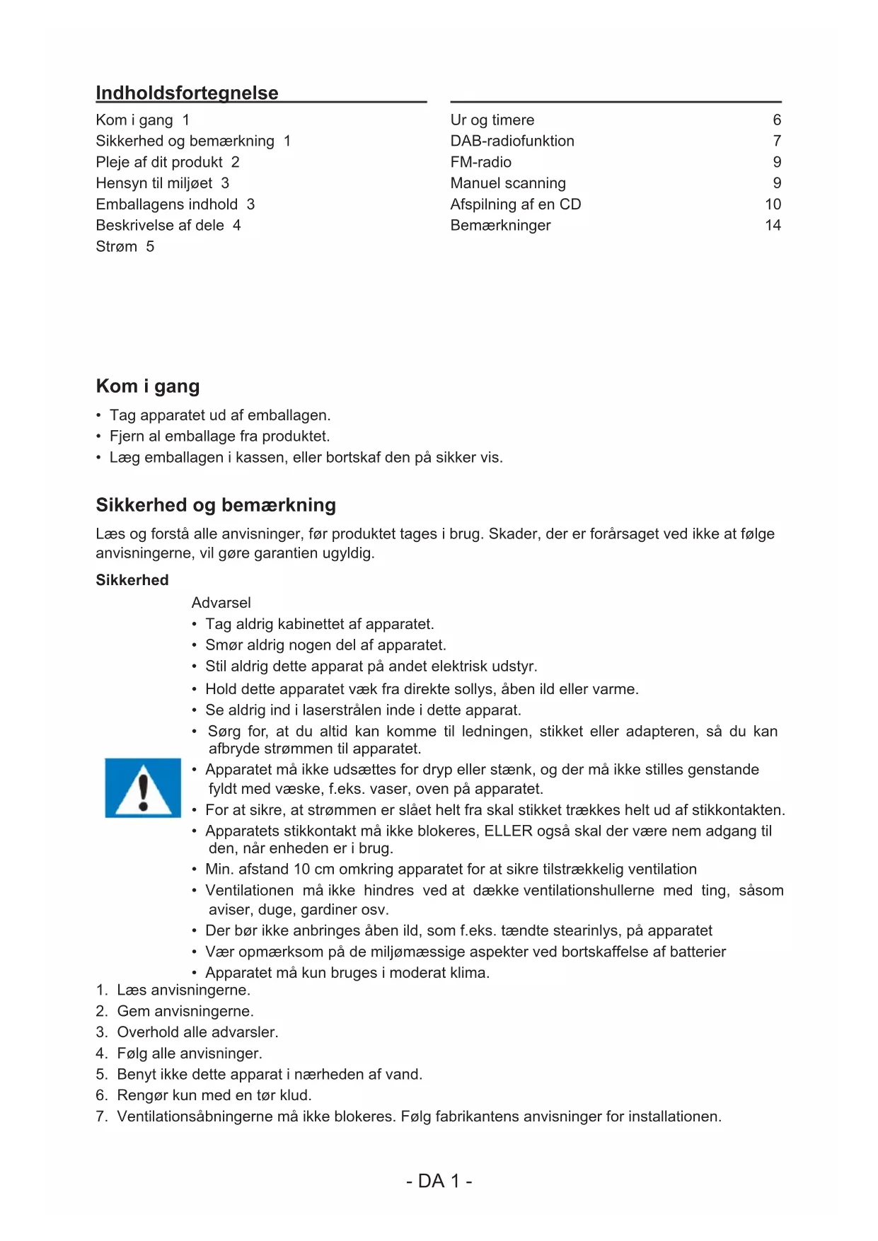 Kom i gang 1 Sikkerhed og bemærkning 1 Pleje af dit produkt 2 Hensyn til miljøet 3 Emballagens indhold 3 Beskrivelse af dele 4 Strøm 5 Ur og timere 6 DAB-radiofunktion 7 FM-radio 9 Manuel scanning 9 Afspilning af en CD 10 Bemærkninger: 14