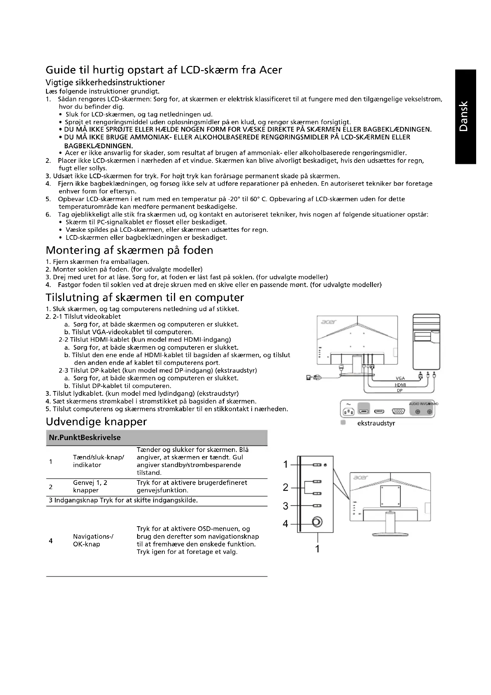 Tilslutning af skærmen til en computer 1. Sluk skærmen, og tag computerens netledning ud af stikket.2. 2-1 Tilslut videokableta. Sørg for, at både skærmen og computeren er slukket.b. Tilslut VGA-videokablet til computeren. 2-2 Tilslut HDMI-kablet (kun model med HDMI-indgang)a. Sørg for, at både skærmen og computeren er slukket.b. Tilslut den ene ende af HDMI-kablet til bagsiden af skærmen, og tilslut den anden ende af kablet til computerens port.2-3 Tilslut DP-kablet (kun model med DP-indgang) (ekstraudstyr)a. Sørg for, at både skærmen og computeren er slukket.b. Tilslut DP-kablet til computeren.3. Tilslut lydkablet. (kun model med lydindgang) (ekstraudstyr)4. Sæt skærmens strømkabel i strømstikket på bagsiden af skærmen.5. Tilslut computerens og skærmens strømkabler til en stikkontakt i nærheden. Udvendige knapper Nr. Punkt Beskrivelse