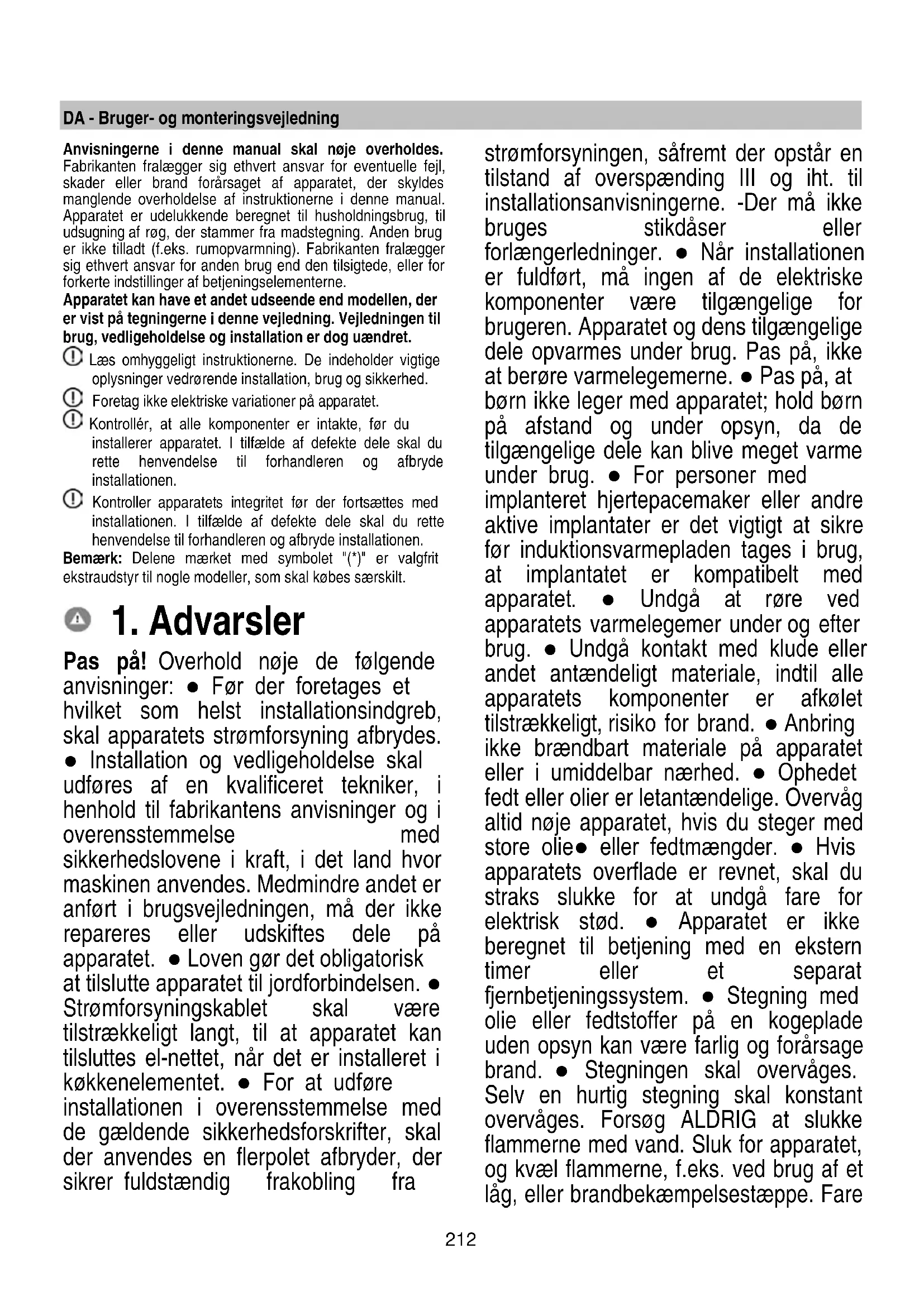Pas på! Overhold nøje de følgende anvisninger: ● Før der foretages et hvilket som helst installationsindgreb, skal apparatets strømforsyning afbrydes. ● Installation og vedligeholdelse skal udføres af en kvalificeret tekniker, i henhold til fabrikantens anvisninger og i overensstemmelse med sikkerhedslovene i kraft, i det land hvor maskinen anvendes. Medmindre andet er anført i brugsvejledningen, må der ikke repareres eller udskiftes dele på apparatet. ● Loven gør det obligatorisk at tilslutte apparatet til jordforbindelsen. ● Strømforsyningskablet skal være tilstrækkeligt langt, til at apparatet kan tilsluttes el-nettet, når det er installeret i køkkenelementet. ● For at udføre installationen i overensstemmelse med de gældende sikkerhedsforskrifter, skal der anvendes en flerpolet afbryder, der sikrer fuldstændig frakobling fra strømforsyningen, såfremt der opstår en tilstand af overspænding III og iht. til installationsanvisningerne. -Der må ikke bruges stikdåser eller forlængerledninger. ● Når installationen er fuldført, må ingen af de elektriske komponenter være tilgængelige for brugeren. Apparatet og dens tilgængelige dele opvarmes under brug. Pas på, ikke at berøre varmelegemerne. ● Pas på, at børn ikke leger med apparatet; hold børn på afstand og under opsyn, da de tilgængelige dele kan blive meget varme under brug. ● For personer med implanteret hjertepacemaker eller andre aktive implantater er det vigtigt at sikre før induktionsvarmepladen tages i brug, at implantatet er kompatibelt med apparatet. ● Undgå at røre ved apparatets varmelegemer under og efter brug. ● Undgå kontakt med klude eller andet antændeligt materiale, indtil alle apparatets komponenter er afkølet tilstrækkeligt, risiko for brand. ● Anbring ikke brændbart materiale på apparatet eller i umiddelbar nærhed. ● Ophedet fedt eller olier er letantændelige. Overvåg altid nøje apparatet, hvis du steger med store olie● eller fedtmængder. ● Hvis apparatets overflade er revnet, skal du straks slukke for at undgå fare for elektrisk stød. ● Apparatet er ikke beregnet til betjening med en ekstern timer eller et separat fjernbetjeningssystem. ● Stegning med olie eller fedtstoffer på en kogeplade uden opsyn kan være farlig og forårsage brand. ● Stegningen skal overvåges. Selv en hurtig stegning skal konstant overvåges. Forsøg ALDRIG at slukke flammerne med vand. Sluk for apparatet, og kvæl flammerne, f.eks. ved brug af et låg, eller brandbekæmpelsestæppe. Fare213 for brand: Sæt ikke genstande på kogepladerne. ● Brug ikke damprensere, risiko for elektrisk stød. Læg ikke metalgenstande som knive, gafler, skeer og låg på kogepladens overflade, da de kan overophedes. ● Før apparatet tilsluttes strømforsyningen: Kontrollér typeskiltet (placeret nederst på apparatet) for at sikre, at den oplyste spænding og strøm svarer til strømforsyningen, og at stikkontakten er egnet. I tvivlstilfælde bør du rette henvendelse til en kvalificeret elektriker. Vigtigt: ● Efter brug skal kogepladen slukkes med betjeningselementerne. Stol ikke på grydedetektoren alene. ● Undgå at væsker koger over. Reducér varmen, når du koger eller opvarmer væsker. ● Lad ikke kogepladerne være tændt med tomme gryder og pander eller uden. ● Sluk for kogezonen, når tilberedningen er afsluttet. ● Brug aldrig aluminiumsfolie til madlavning, og anbring aldrig produkter pakket med aluminium direkte på kogepladen. Alluminumfolien kan smelte og forårsage uoprettelige skader på apparatet. ● Du må aldrig varme dåser med mad op uden først at åbne dem: De kan eksplodere! Denne advarsel gælder for alle de andre typer kogeplader. Brug af høj effekt som Booster-funktionen er ikke egnet til opvarmning af visse væsker som f.eks. olie til friturestegning. En overdreven varme kan være farlig. I dette tilfælde anbefales det at anvende en lavere effekt. Beholderne skal anbringes direkte på kogepladen og centreres. Anbring aldrig andre genstande mellem gryden og kogepladen. ● Ved meget høje temperaturer sænker apparatet automatisk effektniveauet på de pågældende kogezoner. ● Før rengøring eller vedligeholdelse slukkes for apparatet og frakobl strømforsyningen ved at fjerne stikket eller afbryde hovedafbryderen i hjemmet. ● Til alle installations● og vedligeholdelsesindgreb anvend arbejdshandsker. ● Børn over 8 år og personer med nedsatte fysiske, sensoriske eller mentale evner eller uden den nødvendige erfaring og viden må kun bruge apparatet, hvis de er under opsyn eller forinden har modtaget instruktioner i sikker brug af apparatet og har forstået farerne, som brugen af apparatet indebærer. ● Det er nødvendigt at holde øje med, at børn ikke leger med apparatet. ● Rengøring og vedligeholdelse må ikke udføres af børn uden opsyn. ● Rummet skal have tilstrækkelig ventilation, når apparatet bruges på samme tid som andre gas● eller andre brændstofforbrændingsapparater. ● Apparatet skal rengøres hyppigt både indvendigt og udvendigt (MINDST ÉN GANG OM MÅNEDEN), under alle omstændigheder skal det overholdes, hvad der udtrykkeligt er angivet i vedligeholdelsesinstruktionerne. ● Manglende overholdelse af reglerne for rengøring af apparatet og udskiftning og rengøring af filtre medfører brandfare. ● Madlavning med flambé er strengt forbudt. ● Brug af åben ild er skadeligt for filtrene og kan forårsage brand og skal derfor altid undgås. ● Friturestegning må kun udføres under opsyn for at undgå, at den overophedede olie bryder i brand. ● ADVARSEL: Når kogepladen er i brug, kan apparatets tilgængelige dele blive meget varme. ● Advarsel! Tilslut ikke apparatet til strømforsyningen, før installationen er gennemført. ● Overhold nøje lokale bestemmelser med hensyn til de tekniske og sikkerhedsmæssige forholdsregler, der skal træffes ved udledning af røgen.214 ● Den udsugede