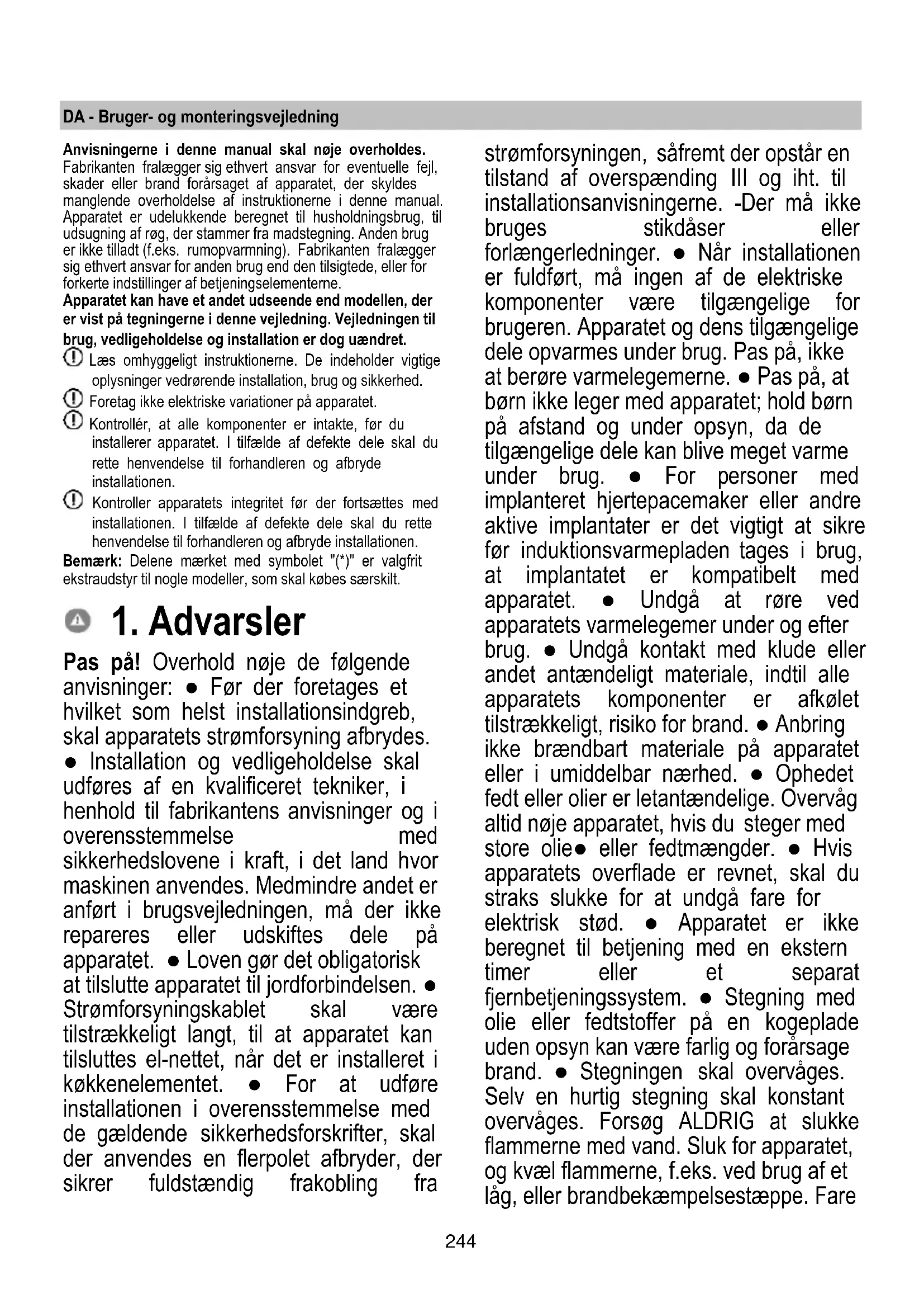 Pas på! Overhold nøje de følgende anvisninger: ● Før der foretages et hvilket som helst installationsindgreb, skal apparatets strømforsyning afbrydes. ● Installation og vedligeholdelse skal udføres af en kvalificeret tekniker, i henhold til fabrikantens anvisninger og i overensstemmelse med sikkerhedslovene i kraft, i det land hvor maskinen anvendes. Medmindre andet er anført i brugsvejledningen, må der ikke repareres eller udskiftes dele på apparatet. ● Loven gør det obligatorisk at tilslutte apparatet til jordforbindelsen. ● Strømforsyningskablet skal være tilstrækkeligt langt, til at apparatet kan tilsluttes el-nettet, når det er installeret i køkkenelementet. ● For at udføre installationen i overensstemmelse med de gældende sikkerhedsforskrifter, skal der anvendes en flerpolet afbryder, der sikrer fuldstændig frakobling fra strømforsyningen, såfremt der opstår en tilstand af overspænding III og iht. til installationsanvisningerne. -Der må ikke bruges stikdåser eller forlængerledninger. ● Når installationen er fuldført, må ingen af de elektriske komponenter være tilgængelige for brugeren. Apparatet og dens tilgængelige dele opvarmes under brug. Pas på, ikke at berøre varmelegemerne. ● Pas på, at børn ikke leger med apparatet; hold børn på afstand og under opsyn, da de tilgængelige dele kan blive meget varme under brug. ● For personer med implanteret hjertepacemaker eller andre aktive implantater er det vigtigt at sikre før induktionsvarmepladen tages i brug, at implantatet er kompatibelt med apparatet. ● Undgå at røre ved apparatets varmelegemer under og efter brug. ● Undgå kontakt med klude eller andet antændeligt materiale, indtil alle apparatets komponenter er afkølet tilstrækkeligt, risiko for brand. ● Anbring ikke brændbart materiale på apparatet eller i umiddelbar nærhed. ● Ophedet fedt eller olier er letantændelige. Overvåg altid nøje apparatet, hvis du steger med store olie● eller fedtmængder. ● Hvis apparatets overflade er revnet, skal du straks slukke for at undgå fare for elektrisk stød. ● Apparatet er ikke beregnet til betjening med en ekstern timer eller et separat fjernbetjeningssystem. ● Stegning med olie eller fedtstoffer på en kogeplade uden opsyn kan være farlig og forårsage brand. ● Stegningen skal overvåges. Selv en hurtig stegning skal konstant overvåges. Forsøg ALDRIG at slukke flammerne med vand. Sluk for apparatet, og kvæl flammerne, f.eks. ved brug af et låg, eller brandbekæmpelsestæppe. Fare245 for brand: Sæt ikke genstande på kogepladerne. ● Brug ikke damprensere, risiko for elektrisk stød. Læg ikke metalgenstande som knive, gafler, skeer og låg på kogepladens overflade, da de kan overophedes. ● Før apparatet tilsluttes strømforsyningen: Kontrollér typeskiltet (placeret nederst på apparatet) for at sikre, at den oplyste spænding og strøm svarer til strømforsyningen, og at stikkontakten er egnet. I tvivlstilfælde bør du rette henvendelse til en kvalificeret elektriker. Vigtigt: ● Efter brug skal kogepladen slukkes med betjeningselementerne. Stol ikke på grydedetektoren alene. ● Undgå at væsker koger over. Reducér varmen, når du koger eller opvarmer væsker. ● Lad ikke kogepladerne være tændt med tomme gryder og pander eller uden. ● Sluk for kogezonen, når tilberedningen er afsluttet. ● Brug aldrig aluminiumsfolie til madlavning, og anbring aldrig produkter pakket med aluminium direkte på kogepladen. Alluminumfolien kan smelte og forårsage uoprettelige skader på apparatet. ● Du må aldrig varme dåser med mad op uden først at åbne dem: De kan eksplodere! Denne advarsel gælder for alle de andre typer kogeplader. Brug af høj effekt som Booster-funktionen er ikke egnet til opvarmning af visse væsker som f.eks. olie til friturestegning. En overdreven varme kan være farlig. I dette tilfælde anbefales det at anvende en lavere effekt. Beholderne skal anbringes direkte på kogepladen og centreres. Anbring aldrig andre genstande mellem gryden og kogepladen. ● Ved meget høje temperaturer sænker apparatet automatisk effektniveauet på de pågældende kogezoner. ● Før rengøring eller vedligeholdelse slukkes for apparatet og frakobl strømforsyningen ved at fjerne stikket eller afbryde hovedafbryderen i hjemmet. ● Til alle installations● og vedligeholdelsesindgreb anvend arbejdshandsker. ● Børn over 8 år og personer med nedsatte fysiske, sensoriske eller mentale evner eller uden den nødvendige erfaring og viden må kun bruge apparatet, hvis de er under opsyn eller forinden har modtaget instruktioner i sikker brug af apparatet og har forstået farerne, som brugen af apparatet indebærer. ● Det er nødvendigt at holde øje med, at børn ikke leger med apparatet. ● Rengøring og vedligeholdelse må ikke udføres af børn uden opsyn. ● Rummet skal have tilstrækkelig ventilation, når apparatet bruges på samme tid som andre gas● eller andre brændstofforbrændingsapparater. ● Apparatet skal rengøres hyppigt både indvendigt og udvendigt (MINDST ÉN GANG OM MÅNEDEN), under alle omstændigheder skal det overholdes, hvad der udtrykkeligt er angivet i vedligeholdelsesinstruktionerne. ● Manglende overholdelse af reglerne for rengøring af apparatet og udskiftning og rengøring af filtre medfører brandfare. ● Madlavning med flambé er strengt forbudt. ● Brug af åben ild er skadeligt for filtrene og kan forårsage brand og skal derfor altid undgås. ● Friturestegning må kun udføres under opsyn for at undgå, at den overophedede olie bryder i brand. ● ADVARSEL: Når kogepladen er i brug, kan apparatets tilgængelige dele blive meget varme. ● Advarsel! Tilslut ikke apparatet til strømforsyningen, før installationen er gennemført. ● Overhold nøje lokale bestemmelser med hensyn til de tekniske og sikkerhedsmæssige forholdsregler, der skal træffes ved udledning af røgen.246 ● Den udsugede