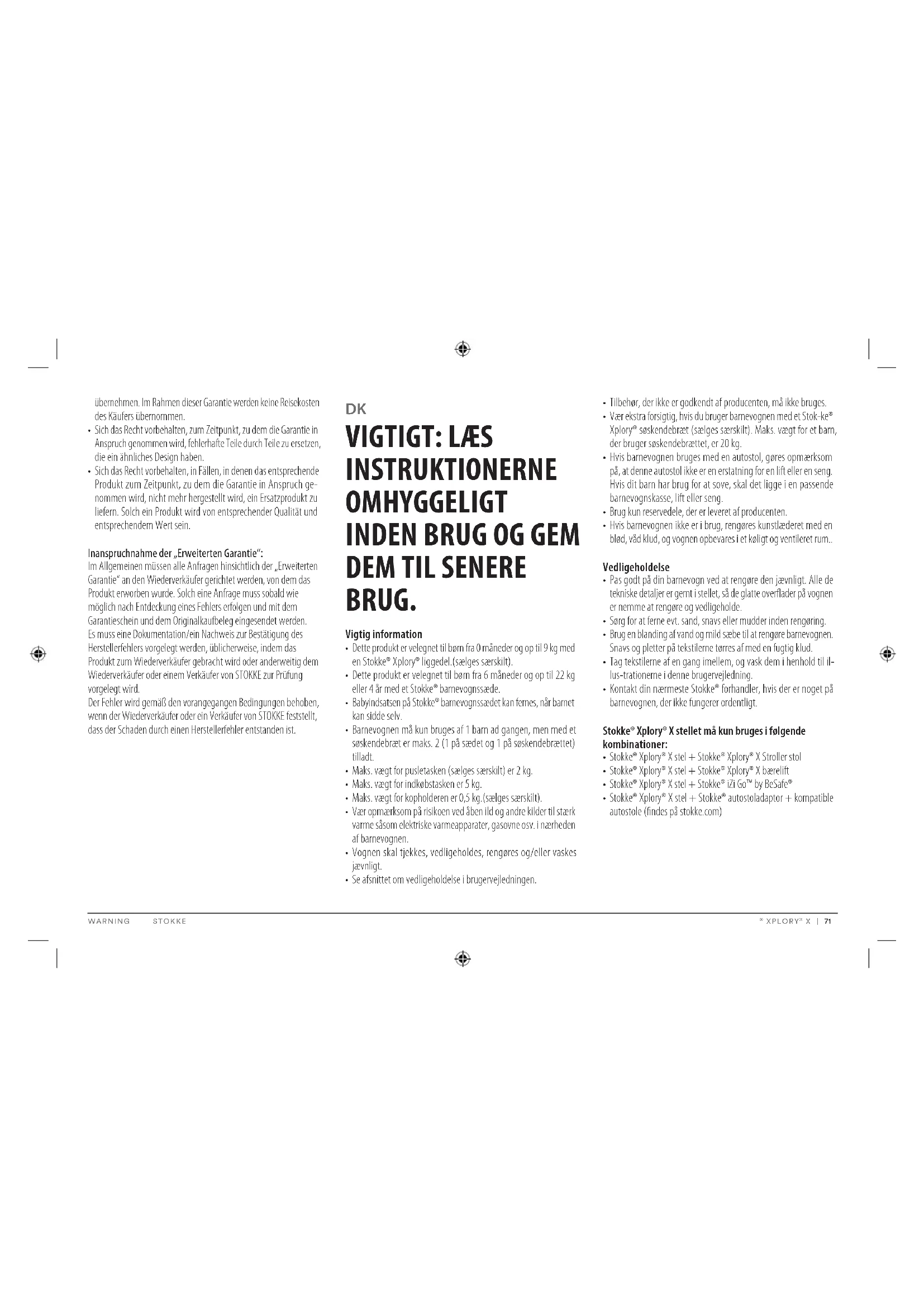 X | 73 Klageret og Udvidet Garanti Gælder over hele verden for Stokke® Xplory® X, herefter benævnt produktet. REKLAMATIONSRET Kunden har reklamationsret i henhold til den til enhver tid gældende brugerbeskyttelseslovgivningen, Denne lovgivning kan variere fra land til land. Generelt yder STOKKE AS ikke yderligere rettigheder udover dem, der er stipuleret af den enhver tid gældende lovgivning, skønt der henvises til den «Udvidede Garanti» beskrevet nedenfor. De rettighedheder, kunden ifølge den til enhver tid gældende forbru- gerbeskyttelseslovgivning har, er et supplement til den «Udvidede Garanti» og påvirkes ikke heraf.