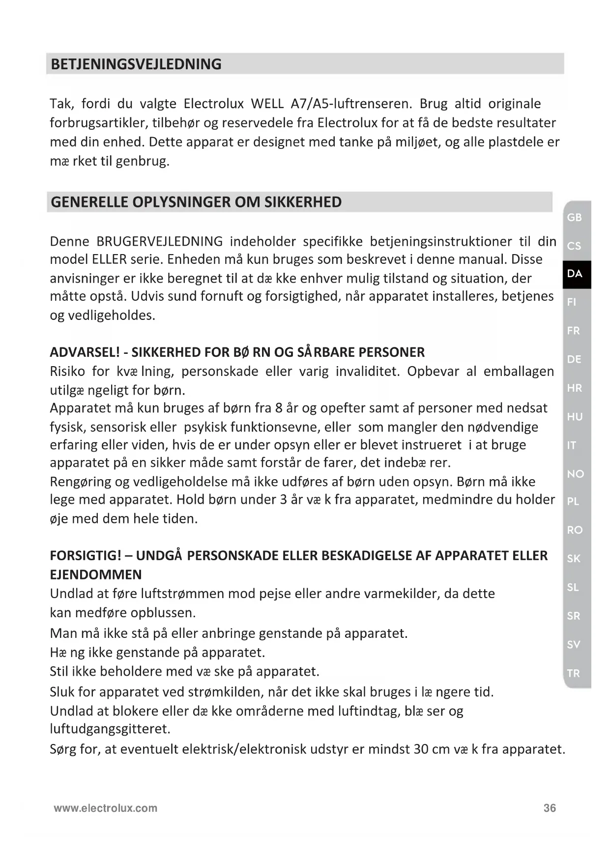 Læ s denne manual omhyggeligt, og væ r sæ rlig opmæ rksom på sikkerhedsoplysningerne. Væ r sæ rlig opmæ rksom på afsnittene markeret med FORSIGTIG! Kontroller, at alle de beskrevne komponenter og de tilhørende dele er der. www.electrolux.com 38VIGTIGE DELE VED WELL A7/A5-LUFTRENSERE