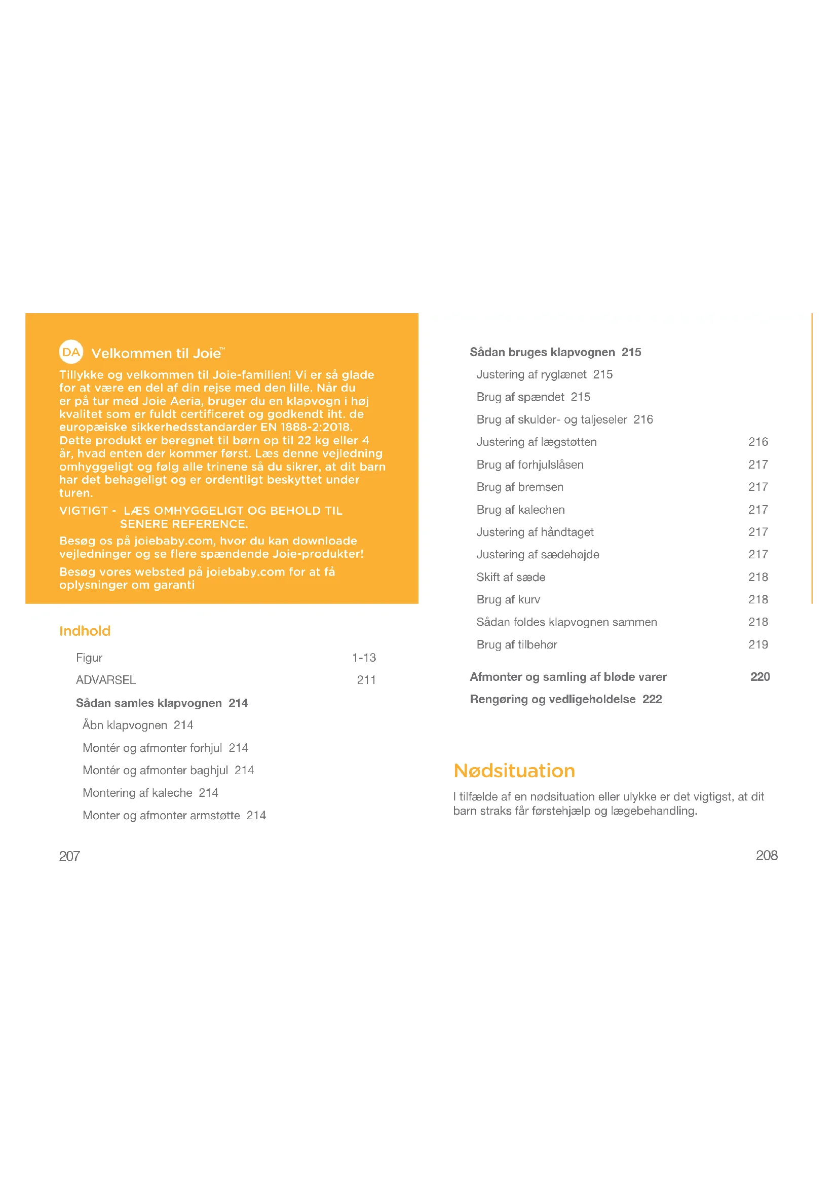 Tillykke og velkommen til Joie-familien! Vi er så glade for at være en del af din rejse med den lille. Når du er på tur med Joie Aeria, bruger du en klapvogn i høj kvalitet som er fuldt certificeret og godkendt iht. de europæiske sikkerhedsstandarder EN 1888-2:2018. Dette produkt er beregnet til børn op til 22 kg eller 4 år, hvad enten der kommer først. Læs denne vejledning omhyggeligt og følg alle trinene så du sikrer, at dit barn har det behageligt og er ordentligt beskyttet under turen. VIGTIGT - LÆS OMHYGGELIGT OG BEHOLD TIL SENERE REFERENCE. Besøg os på joiebaby.com, hvor du kan downloade vejledninger og se flere spændende Joie-produkter! Besøg vores websted på joiebaby.com for at få oplysninger om garanti Indhold Figur 1-13 ADVARSEL 211 Sådan samles klapvognen 214 Åbn klapvognen 214 Montér og afmonter forhjul 214 Montér og afmonter baghjul 214 Montering af kaleche 214 Monter og afmonter armstøtte 214 Sådan bruges klapvognen 215 Justering af ryglænet 215 Brug af spændet 215 Brug af skulder- og taljeseler 216 Justering af lægstøtten 216 Brug af forhjulslåsen 217 Brug af bremsen 217 Brug af kalechen 217 Justering af håndtaget 217 Justering af sædehøjde 217 Skift af sæde 218 Brug af kurv 218 Sådan foldes klapvognen sammen 218 Brug af tilbehør 219 Afmonter og samling af bløde varer 220 Rengøring og vedligeholdelse 222 Nødsituation I tilfælde af en nødsituation eller ulykke er det vigtigst, at dit barn straks får førstehjælp og lægebehandling.209
