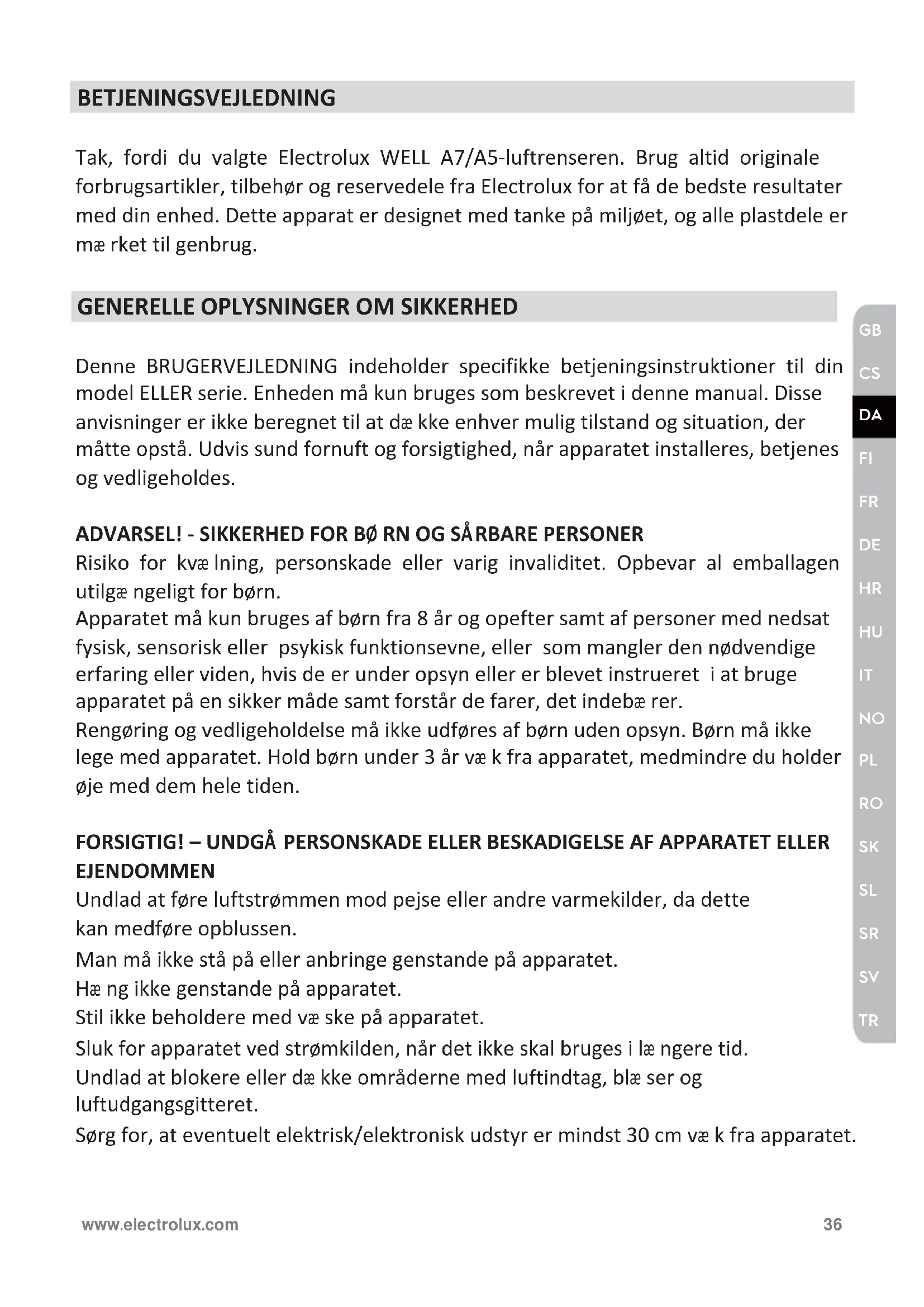 Læ s denne manual omhyggeligt, og væ r sæ rlig opmæ rksom på sikkerhedsoplysningerne. Væ r sæ rlig opmæ rksom på afsnittene markeret med FORSIGTIG! Kontroller, at alle de beskrevne komponenter og de tilhørende dele er der. www.electrolux.com 38VIGTIGE DELE VED WELL A7/A5-LUFTRENSERE