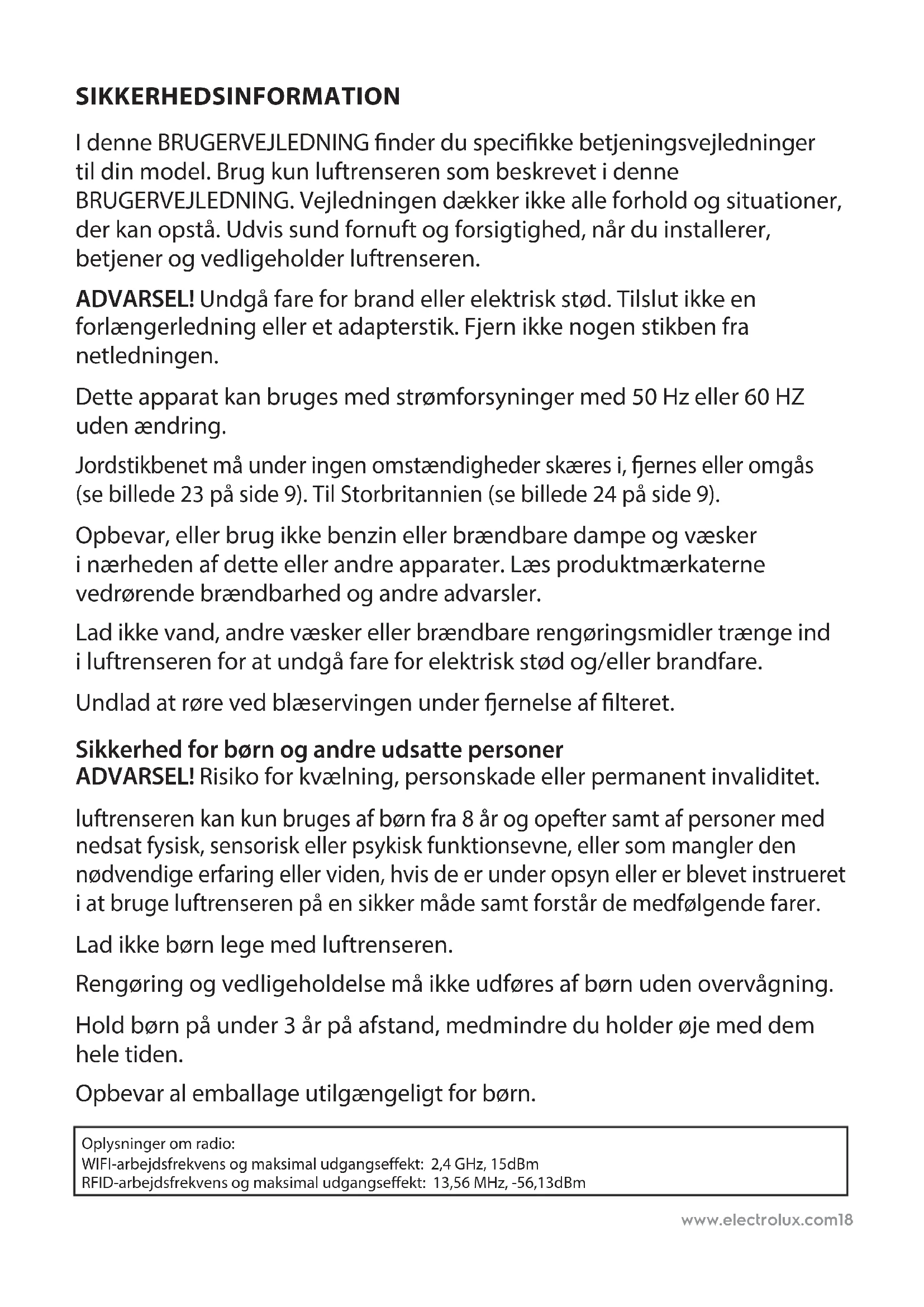 CSwww.electrolux.com18 SIKKERHEDSINFORMATION I denne BRUGERVEJLEDNING nder du specikke betjeningsvejledninger til din model. Brug kun luftrenseren som beskrevet i denne BRUGERVEJLEDNING. Vejledningen dækker ikke alle forhold og situationer, der kan opstå. Udvis sund fornuft og forsigtighed, når du installerer, betjener og vedligeholder luftrenseren. ADVARSEL! Undgå fare for brand eller elektrisk stød. Tilslut ikke en forlængerledning eller et adapterstik. Fjern ikke nogen stikben fra netledningen. Dette apparat kan bruges med strømforsyninger med 50 Hz eller 60 HZ uden ændring. Jordstikbenet må under ingen omstændigheder skæres i, ernes eller omgås (se billede 23 på side 9). Til Storbritannien (se billede 24 på side 9). Opbevar, eller brug ikke benzin eller brændbare dampe og væsker i nærheden af dette eller andre apparater. Læs produktmærkaterne vedrørende brændbarhed og andre advarsler. Lad ikke vand, andre væsker eller brændbare rengøringsmidler trænge ind iluftrenseren for at undgå fare for elektrisk stød og/eller brandfare. Undlad at røre ved blæservingen under ernelse af lteret. Sikkerhed for børn og andre udsatte personer ADVARSEL! Risiko for kvælning, personskade eller permanent invaliditet. luftrenseren kan kun bruges af børn fra 8 år og opefter samt af personer med nedsat fysisk, sensorisk eller psykisk funktionsevne, eller som mangler den nødvendige erfaring eller viden, hvis de er under opsyn eller er blevet instrueret i at bruge luftrenseren på en sikker måde samt forstår de medfølgende farer. Lad ikke børn lege med luftrenseren. Rengøring og vedligeholdelse må ikke udføres af børn uden overvågning. Hold børn på under 3 år på afstand, medmindre du holder øje med dem hele tiden. Opbevar al emballage utilgængeligt for børn. Oplysninger om radio: WIFI-arbejdsfrekvens og maksimal udgangseffekt: 2,4 GHz, 15dBm RFID-arbejdsfrekvens og maksimal udgangseffekt: 13,56 MHz, -56,13dBmwww.electrolux.com 19 Sørg for, at eventuelt elektrisk/elektronisk udstyr bender sig 30 cm fra luftrenseren. BORTSKAFFELSE Dette symbol på produktet eller på emballagen angiver, at produktet ikke må behandles som husholdningsaald. For at genbruge dit produkt skal du bringe det til et ocielt indsamlingssted eller til et Electrolux servicecenter, som kan erne og genbruge batteriet og elektriske dele på en sikker og professionel måde. Følg dit lands regler for separat indsamling af elektriske produkter og genopladelige batterier. Elektriske data ADVARSEL! Undgå fare for brand eller elektrisk stød. Hvis du ikke er sikker på, at kontakten er korrekt jordforbundet eller beskyttet af en tidsforsinket sikring eller en fejlstrømsafbryder, skal du få en kvaliceret elektriker til at installere en korrekt stikkontakt iht. de nationale forskrifter for elektricitet og gældende lokale forskrifter og bestemmelser. Tilslut ikke en forlængerledning eller et adapterstik. Kobl aldrig luftrenseren fra ved at trække i ledningen. Tag altid godt fat i selve stikket, og træk det lige ud af kontakten. Klem, bøj eller slå ikke knuder på netledningen. Skær ikke i, eller beskadig netledningen. Hvis netledningen beskadiges, må den kun udskiftes af en autoriseret Electrolux-tekniker. Denne luftrenser indeholder ingen dele, der kan serviceres af brugeren selv. Tilkald altid en autoriseret Electrolux servicetekniker til reparationer. Hvis netledningen er beskadiget, skal den af sikkerhedsgrunde udskiftes af producenten, dennes serviceværksted eller en tekniker med tilsvarende kvalikationer for at undgå fare. Sørg for at tage stikket ud af stikkontakten inden rengøring for at undgå elektrisk stød eller risiko for brand. Sikkerhedsforanstaltninger FORSIGTIG! Undgå alvorlig ulykke eller dødsfald. Kom ikke ngre eller genstande i luftudledningsområdet eller i luftrenserens rist. Start, eller stop ikke luftrenseren ved at trække stikket ud af kontakten eller slukke for strømmen på el tavlen. I tilfælde af funktionsfejl (gnister, brændt lugt, osv.) skal du stoppe driften øjeblikkeligt, trække stikket ud og ringe til en autoriseret Electrolux-serviceteknikker. Betjen ikke luftrenseren med våde hænder Træk ikke i netledningen. FORSIGTIG! Undgå personskade eller beskadigelse af luftrenseren eller andre ting. Ret ikke luftstrømmen mod pejse eller andre varmerelaterede kilder, da det kan skabe pludselig opblussen. Klatr ikke op på luftrenseren, og anbring ikke genstande på det. Hæng ikke ting ned fra luftrenseren. Stil ikke beholdere med væsker på luftrenseren. Sluk strømkilden til luftrenseren, hvis den ikke skal bruges i en længere periode. Betjen luftrenseren med isat luftlter. Blokér, eller tildæk ikke indsugningsristen, luftudledningsområdet og udgangsportene. DANSK Tak for dit valg af Electrolux luftrenser PURE A9-40/ PURE A9-60. Brug altid originalt tilbehør og originale reservedele for at opnå det bedste resultat. Dette produkt er udviklet med tanke på miljøet. Alle plastdele er mærket til genbrug.