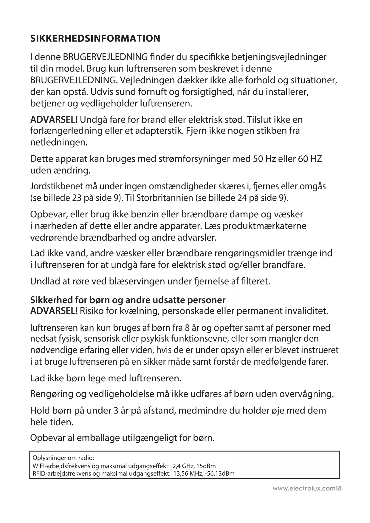 CSwww.electrolux.com18 SIKKERHEDSINFORMATION I denne BRUGERVEJLEDNING nder du specikke betjeningsvejledninger til din model. Brug kun luftrenseren som beskrevet i denne BRUGERVEJLEDNING. Vejledningen dækker ikke alle forhold og situationer, der kan opstå. Udvis sund fornuft og forsigtighed, når du installerer, betjener og vedligeholder luftrenseren. ADVARSEL! Undgå fare for brand eller elektrisk stød. Tilslut ikke en forlængerledning eller et adapterstik. Fjern ikke nogen stikben fra netledningen. Dette apparat kan bruges med strømforsyninger med 50 Hz eller 60 HZ uden ændring. Jordstikbenet må under ingen omstændigheder skæres i, ernes eller omgås (se billede 23 på side 9). Til Storbritannien (se billede 24 på side 9). Opbevar, eller brug ikke benzin eller brændbare dampe og væsker i nærheden af dette eller andre apparater. Læs produktmærkaterne vedrørende brændbarhed og andre advarsler. Lad ikke vand, andre væsker eller brændbare rengøringsmidler trænge ind iluftrenseren for at undgå fare for elektrisk stød og/eller brandfare. Undlad at røre ved blæservingen under ernelse af lteret. Sikkerhed for børn og andre udsatte personer ADVARSEL! Risiko for kvælning, personskade eller permanent invaliditet. luftrenseren kan kun bruges af børn fra 8 år og opefter samt af personer med nedsat fysisk, sensorisk eller psykisk funktionsevne, eller som mangler den nødvendige erfaring eller viden, hvis de er under opsyn eller er blevet instrueret i at bruge luftrenseren på en sikker måde samt forstår de medfølgende farer. Lad ikke børn lege med luftrenseren. Rengøring og vedligeholdelse må ikke udføres af børn uden overvågning. Hold børn på under 3 år på afstand, medmindre du holder øje med dem hele tiden. Opbevar al emballage utilgængeligt for børn. Oplysninger om radio: WIFI-arbejdsfrekvens og maksimal udgangseffekt: 2,4 GHz, 15dBm RFID-arbejdsfrekvens og maksimal udgangseffekt: 13,56 MHz, -56,13dBmwww.electrolux.com 19 Sørg for, at eventuelt elektrisk/elektronisk udstyr bender sig 30 cm fra luftrenseren. BORTSKAFFELSE Dette symbol på produktet eller på emballagen angiver, at produktet ikke må behandles som husholdningsaald. For at genbruge dit produkt skal du bringe det til et ocielt indsamlingssted eller til et Electrolux servicecenter, som kan erne og genbruge batteriet og elektriske dele på en sikker og professionel måde. Følg dit lands regler for separat indsamling af elektriske produkter og genopladelige batterier. Elektriske data ADVARSEL! Undgå fare for brand eller elektrisk stød. Hvis du ikke er sikker på, at kontakten er korrekt jordforbundet eller beskyttet af en tidsforsinket sikring eller en fejlstrømsafbryder, skal du få en kvaliceret elektriker til at installere en korrekt stikkontakt iht. de nationale forskrifter for elektricitet og gældende lokale forskrifter og bestemmelser. Tilslut ikke en forlængerledning eller et adapterstik. Kobl aldrig luftrenseren fra ved at trække i ledningen. Tag altid godt fat i selve stikket, og træk det lige ud af kontakten. Klem, bøj eller slå ikke knuder på netledningen. Skær ikke i, eller beskadig netledningen. Hvis netledningen beskadiges, må den kun udskiftes af en autoriseret Electrolux-tekniker. Denne luftrenser indeholder ingen dele, der kan serviceres af brugeren selv. Tilkald altid en autoriseret Electrolux servicetekniker til reparationer. Hvis netledningen er beskadiget, skal den af sikkerhedsgrunde udskiftes af producenten, dennes serviceværksted eller en tekniker med tilsvarende kvalikationer for at undgå fare. Sørg for at tage stikket ud af stikkontakten inden rengøring for at undgå elektrisk stød eller risiko for brand. Sikkerhedsforanstaltninger FORSIGTIG! Undgå alvorlig ulykke eller dødsfald. Kom ikke ngre eller genstande i luftudledningsområdet eller i luftrenserens rist. Start, eller stop ikke luftrenseren ved at trække stikket ud af kontakten eller slukke for strømmen på el tavlen. I tilfælde af funktionsfejl (gnister, brændt lugt, osv.) skal du stoppe driften øjeblikkeligt, trække stikket ud og ringe til en autoriseret Electrolux-serviceteknikker. Betjen ikke luftrenseren med våde hænder Træk ikke i netledningen. FORSIGTIG! Undgå personskade eller beskadigelse af luftrenseren eller andre ting. Ret ikke luftstrømmen mod pejse eller andre varmerelaterede kilder, da det kan skabe pludselig opblussen. Klatr ikke op på luftrenseren, og anbring ikke genstande på det. Hæng ikke ting ned fra luftrenseren. Stil ikke beholdere med væsker på luftrenseren. Sluk strømkilden til luftrenseren, hvis den ikke skal bruges i en længere periode. Betjen luftrenseren med isat luftlter. Blokér, eller tildæk ikke indsugningsristen, luftudledningsområdet og udgangsportene. DANSK Tak for dit valg af Electrolux luftrenser PURE A9-40/ PURE A9-60. Brug altid originalt tilbehør og originale reservedele for at opnå det bedste resultat. Dette produkt er udviklet med tanke på miljøet. Alle plastdele er mærket til genbrug.
