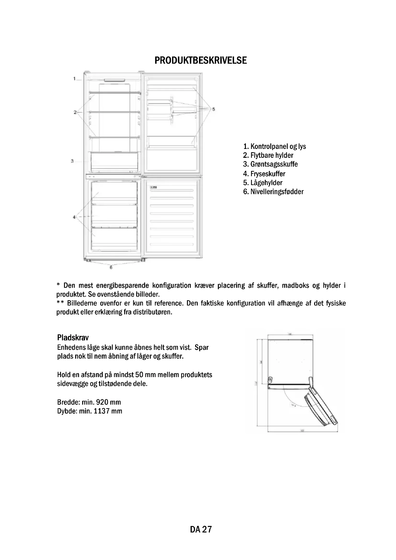 - Den mest energibesparende konfiguration kræver placering af skuffer, madboks og hylder i produktet. Se ovenstående billeder. ** Billederne ovenfor er kun til reference. Den faktiske konfiguration vil afhænge af det fysiske produkt eller erklæring fra distributøren. Pladskrav Enhedens låge skal kunne åbnes helt som vist. Spar plads nok til nem åbning af låger og skuffer. Hold en afstand på mindst 50 mm mellem produktets sidevægge og tilstødende dele. Bredde: min. 920 mm Dybde: min. 1137 mmDA 28 BRUG ➀ TÆND/SLUK-knap, der bruges til at tænde/slukke for apparatet. ➁ SET-tast, der bruges til at vælge køleskabstemperatur eller særlige funktioner som. ➂ Wi-Fi-ikon, viser, om apparatet er tilsluttet appen. ➃ Super Cool-ikon, viser, om funktionen er aktiveret. ➄ Temperaturniveauer, viser hvilken temperatur der er valgt. Brug