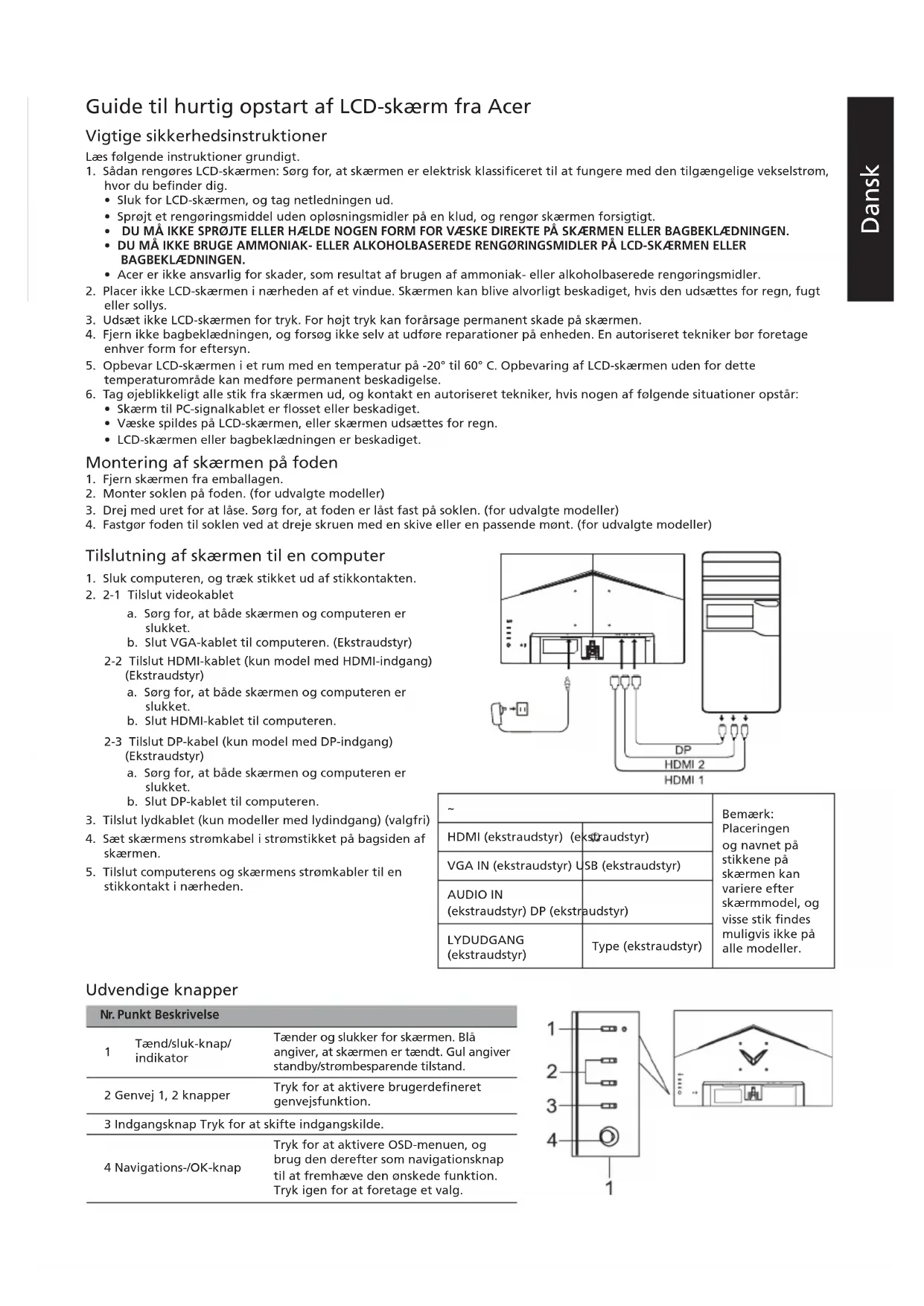 HDMI (kun model med HDMI-indgang) (ekstraudstyr) Højttalere 2 W x 2 (kun model med lydindgang) (ekstraudstyr) Maksimal skærmstørrelse Vandret: 527 mm Lodret: 296 mm Strømkilde INDGANG: 100-240 V~ 50/60 Hz Miljøhensyn Driftstemperatur: 0° til 40° C Opbevaringsgtemp.: -20° til 60° C Luftfugtighed ved drift: 20 % til 80 % Mål 540,3 (B) × 412,1 (H) × 221,3 (D) mm Vægt (N. W.) 3,00 kg (netto) Funktionsspecikationer Hældning: -5° til +20° Drejning: Nej Højdeindstilling: Nej Drejetap: Nej Aftagelig fod: Ja Udvendige knapper Knapper Tænd/sluk-knap Genvej 1 Genvej 2 Indgang Menu/Navigations/OK Funktioner Lysstyrke Kontrast Blåt lys Mørkeforstærkning ACM HDR Super skarphed Gamma Farvetemperatur Tilstande Farverummet Gråskala-tilstand 6-akset nuance 6-akset mætning Lydstyrke Lydløs Overgear FreeSync Premium VRB Ultralav latens Opdateringshastighed Sigtepunkt Sprog OSD-timeout Gennemsigtighed OSD-lås Indgang Automatisk kilde Bred tilstand Tildeling af genvejstast DDC/CI HDMI sort niveau Hurtig opstart Oplysninger Nulstil alle indstillinger Specikationerne kan variere afhængigt af model og/eller region. Find vejledninger og andre dokumenter til dit Acer-produkt på Acers ofcielle support-websted. *Årligt energiforbrug er beregnet på baggrund af det typiske strømforbrug i 4 timer om dagen, 365 dage om året.Suomi Acer-LCD-näytön pika-asennusopas Tärkeitä turvaohjeita Lue seuraavat ohjeet huolellisesti.