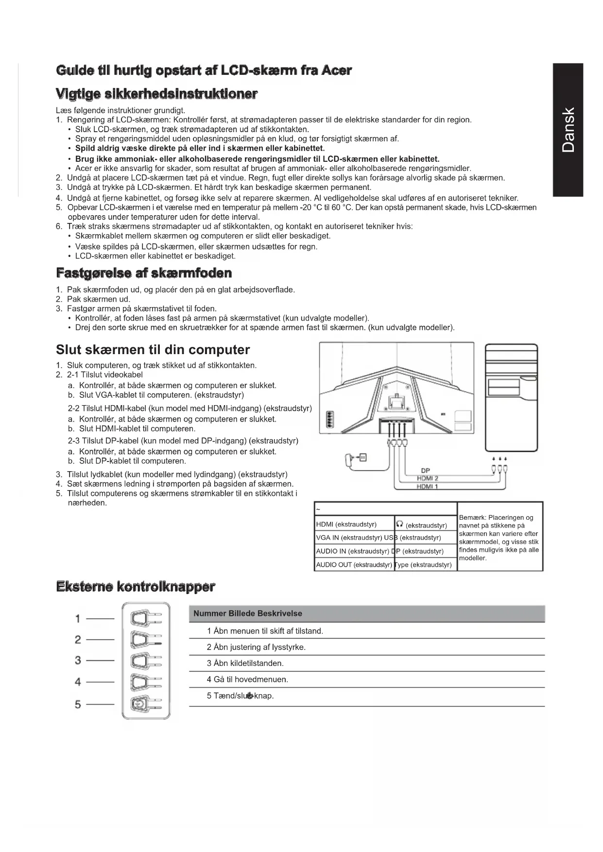 Bemærk: Placeringen og navnet på stikkene på skærmen kan variere efter skærmmodel, og visse stik findes muligvis ikke på alle modeller. HDMI (ekstraudstyr) (ekstraudstyr) VGA IN (ekstraudstyr) USB (ekstraudstyr) AUDIO IN (ekstraudstyr) DP (ekstraudstyr) AUDIO OUT (ekstraudstyr) Type (ekstraudstyr) Eksterne kontrolknapper Nummer Billede Beskrivelse 1 Åbn menuen til skift af tilstand. 2 Åbn justering af lysstyrke. 3 Åbn kildetilstanden. 4 Gå til hovedmenuen. 5 Tænd/sluk-knap.Dansk Lovgivningsmæssige erklæringer og sikkerhedserklæringer FCC-erklæring Udstyret er afprøvet og overholder grænserne for digitale enheder i klasse B i henhold til del 15 i FCC-reglerne. Grænserne er beregnet til at give rimelig beskyttelse mod skadelig interferens, når udstyret er installeret i boligområder. Udstyret genererer, bruger, kan udstråle radiofrekvensenergi og kan, hvis det ikke er installeret og anvendes i overensstemmelse med anvisningerne, forårsage interferens for radiokommunikation. Der er imidlertid ingen garanti for, at interferens ikke kan opstå i en bestemt installation. Hvis enheden forårsager interferens for modtagelse af radio- og tv-signaler (hvilket kan afgøres med koblingsudstyret), anbefales det, at brugeren afhjælper interferensen på en eller flere af følgende måder: