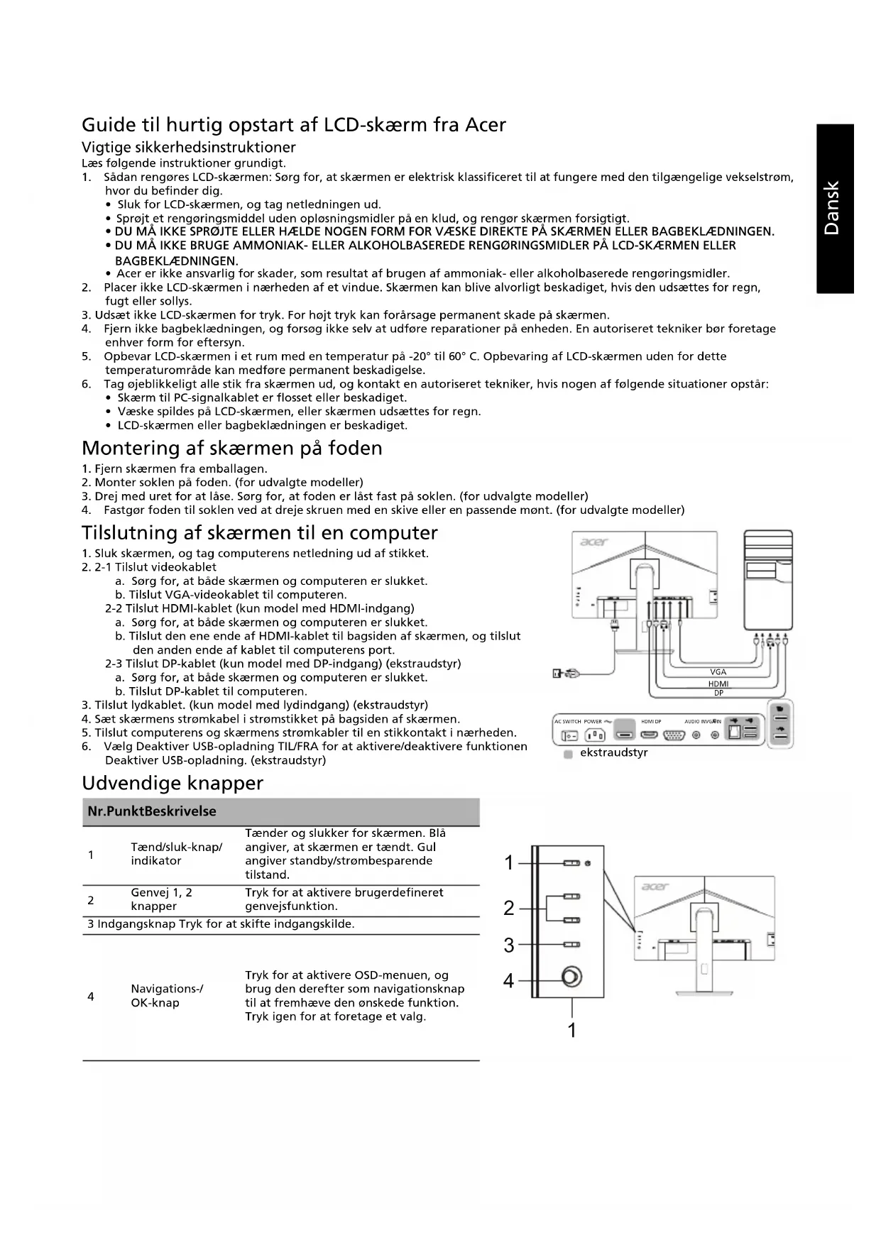 Tilslutning af skærmen til en computer 1. Sluk skærmen, og tag computerens netledning ud af stikket.2. 2-1 Tilslut videokableta. Sørg for, at både skærmen og computeren er slukket.b. Tilslut VGA-videokablet til computeren. 2-2 Tilslut HDMI-kablet (kun model med HDMI-indgang)a. Sørg for, at både skærmen og computeren er slukket.b. Tilslut den ene ende af HDMI-kablet til bagsiden af skærmen, og tilslut den anden ende af kablet til computerens port.2-3 Tilslut DP-kablet (kun model med DP-indgang) (ekstraudstyr)a. Sørg for, at både skærmen og computeren er slukket.b. Tilslut DP-kablet til computeren.3. Tilslut lydkablet. (kun model med lydindgang) (ekstraudstyr)4. Sæt skærmens strømkabel i strømstikket på bagsiden af skærmen.5. Tilslut computerens og skærmens strømkabler til en stikkontakt i nærheden.