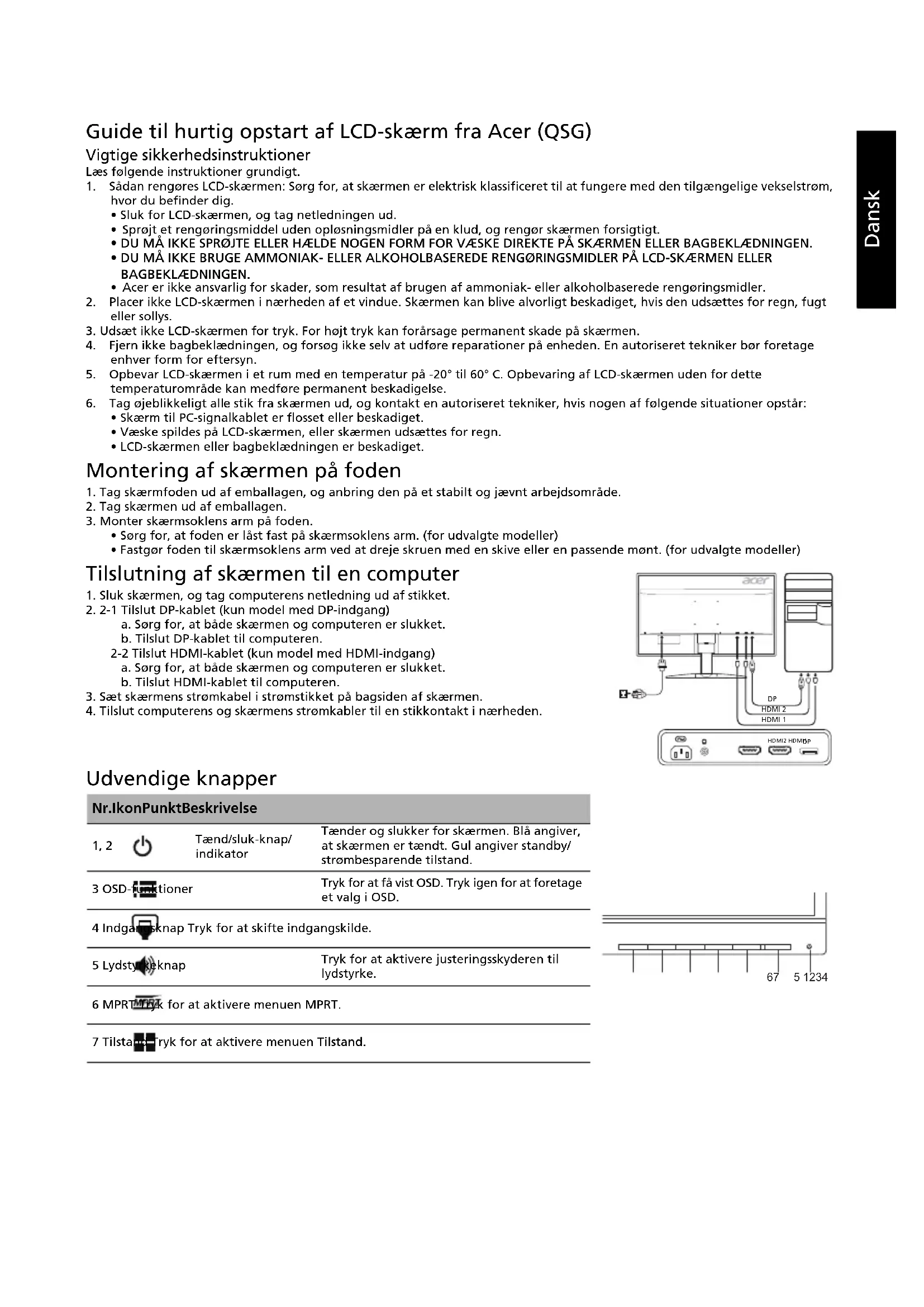 Udvendige knapper Nr. Ikon Punkt Beskrivelse 1, 2 Tænd/sluk-knap/ indikator Tænder og slukker for skærmen. Blå angiver, at skærmen er tændt. Gul angiver standby/ strømbesparende tilstand. 3 OSD-funktioner Tryk for at få vist OSD. Tryk igen for at foretage et valg i OSD. 4 Indgangsknap Tryk for at skifte indgangskilde. 5 Lydstyrkeknap Tryk for at aktivere justeringsskyderen til lydstyrke. 6 MPRT Tryk for at aktivere menuen MPRT. 7 Tilstand Tryk for at aktivere menuen Tilstand. HDMI 2 HDMI 1 HDMI2 HDMI1 1234567Dansk Regler og sikkerhedsforskrifter FCC-forskrifter Denne enhed er blevet testet og fundet i overensstemmelse med grænserne for en digital enhed i klasse B i henhold til afsnit 15 i FCC-reglerne. Disse grænser er fastsat for at yde rimelig beskyttelse mod skadelig interferens i beboelsesinstallationer. Denne enhed genererer, bruger og kan udstråle radiofrekvensenergi. Hvis produktet ikke installeres og bruges i overensstemmelse med instruktionerne, kan det forårsage skadelig interferens for radiokommunikation. Der er dog ingen garanti for, at interferens ikke vil forekomme i en bestemt installation. Hvis denne enhed forårsager skadelig interferens ved radio- eller tv-modtagelse, hvilket kan fastslås ved at slukke for enheden og tænde den igen, opfordres brugeren til at forsøge at afhjælpe interferensen ved en eller flere af følgende foranstaltninger: Juster eller flyt modtagerantennen. Forøg afstanden mellem enheden og modtageren. Slut enheden til en stikkontakt på et andet kredsløb end det, modtageren er tilsluttet. Kontakt forhandleren eller en erfaren radio/tv-tekniker for at få hjælp. CE-overensstemmelseserklæring Acer Inc. erklærer herved, at denne LCD-skærm overholder de væsentlige krav og andre relevante bestemmelser i EMC-direktivet 2014/30/EU, lavspændingsdirektivet 2014/35/EU og RoHS-direktivet 2011/65/EU og direktiv 2009/125/EF om rammerne for fastlæggelse af krav til miljøvenligt design af energirelaterede produkter. Bemærk: Løft ikke skærmen i dens fod for at undgå at beskadige skærmen. Bemærk: Afskærmede kabler Alle forbindelser til andre computerenheder skal foretages med afskærmede kabler for at overholde EMC-reglerne. Bemærk: Eksterne enheder Kun eksterne enheder (indgående/udgående enheder, terminaler, printere osv.), som er certificeret i overensstemmelse med klasse B-grænserne, må tilsluttes dette udstyr. Brug af ikke-certificerede enheder forventes at medføre interferens i radio- og tv-modtagelse. Forsigtig Ændringer eller modifikationer, som ikke er udtrykkeligt godkendt af producenten, kan ugyldiggøre brugerens ret, som er ydet af FCC (Federal Communications Commission), til at bruge dette produkt. Driftsbetingelser Denne enhed overholder afsnit 15 i FCC-reglerne. Driften er underlagt følgende to betingelser: (1) denne enhed må ikke forårsage skadelig interferens, og (2) enheden skal acceptere modtaget interferens, herunder interferens, der kan forårsage uønsket drift. Bemærk: Canadiske brugere Denne digitale enhed i klasse B overholder den canadiske ICES-003. Remarque à l'intention des utilisateurs canadiens Cet appareil numérique de la classe B est conforme à la norme NMB-003 du Canada. Bortskaffelse af udstyr af brugere i private husholdninger i den Europæiske Union Dette symbol på produktet eller emballagen angiver, at dette produkt ikke må bortskaffes sammen med det øvrige husholdningsaffald. I stedet er det dit ansvar at bortskaffe udstyret ved at aflevere det på et angivet indsamlingssted for genanvendelse af elektrisk og elektronisk udstyr. Separat indsamling og genanvendelse af udstyret er med til at bevare naturlige ressourcer og sikre, at det genbruges på en måde, der beskytter menneskers sundhed og miljøet. For flere oplysninger om, hvor du kan aflevere dit udstyr til genbrug, skal du kontakte din kommune, dit renovationsselskab eller den butik, hvor du købte produktet.Dansk SPECIFIKATIONER Find vejledninger og andre dokumenter til dit Acer-produkt på Acers officielle support-websted. *Årligt energiforbrug er beregnet på baggrund af det typiske strømforbrug i 4 timer om dagen, 365 dage om året. LCD-panel Driversystem TFT farve-LCD Størrelse 23,8”W (60 cm) Pixelafstand: 0,2058 mm (H) x 0,2058 mm (V) Lysstyrke 350 cd/m