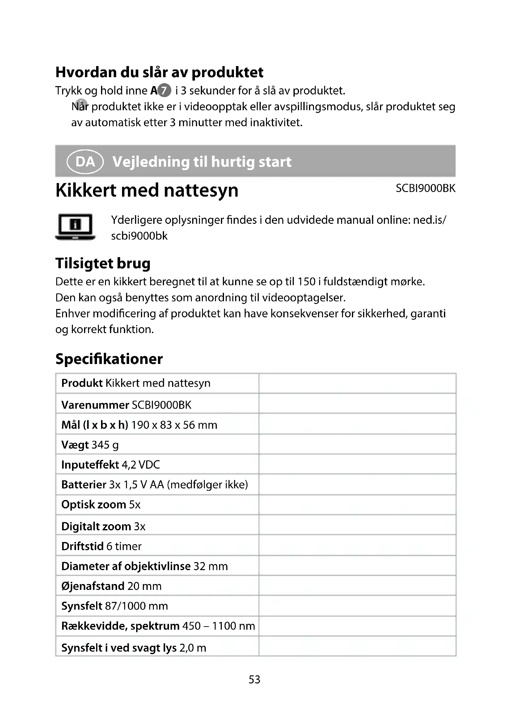 Vejledning til hurtig start Kikkert med nattesyn SCBI9000BKYderligere oplysninger ndes i den udvidede manual online: ned.is/scbi9000bk Tilsigtet brug Dette er en kikkert beregnet til at kunne se op til 150 i fuldstændigt mørke.Den kan også benyttes som anordning til videooptagelser.Enhver modicering af produktet kan have konsekvenser for sikkerhed, garanti og korrekt funktion. Specikationer Produkt Kikkert med nattesynVarenummer SCBI9000BKMål (l x b x h) 190 x 83 x 56 mmVægt 345 gInputeekt 4,2 VDCBatterier 3x 1,5 V AA (medfølger ikke)Optisk zoom 5xDigitalt zoom 3xDriftstid 6 timerDiameter af objektivlinse 32 mmØjenafstand 20 mmSynsfelt 87/1000 mmRækkevidde, spektrum 450 – 1100 nmSynsfelt i ved svagt lys 2,0 m54 Synsfelt i totalt mørke 100 - 150 m Mindste arbejdsbelysning 0,001 Lux IR lysjustering 9 niveauer Fokuslængde 57 mm Videoopløsning 640 x 480 pixel Fotoopløsning 0.3 MP Mikro SD-kort 4 - 32 GB (klasse 10) (ikke inkluderet) Forbindelser Mini USB, 3,5 mm AV-udgang Hoveddele (billede A) 1 Dæksel til objektivlinse 2 Fokusring 3 Håndrem 4 Ned-knap 5 Op-knap 6 Funktions-knap 7 Knappen Power 8 Dioptrimærke 9 Linse q Dioptriring w Hjælpebelysning e Pic-skinne r Tripod-stander t Mini USB-port y Videooverførselsport u Sprække til mikro SD-kort i Batteridæksel Symboler (billede B) 1 Batteriniveauindikator 2 Indikator for kameratilstand 3 Tilgængelig lagring til billeder eller video 4 MicroSD-kortindikator Sikkerhedsinstruktioner