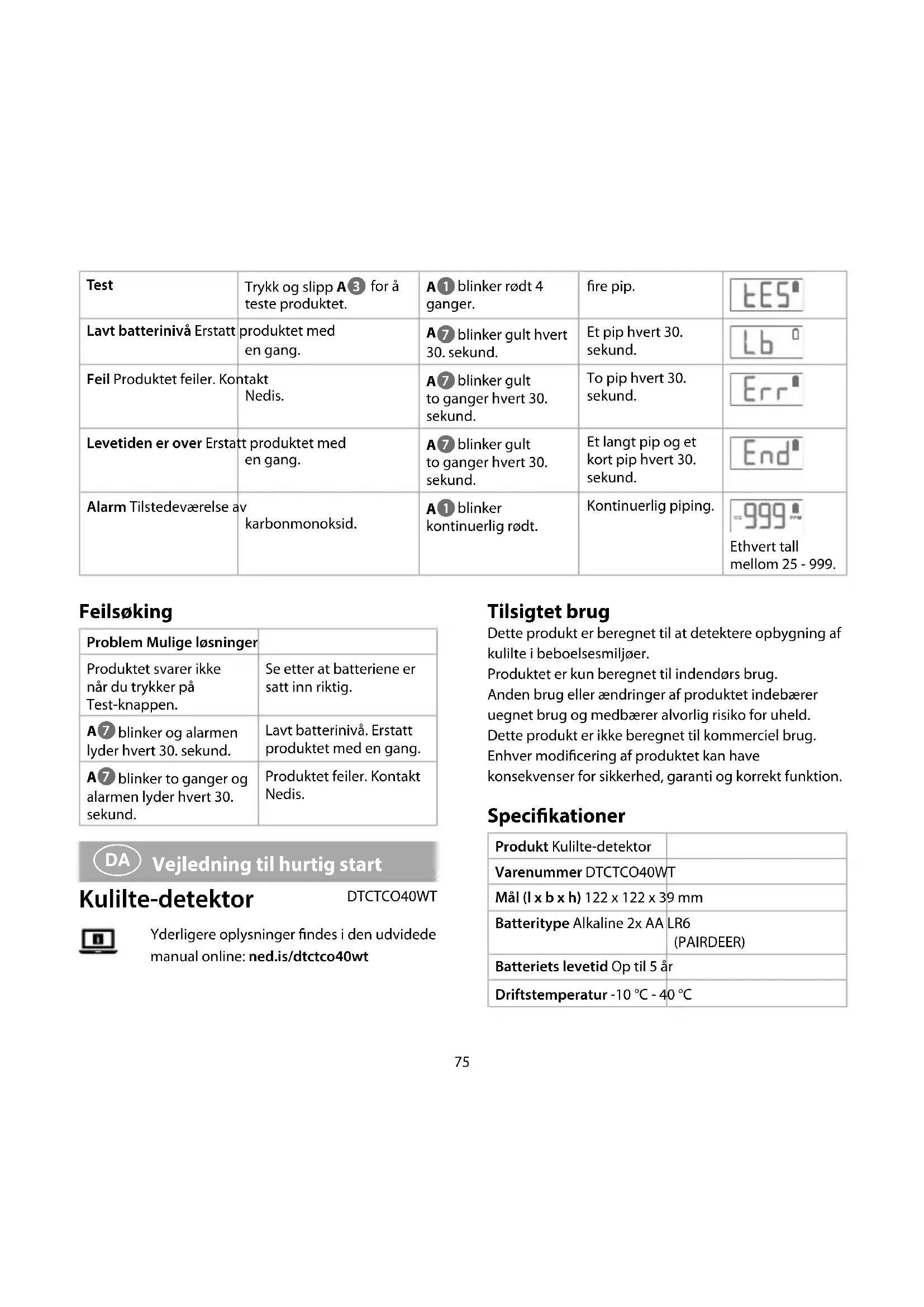 Vejledning til hurtig start Kulilte-detektor DTCTCO40WT Yderligere oplysninger ndes i den udvidede manual online: ned.is/dtctco40wt Tilsigtet brug Dette produkt er beregnet til at detektere opbygning af kulilte i beboelsesmiljøer. Produktet er kun beregnet til indendørs brug. Anden brug eller ændringer af produktet indebærer uegnet brug og medbærer alvorlig risiko for uheld. Dette produkt er ikke beregnet til kommerciel brug. Enhver modicering af produktet kan have konsekvenser for sikkerhed, garanti og korrekt funktion. Specikationer Produkt Kulilte-detektor Varenummer DTCTCO40WT Mål (l x b x h) 122 x 122 x 39 mm Batteritype Alkaline 2x AA LR6 (PAIRDEER) Batteriets levetid Op til 5 år Driftstemperatur -10 °C - 40 °C76 Sensorens levetid Op til 10 år Alarmstyrke >85 dB @ 3 m Alarmudgang Visuel og hørbar indikation Opvarmningsperiode Ca. 100 sekunder Monteringsmetode Væg- eller loftmontering Test/dæmp-knap Ja Alarm ved lavt batteri Ja Detekterbar ppm 20 – 999 ppm Driftsfugtighed 0% – 95% (RH) ikke-kondenserende Hoveddele (billede A) 1 Alarmindikator 2 Strømindikator 3 Test/dæmp-knap 4 Skærm 5 Alarm 6 Beslag 7 Fejlindikator 8 Batterier (2x) 9 Skruer (2x) q Stik (2x) Sikkerhedsinstruktioner