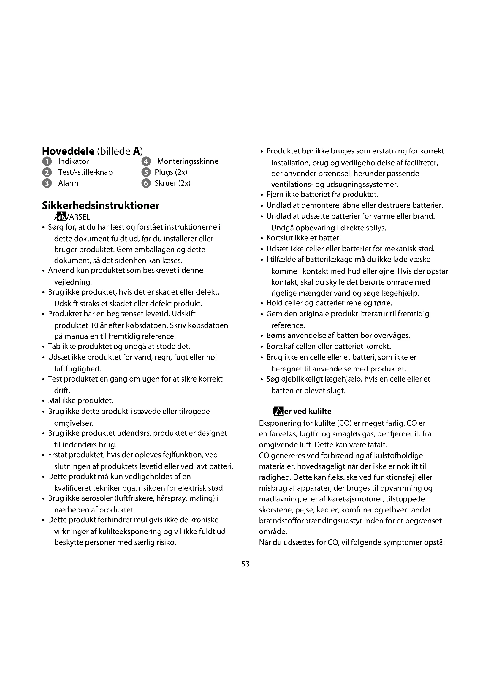- Dette produkt forhindrer muligvis ikke de kroniske virkninger af kulilteeksponering og vil ikke fuldt ud beskytte personer med særlig risiko.