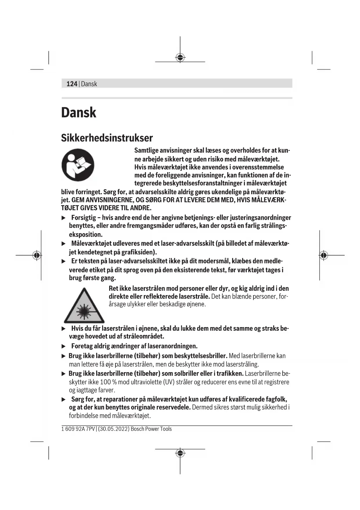 Opladning af lithium-ion-akku u Udfør opladningen med en USB-strømforsyning, hvis tekniske data (spænding og lade- strøm) svarer til den anbefalede strømforsyning. Følg betjeningsvejledningen til USB- strømforsyningen. Anbefalet strømforsyning: Se tekniske data. u Kontroller netspændingen! Strømkildens spænding skal stemme overens med angi- velserne på stikstrømforsyningens typeskilt. Stikstrømforsyninger til 230V kan også tilsluttes 220V. Lithium-ion-akkuer udleveres delvis opladet på grund af internationale transport- forskrifter. For at sikre at akkuen fungerer 100%, skal du oplade akkuen helt i op- laderen før første ibrugtagning. Du kan finde yderligere oplysninger i onlineudgaven af brugsanvisningen: www.bosch-pt.com/manuals Brug Ibrugtagning u Lad ikke det tændte måleværktøj være uden opsyn, og sluk måleværktøjet efter brug. Andre personer kan blive blændet af laserstrålen. u Beskyt måleværktøjet mod fugt og direkte sollys. u Udsæt ikke måleværktøjet for ekstreme temperaturer eller temperatursvingnin- ger. Lad det f.eks. ikke ligge i længere tid i bilen. Ved større temperatursvingninger skal måleværktøjets temperatur tilpasse sig, før det tages i brug. Ved ekstreme temperatu- rer eller temperatursvingninger kan måleværktøjets præcision påvirkes. u Undgå, at måleværktøjet udsættes for kraftige stød eller tabes. Hvis måleværktøjet har været udsat for kraftige ydre påvirkninger, bør du altid foretage en nøjagtigheds- kontrol (se "Nøjagtighedskontrol", Side137), før du fortsætter arbejdet. Bosch Power Tools 1 609 92A 7PV | (30.05.2022)132 | Dansk Tænd/sluk Tryk på knappen for at tænde måleværktøj og laser. Du kan også tænde måleværktøjet uden laser ved at trykke på knappen . Hold knappen inde for at slukke måleværktøjet. De værdier og indstillinger, der findes i hukommelsen, bevares. Kamera Tryk på knappen / for at tænde eller slukke for kameraet. Den valgte tilstand gemmes, når måleværktøjet slukkes. Ved større afstande (ca. >5m) vises der yderligere en målmarkering for at markere måle- punktet. Du kan finde yderligere oplysninger i onlineudgaven af brugsanvisningen: www.bosch-pt.com/manuals Måleprocedure Når måleværktøjet er tændt, er funktionen Længdemåling aktiveret. Efter at måleværktøjet er tændt, er bagkanten af måleværktøjet valgt som referenceniveau for målingen. Du kan ændre referenceniveauet. (se "Vælg referenceniveau", Side133) Anbring måleværktøjet på det ønskede startpunkt for målingen (f.eks. en væg). Tryk på knappen for at foretage målingen. Efter målingen slukkes laserstrålen. Gentag denne procedure for at foretage endnu en må- ling. Måleværdier og slutresultater kan adderes og subtraheres. Hvis du har aktiveret laserstrålen permanent og anvender konstant måling, starter må- lingen allerede, første gang du trykker på knappen . Den permanent aktiverede laserstråle slukkes ikke efter målingen Permanent laserstråle. Du kan finde yderligere oplysninger i onlineudgaven af brugsanvisningen: www.bosch-pt.com/manuals Måleværktøjet må ikke bevæges, mens der måles. Anbring derfor helst måleværk- tøjet op ad en fast anslags- eller underlagsflade. 1 609 92A 7PV | (30.05.2022) Bosch Power ToolsDansk | 133 Modtagelinsen(20), laserstrålingens udgang(21) og kameraet(22) må ikke være tildækket ved måling. Vælg referenceniveau Til målingen kan du vælge mellem tre forskellige referenceniveauer: Bagkanten af måleværktøjet (f.eks. ved anbringelse mod vægge) Spidsen på anslagspladen, der er vippet 180°(f.eks. ved målinger omkring hjørner) Forkanten af måleværktøjet (f.eks. ved måling fra en bordkant) Midten af stativgevindet (19) (f.eks. til målinger med stativ) Du kan finde yderligere oplysninger i onlineudgaven af brugsanvisningen: www.bosch-pt.com/manuals Menuen Grundindstillinger I menuen Grundindstillinger finder du følgende grundindstillinger: – Tænd/sluk Bluetooth® – Skift af referenceniveau (se "Vælg referenceniveau", Side133) – Timerfunktion – Aktivering/deaktivering af permanent laserstråle – Kalibrering af hældningsmåling (se "Nøjagtighedskontrol", Side137) – Kalibrering af målvisning – Sletning af hukommelse (GLM 150-27 C) – Indstilling af sprog – Indstilling af dato og klokkeslæt – Skift af måleenhed – Udskiftning af vinkelenhed Bosch Power Tools 1 609 92A 7PV | (30.05.2022)134 | Dansk – Aktivering af PRO360 – Åbn enhedsoplysninger – Tænd/sluk lydsignaler – Indstilling af slukningstid – Indstilling af dæmpningstid – Indstilling af displayets lysstyrke – Tænd/sluk automatisk skærmdrejning Tryk kort på knappen , eller hold knappen inde for at åbne menuen Grun- dindstillinger . Vælg den ønskede indstilling med knappen eller knappen . Tryk på knappen for at bekræfte et valg. Hvis du vil forlade menuen Grundindstillinger , skal du trykke på knappen eller knappen . Du kan finde yderligere oplysninger i onlineudgaven af brugsanvisningen: www.bosch-pt.com/manuals Målefunktioner Vælg/tilpas målefunktioner I funktionsmenuen finder du følgende funktioner: – Længdemåling – Flademåling – Volumenmåling – Indirekte afstandsmåling