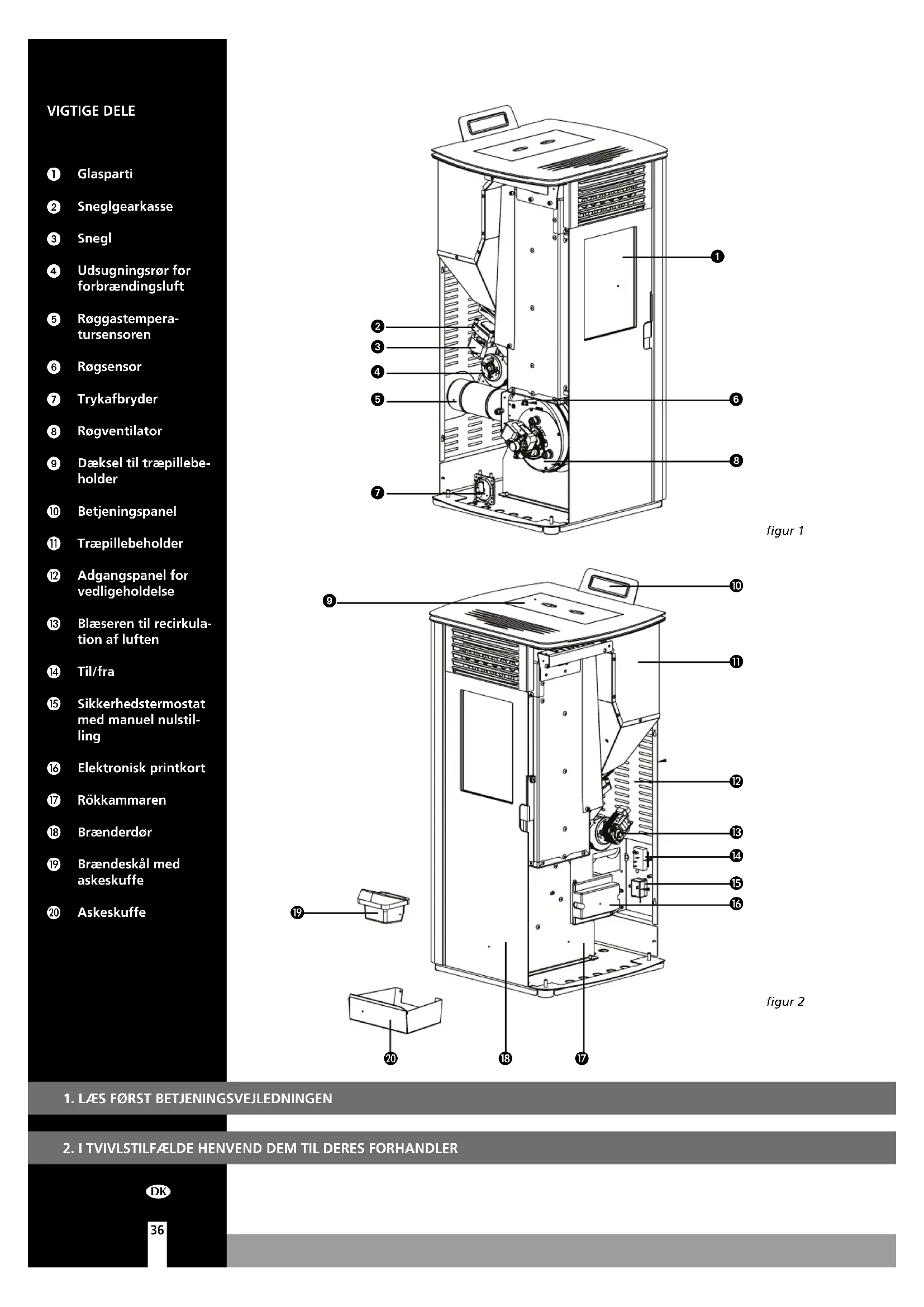 VIGTIGE DELE Glasparti Sneglgearkasse Snegl Udsugningsrør for forbrændingsluft Røggastempera- tursensoren Røgsensor Trykafbryder Røgventilator Dæksel til træpillebe- holder Betjeningspanel Træpillebeholder Adgangspanel for vedligeholdelse Blæseren til recirkula- tion af luften Til/fra Sikkerhedstermostat med manuel nulstil- ling Elektronisk printkort Rökkammaren Brænderdør Brændeskål med askeskuffe Askeskuffe figur 2 figur 1