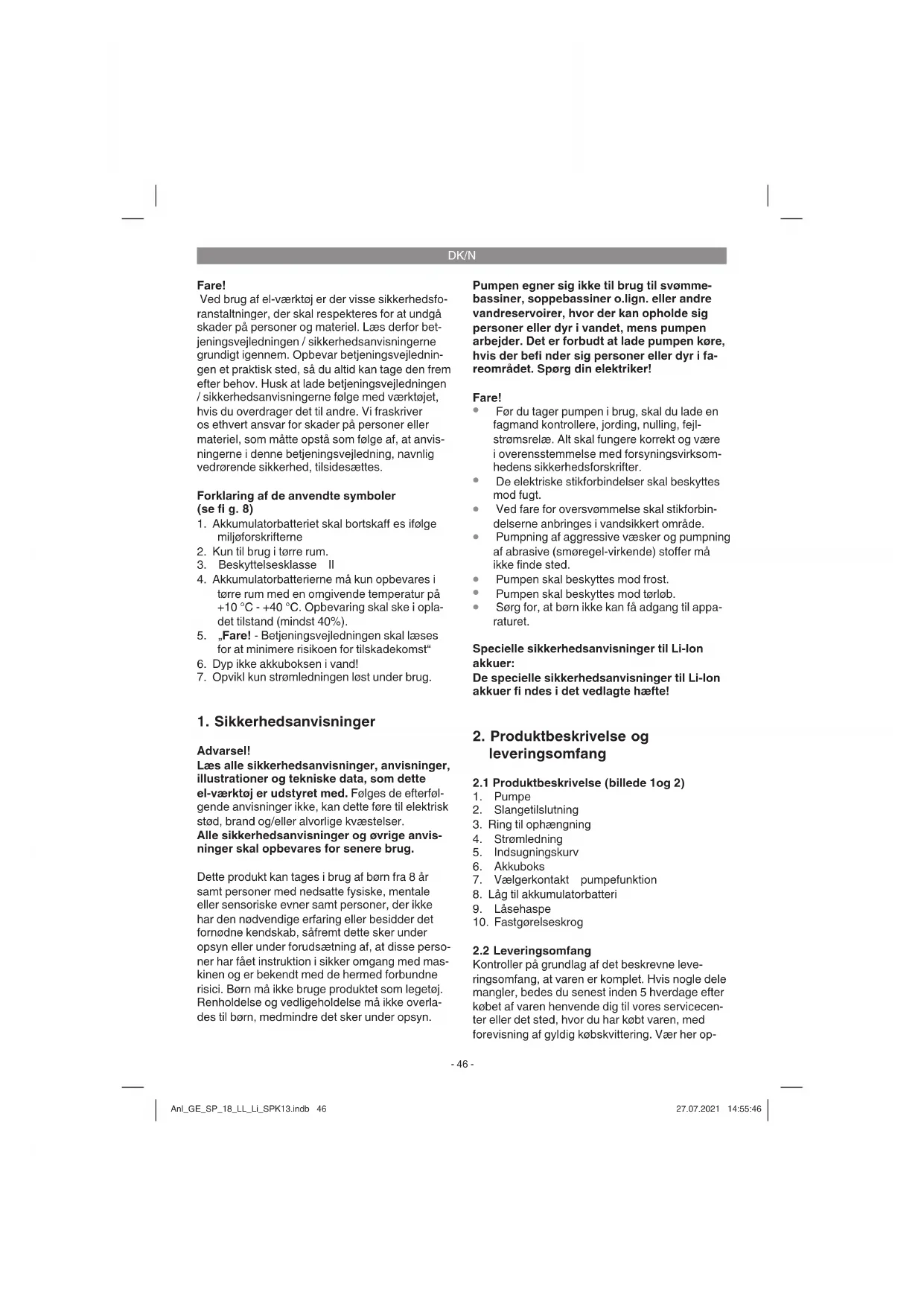 Kontroller på grundlag af det beskrevne leve- ringsomfang, at varen er komplet. Hvis nogle dele mangler, bedes du senest inden 5 hverdage efter købet af varen henvende dig til vores servicecen- ter eller det sted, hvor du har købt varen, med forevisning af gyldig købskvittering. Vær her op- Anl_GE_SP_18_LL_Li_SPK13.indb 46Anl_GE_SP_18_LL_Li_SPK13.indb 46 27.07.2021 14:55:4627.07.2021 14:55:46DK/N