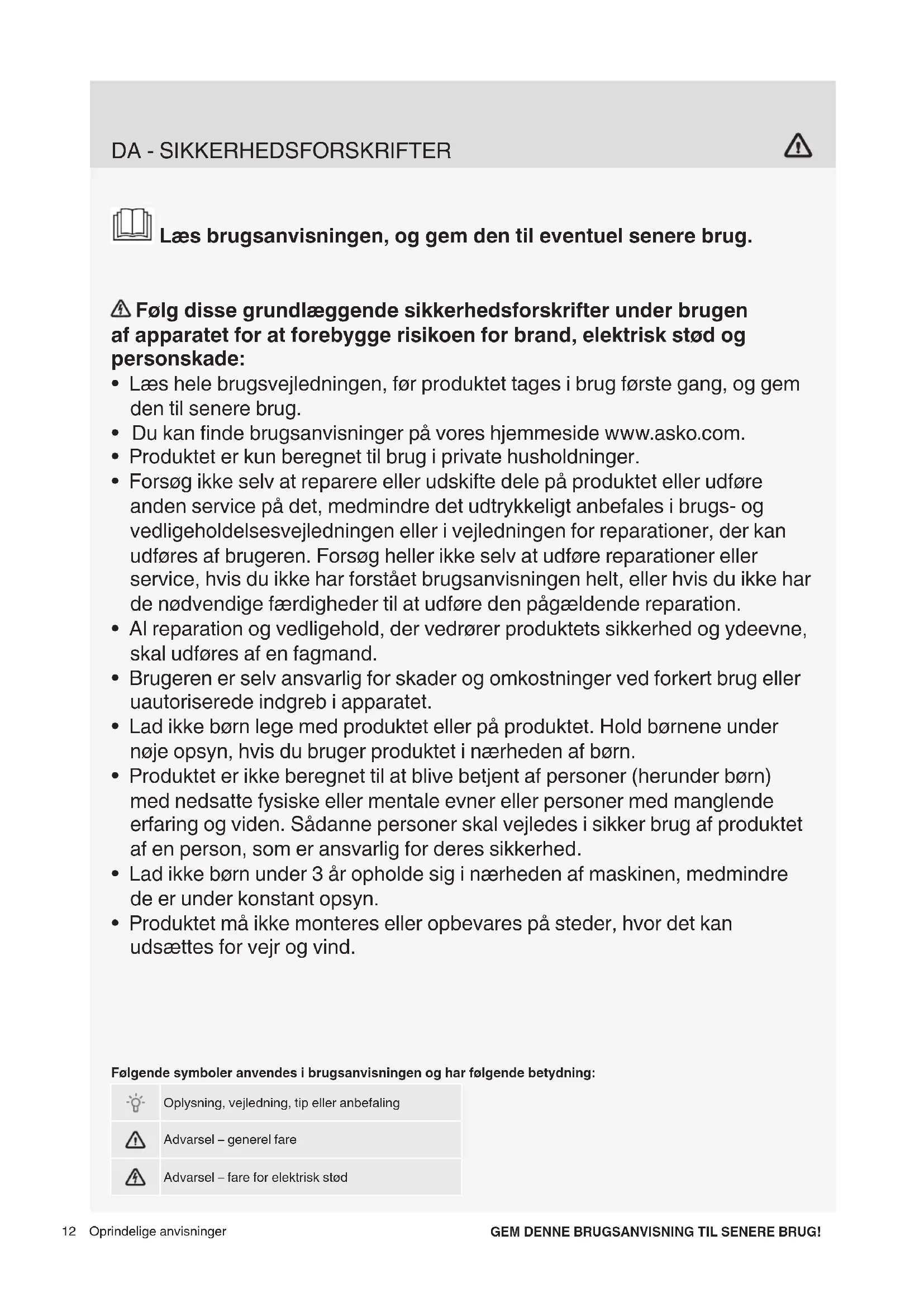 - Produktet må ikke monteres eller opbevares på steder, hvor det kan udsættes for vejr og vind. GEM DENNE BRUGSANVISNING TIL SENERE BRUG! Følgende symboler anvendes i brugsanvisningen og har følgende betydning: Oplysning, vejledning, tip eller anbefaling Advarsel – generel fare Advarsel – fare for elektrisk stød13 Sokkelskuffen må kun bruges sammen med en vaskemaskine og en tørretumbler fra fabrikanten Asko Appliances.