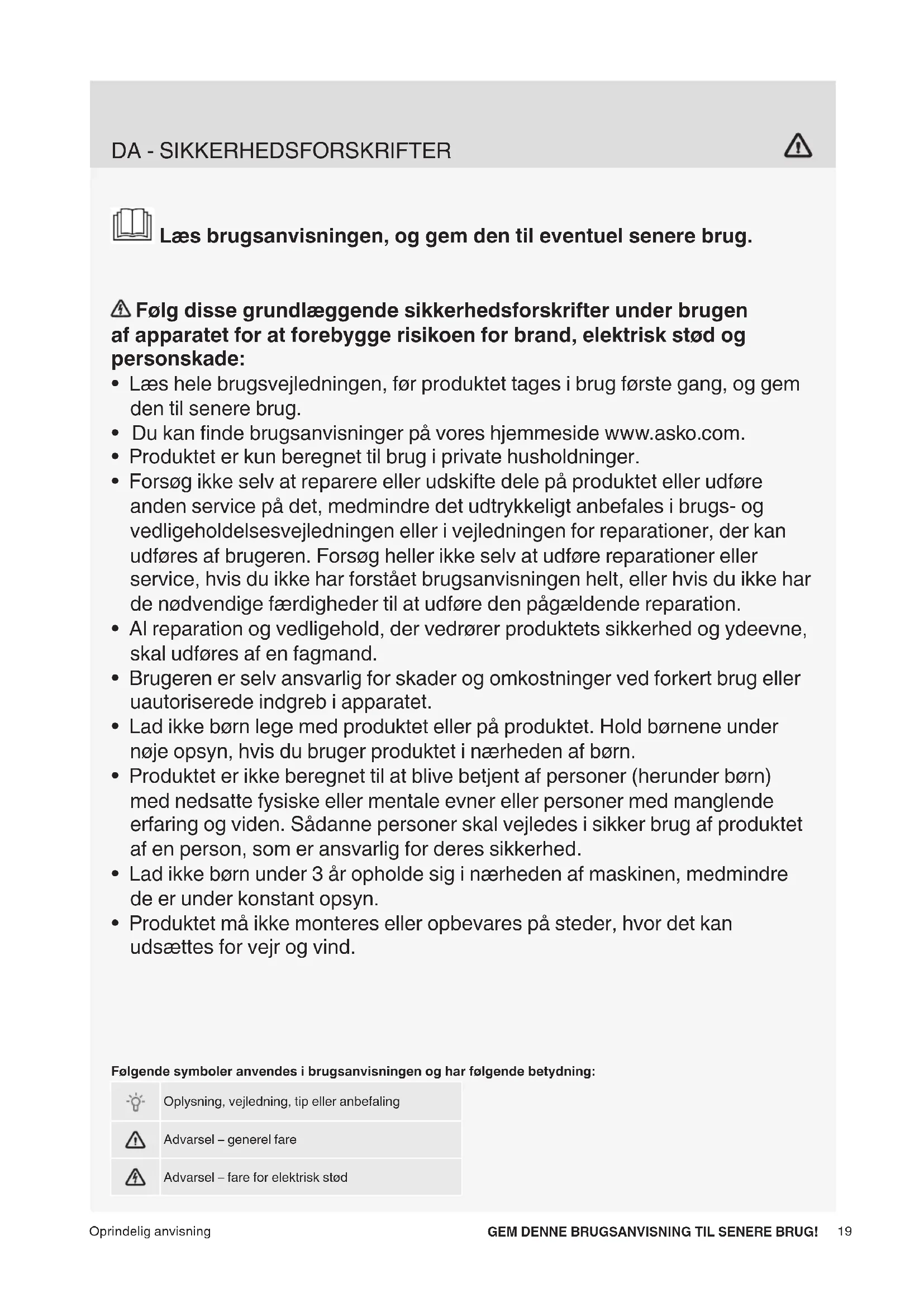 - Du kan fi nde brugsanvisninger på vores hjemmeside www.asko.com.