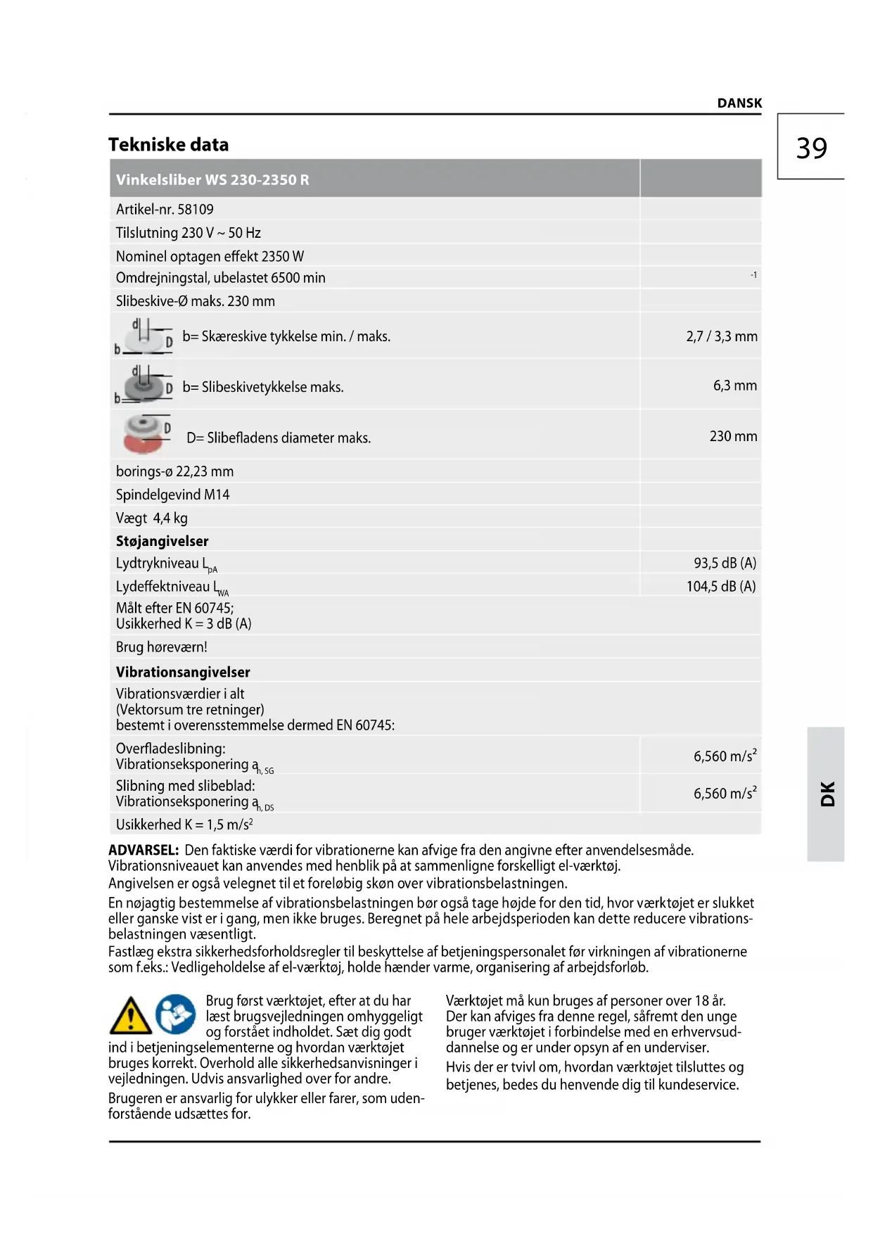 Slibeskive-Ø maks. 230 mm b= Skæreskive tykkelse min. / maks. 2,7 / 3,3 mm b= Slibeskivetykkelse maks. 6,3 mm D= Slibeadens diameter maks. 230 mm borings-ø 22,23 mm Spindelgevind M14 Vægt 4,4 kg Støjangivelser Lydtrykniveau L