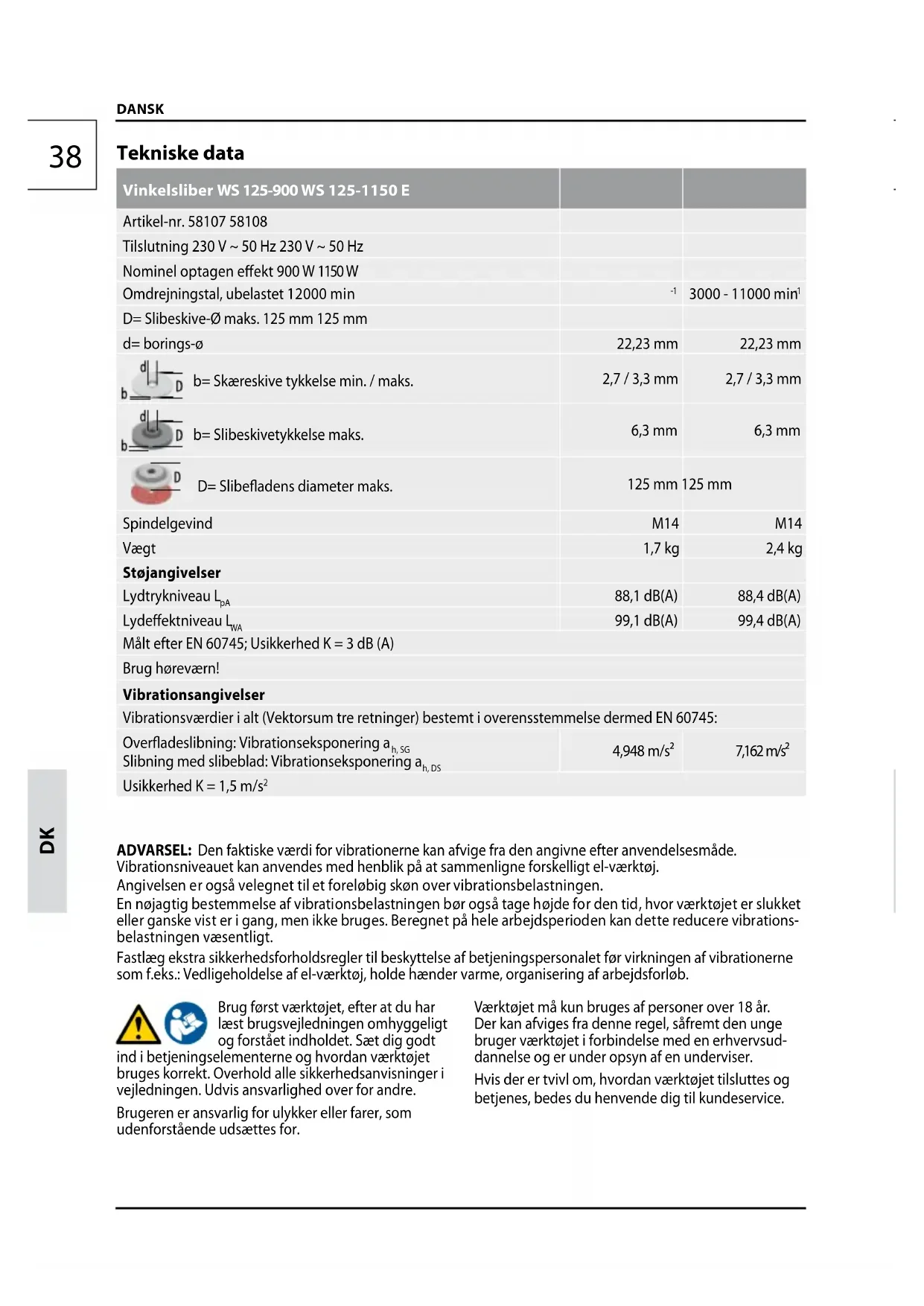 ADVARSEL: Den faktiske værdi for vibrationerne kan afvige fra den angivne efter anvendelsesmåde. Vibrationsniveauet kan anvendes med henblik på at sammenligne forskelligt el-værktøj. Angivelsen er også velegnet til et foreløbig skøn over vibrationsbelastningen. En nøjagtig bestemmelse af vibrationsbelastningen bør også tage højde for den tid, hvor værktøjet er slukket eller ganske vist er i gang, men ikke bruges. Beregnet på hele arbejdsperioden kan dette reducere vibrations- belastningen væsentligt. Fastlæg ekstra sikkerhedsforholdsregler til beskyttelse af betjeningspersonalet før virkningen af vibrationerne som f.eks.: Vedligeholdelse af el-værktøj, holde hænder varme, organisering af arbejdsforløb. Brug først værktøjet, efter at du har læst brugsvejledningen omhyggeligt og forstået indholdet. Sæt dig godt ind i betjeningselementerne og hvordan værktøjet bruges korrekt. Overhold alle sikkerhedsanvisninger i vejledningen. Udvis ansvarlighed over for andre. Brugeren er ansvarlig for ulykker eller farer, som udenforstående udsættes for. Værktøjet må kun bruges af personer over 18 år. Der kan afviges fra denne regel, såfremt den unge bruger værktøjet i forbindelse med en erhvervsud- dannelse og er under opsyn af en underviser. Hvis der er tvivl om, hvordan værktøjet tilsluttes og betjenes, bedes du henvende dig til kundeservice.D